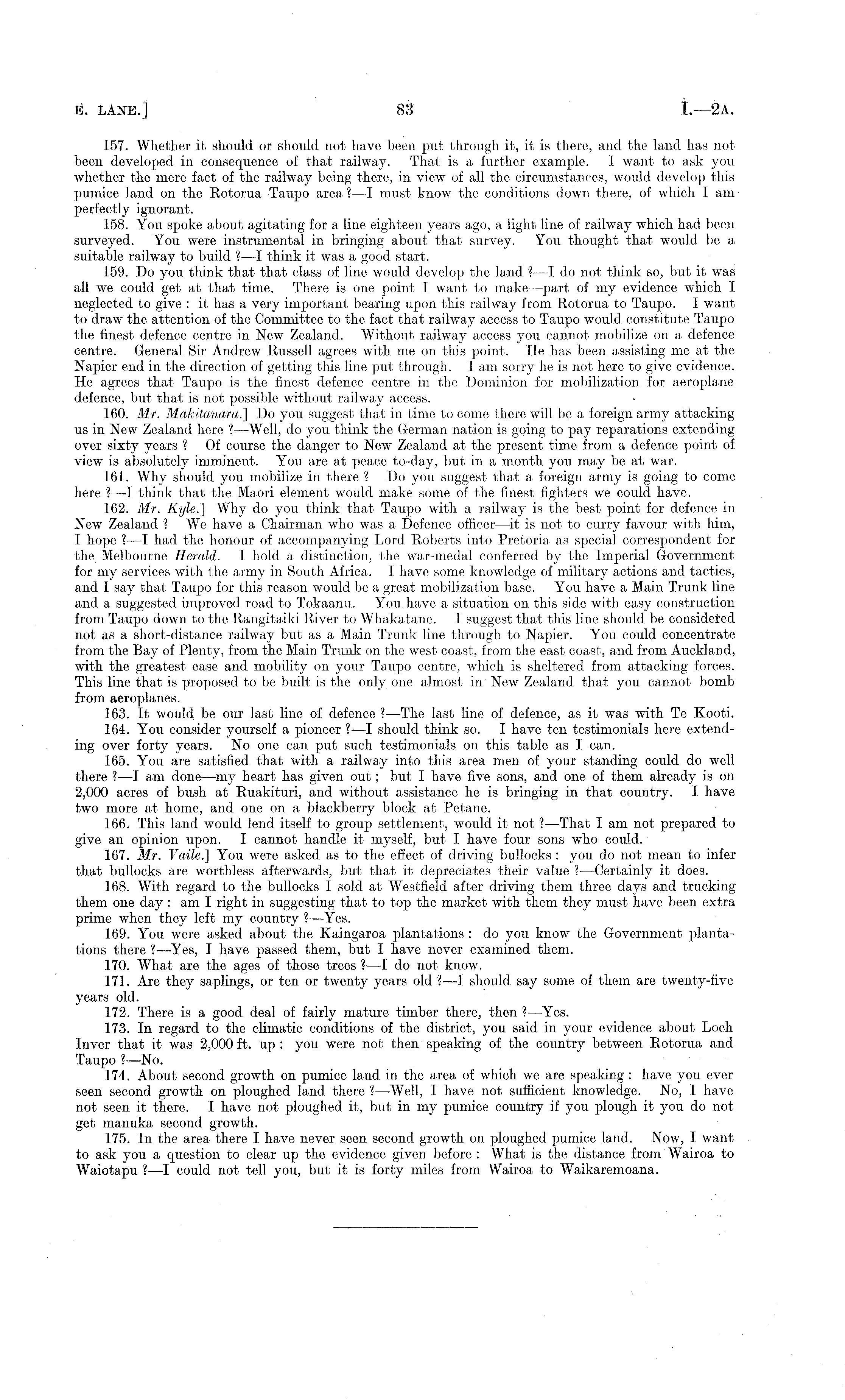157. Whether it should or should not have been put through it, it is there, and the land has not been developed in consequence of that railway. That is a further example. I want to ask you whether the mere fact of the railway being there, in view of all the circumstances, would develop this pumice land on the Rotorua-Taupo area ?—1 must know the conditions down there, of which lam perfectly ignorant. 158. You spoke about agitating for a line eighteen years ago, a light line of railway which had been surveyed. You were instrumental in bringing about that survey. You thought that would be a suitable railway to build ? —I think it was a good start. 159. Do you think that that class of line would develop the land I—l1 —I do not think so, but it was all we could get at that time. There is one point I want to make —part of my evidence which I neglected to give : it has a very important bearing upon this railway from Rotorua to Taupo. I want to draw the attention of the Committee to the fact that railway access to Taupo would constitute Taupo the finest defence centre in New Zealand. Without railway access you cannot mobilize on a defence centre. General Sir Andrew Russell agrees with me on this point. He has been assisting me at the Napier end in the direction of getting this line put through. lam sorry he is not here to give evidence. He agrees that Taupo is the finest defence centre in the Dominion for mobilization for aeroplane defence, but that is not possible without railway access. 160. Mr. Makitanara.] Do you suggest that in time to come there will be a foreign army attacking us in New Zealand here ?—Well, do you think the German nation is going to pay reparations extending over sixty years ? Of course the danger to New Zealand at the present time from a defence point of view is absolutely imminent. You are at peace to-day, but in a month you may be at war. 161. Why should you mobilize in there ? Do you suggest that a foreign army is going to come here ? —-I think that the Maori element would make some of the finest fighters we could have. 162. Mr. Kyle.] Why do you think that Taupo with a railway is the best point for defence in New Zealand ? We have a Chairman who was a Defence officer—it is not to curry favour with him, I hope ? —I had the honour of accompanying Lord Roberts into Pretoria as special correspondent for the Melbourne Herald. 1 hold a distinction, the war-medal conferred by the Imperial Government for my services with the army in South Africa. 1 have some knowledge of military actions and tactics, and I say that Taupo for this reason would be a great mobilization base. You have a Main Trunk line and a suggested improved road to Tokaanu. You. have a situation on this side with easy construction from Taupo down to the Rangitaiki River to Whakatane. I suggest that this line should be considered not as a short-distance railway but as a Main Trunk line through to Napier. You could concentrate from the Bay of Plenty, from the Main Trunk on the west coast, from the east coast, and from Auckland, with the greatest ease and mobility on your Taupo centre, which is sheltered from attacking forces. This line that is proposed to be built is the only one almost in New Zealand that you cannot bomb from aeroplanes. 163. It would be our last line of defence ?—The last line of defence, as it was with Te Kooti. 164. You consider yourself a pioneer ? —I should think so. I have ten testimonials here extending over forty years. No one can put such testimonials on this table as I can. 165. You are satisfied that with a railway into this area men of your standing could do well there ?—I am done —my heart has given out; but I have five sons, and one of them already is on 2,000 acres of bush at Ruakituri, and without assistance he is bringing in that country. I have two more at home, and one on a blackberry block at Petane. 166. This land would lend itself to group settlement, would it not ? —That I am not prepared to give an opinion upon. I cannot handle it myself, but I have four sons who could. 167. Mr. Vaile.] You were asked as to the effect of driving bullocks : you do not mean to infer that bullocks are worthless afterwards, but that it depreciates their value ? —Certainly it does. 168. With regard to the bullocks I sold at Westfield after driving them three days and trucking them one day : am I right in suggesting that to top the market with them they must have been extra prime when they left my country ? —Yes. 169. You were asked about the Kaingaroa plantations : do you know the Government plantations there ? —Yes, 1 have passed them, but I have never examined them. 170. What are the ages of those trees I—l do not know. 17]. Are they saplings, or ten or twenty years old ? —I should say some of them are twenty-five years old. 172. There is a good deal of fairly mature timber there, then ?—Yes. 173. In regard to the climatic conditions of the district, you said in your evidence about Loch Inver that it was 2,000 ft. up : you were not then speaking of the country between Rotorua and Taupo ? —No. 174. About second growth on pumice land in the area of which we are speaking : have you ever seen second growth on ploughed land there ? —Well, I have not sufficient knowledge. No, I have not seen it there. I have not ploughed it, but in my pumice country if you plough it you do not get manuka second growth. 175. In the area there I have never seen second growth on ploughed pumice land. Now, I want to ask you a question to clear up the evidence given before : What is the distance from Wairoa to Waiotapu ?—I could not tell you, but it is forty miles from Wairoa to Waikaremoana.