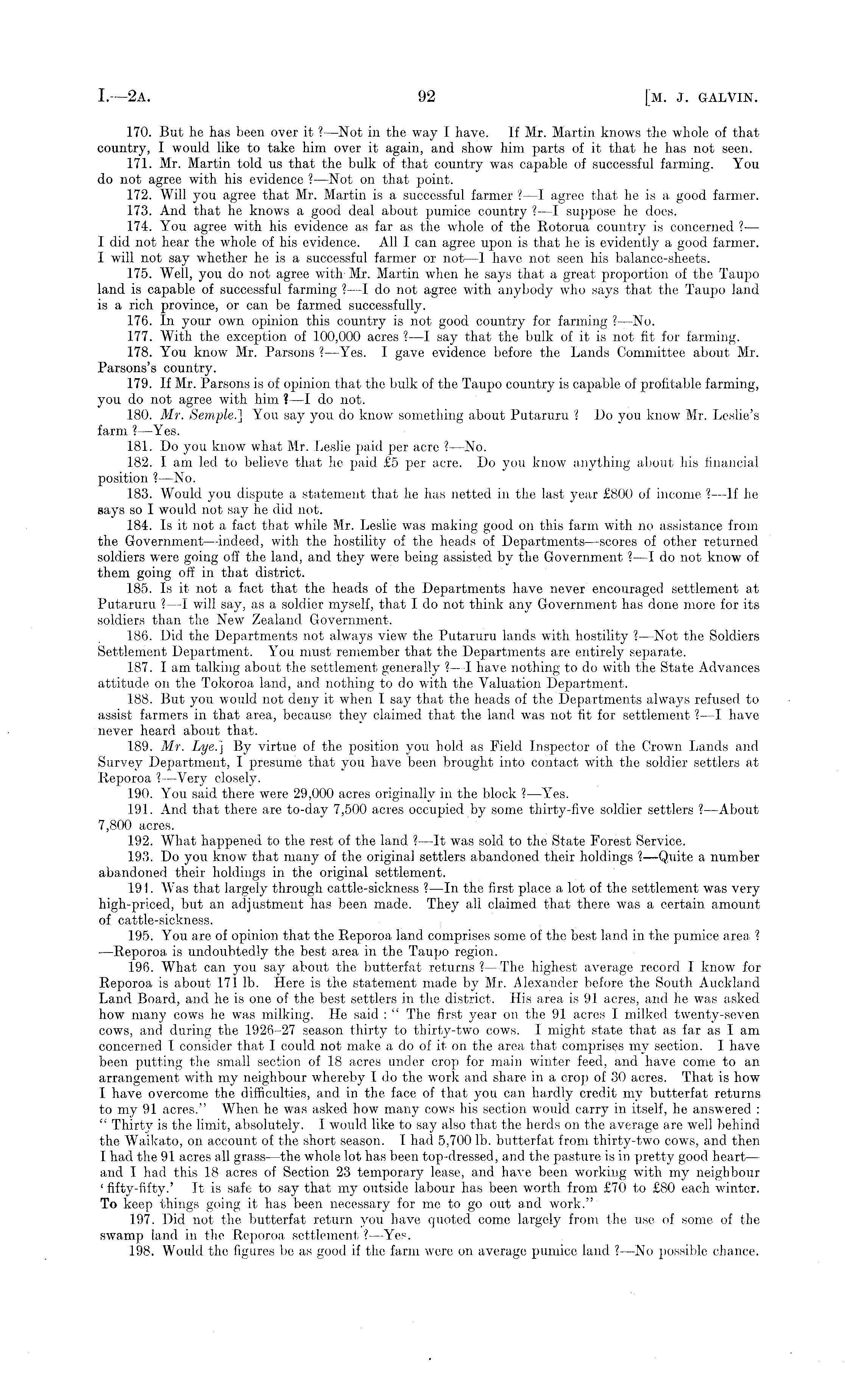 170. But he has been over it ?—Not in the way I have. If Mr. Martin knows the whole of that country, I would like to take him over it again, and show him parts of it that he has not seen. 171. Mr. Martin told us that the bulk of that country was capable of successful farming. You do not agree with his evidence ? —Not on that point. 172. Will you agree that Mr. Martin is a successful farmer ? —I agree that he is a good farmer. 173. And that he knows a good deal about pumice country ?—I suppose he does. 174. You agree with his evidence as far as the whole of the Rotorua country is concerned ? — I did not hear the whole of his evidence. All I can agree upon is that he is evidently a good farmer. I will not say whether he is a successful farmer or not —1 have not seen his balance-sheets. 175. Well, you do not agree with Mr. Martin when he says that a great proportion of the Taupo land is capable of successful farming ?—I do not agree with anybody who says that the Taupo land is a rich province, or can be farmed successfully. 176. In your own opinion this country is not good country for farming ? —No. 177. With the exception of 100,000 acres ? —I say that the bulk of it is not fit for farming. 178. You know Mr. Parsons ? —Yes. I gave evidence before the Lands Committee about Mr. Parsons's country. 179. If Mr. Parsons is of opinion that the bulk of the Taupo country is capable of profitable farming, you do not agree with him ? —I do not. 180. Mr. Semple.] You say you do know something about Putaruru ? Do you know Mr. Leslie's farm ?—Yes. 181. Do you know what Mr. Leslie paid per acre ? —No. 182. lam led to believe that he paid £5 per acre. Do you know anything about his financial position ? —No. 183. Would you dispute a statement that he has netted in the last year £800 of income ?—lf he says so I would not say he did not. 184. Is it not a fact that while Mr. Leslie was making good on this farm with no assistance from the Government —indeed, with the hostility of the heads of Departments —scores of other returned soldiers were going off the land, and they were being assisted by the Government ? —I do not know of them going off in that district. 185. Is it not a fact that the heads of the Departments have never encouraged settlement at Putaruru I—l1 —I will say, as a soldier myself, that Ido not think any Government has done more for its soldiers than the New Zealand. Government. 186. Did the Departments not always view the Putaruru lands with hostility ? —Not the Soldiers Settlement Department. You must remember that the Departments are entirely separate. 187. I am talking about the settlement generally ?—I have nothing to do with the State Advances attitude on the Tokoroa land, and nothing to do with the Valuation Department. 188. But you would not deny it when I say that the heads of the Departments always refused to assist farmers in that area, because they claimed that the land was not fit for settlement ? —I have never heard about that. 189. Mr. Lye.] By virtue of the position you hold as Field Inspector of the Crown Lands and Survey Department, I presume that you have been brought into contact with the soldier settlers at Reporoa ? —Very closely. 190. You said there were 29,000 acres originally in the block ?—Yes. 19]. And that there are to-day 7,500 acres occupied by some tliirty-five soldier settlers ? —About 7,800 acres. 192. What happened to the rest of the land ?—lt was sold to the State Forest Service. 193. Do you know that many of the original settlers abandoned their holdings I—Quite a number abandoned their holdings in the original settlement. 19!. Was that largely through cattle-sickness ? —ln the first place a lot of the settlement was very high-priced, but an adjustment has been made. They all claimed that there was a certain amount of cattle-sickness. 195. You are of opinion that the Reporoa land comprises some of the best land in the pumice area ? —Reporoa is undoubtedly the best area in the Taupo region. 196. What can you say about the butterfat returns ? —The highest average record I know for Reporoa is about 171 lb. Here is the statement made by Mr. Alexander before the South Auckland Land Board, and he is one of the best settlers in the district. His area is 91 acres, and he was asked how many cows he was milking. He said : " The first year on the 91 acres I milked twenty-seven cows, and during the 1926-27 season thirty to thirty-two cows. I might state that as far as I am concerned I consider that I could not make adoofit on the area that comprises my section. I have been putting the small section of 18 acres under crop for main winter feed, and have come to an arrangement with my neighbour whereby Ido the work and share in a crop of 30 acres. That is how I have overcome the difficulties, and in the face of that you can hardly credit my butterfat returns to my 91 acres." When he was asked how many cows his section would carry in itself, he answered : " Thirty is the limit, absolutely. I would like to say also that the herds on the average are well behind the Waikato, on account of the short season. I had 5,700 lb. butterfat from thirty-two cows, and then I had the 91 acres all grass—the whole lot has been top-dressed, and the pa.st.ure is in pretty good heart— and I had this 18 acres of Section 2-3 temporary lease, and have been working with my neighbour 'fifty-fifty.' It is safe to say that my outside labour has been worth from £70 to £80 each winter. To keep things going it has been necessary for me to go out and work." 197. Did not the butterfat return you have quoted come largely from the use of some of the swamp land in the Reporoa settlement ?—Yes. 198. Would the figures be as good if the farm were on average pumice land ? —No possible chance.