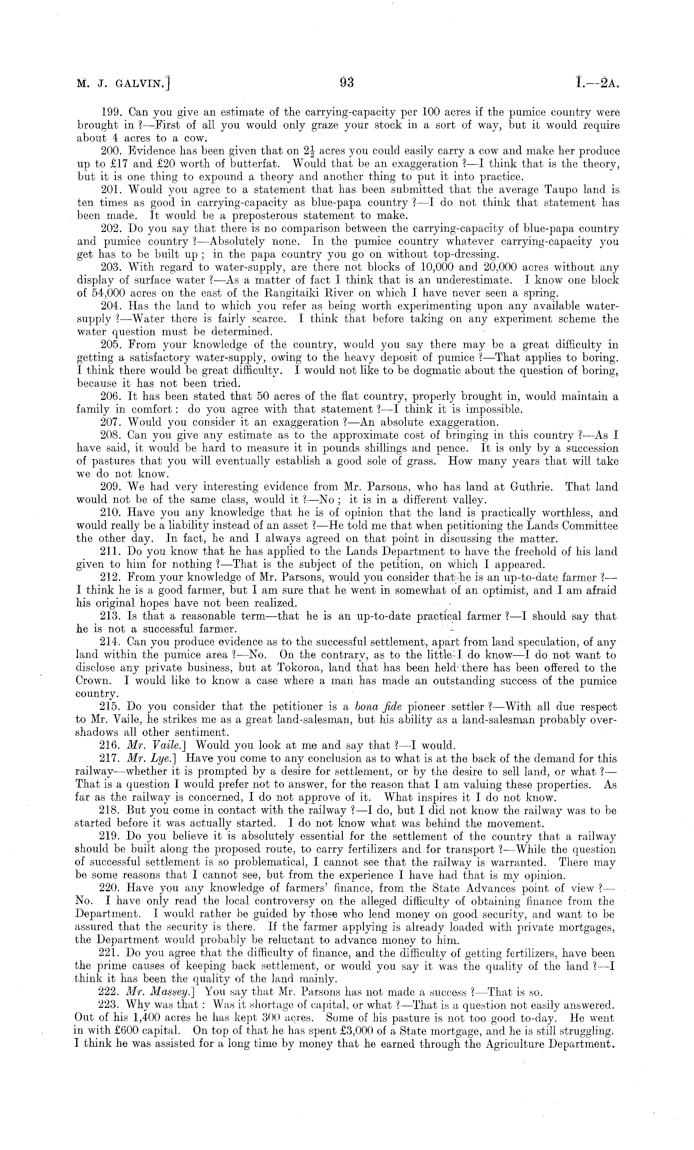 199. Can you give an estimate of the carrying-capacity per 100 acres if the pumice country were brought in ? —First of all you would only graze your stock in a sort of way, but it would require about 4 acres to a cow. 200. Evidence has been given that on 2| acres you could easily carry a cow and make her produce up to £17 and £20 worth of butterfat. Would that be an exaggeration ? —I think that is the theory, but it is one thing to expound a theory and another thing to put it into practice. 201. Would you agree to a statement that has been submitted that the average Taupo land is ten times as good in carrying-capacity as blue-papa country ? —I do not think that statement has been made. It would be a preposterous statement to make. 202. Do you say that there is no comparison between the carrying-capacity of blue-papa country and pumice country ?—Absolutely none. In the pumice country whatever carrying-capacity you get has to be built up ; in the papa country you go on without top-dressing. 203. With regard to water-supply, are there not blocks of 10,000 and 20,000 acres without any display of surface water ?—As a matter of fact I think that is an underestimate. I know one block of 54,000 acres on the east of the Rangitaiki River on which I have never seen a spring. 204. Has the land to which you refer as being worth experimenting upon any available watersupply ?—Water there is fairly scarce. I think that before taking on any experiment scheme the water question must be determined. 205. From your knowledge of the country, would you say there may be a great difficulty in getting a satisfactory water-supply, owing to the heavy deposit of pumice ?—That applies to boring. I think there would be great difficulty. I would not like to be dogmatic about the question of boring, because it has not been tried. 206. It has been stated that 50 acres of the flat country, properly brought in, would maintain a family in comfort: do you agree with that statement ? —I think it is impossible. 207. Would you consider it an exaggeration ?—An absolute exaggeration. 208. Can you give any estimate as to the approximate cost of bringing in this country ? —As I have said, it would be hard to measure it in pounds shillings and pence. It is only by a succession of pastures that you will eventually establish a good sole of grass. How many years that will take we do not know. 209. We had very interesting evidence from Mr. Parsons, wdio has land at Guthrie. That land would not be of the same class, would it ?—No ; it is in a different valley. 210. Have you any knowledge that he is of opinion that the land is practically worthless, and would really be a liability instead of an asset ?—He told me that when petitioning the Lands Committee the other day. In fact, he and I always agreed on that point in discussing the matter. 211. Do you know that he has applied to the Lands Department to have the freehold of his land given to him for nothing ?—That is the subject of the petition, on w'hich I appeared. 212. From your knowledge of Mr. Parsons, would you consider thafche is an up-to-date farmer ? — I think he is a good farmer, but I am sure that he went in somewhat of an optimist, and I am afraid his original hopes have not been realized. 213. Is that a reasonable term —that he is an up-to-date practical farmer ? —I should say that he is not a successful farmer. 214. Can you produce evidence as to the successful settlement, apart from land speculation, of any land within the pumice area ? —No. On the contrary, as to the little-1 do know —I do not want to disclose any private business, but at Tokoroa, land that has been held there has been offered to the Crown. I would like to know a case where a man has made an outstanding success of the pumice country. 215. Do you consider that the petitioner is a bona fide pioneer settler ? —With all due respect to Mr. Vaile, he strikes me as a great land-salesman, but his ability as a land-salesman probably overshadows all other sentiment. 216. Mr. Vaile.] Would you look at me and say that ? —I would. 217. Mr. Lye.\ Have you come to any conclusion as to what is at the back of the demand for this railway —whether it is prompted by a desire for settlement, or by the desire to sell land, or what ? — That is a question I would prefer not to answer, for the reason that lam valuing these properties. As far as the railway is concerned, Ido not approve of it. What inspires it Ido not know. 218. But you come in contact with the railway ?—I do, but I did not know the railway was to be started before it was actually started. Ido not know what was behind the movement. 219. Do you believe it is absolutely essential for the settlement of the country that a railway should be built along the proposed route, to carry fertilizers and for transport ? —While the question of successful settlement is so problematical, I cannot see that the railway is warranted. There may be some reasons that I cannot see, but from the experience I have had that is my opinion. 220. Have you any knowledge of farmers' finance, from the State Advances point of view ?— No. I have only read the local controversy on the alleged difficulty of obtaining finance from the Department. I would rather be guided by those who lend money on good security, and want to be assured that the security is there. If the farmer applying is already loaded with private mortgages, the Department would probably be reluctant to advance money to him. 221. Do you agree that the difficulty of finance, and the difficulty of getting fertilizers, have been the prime causes of keeping back settlement, or would you say it was the quality of the land ? —I think it has been the quality of the land mainly. 222. Mr. Massey.] You say that Mr. Parsons has not made a success ? —That is so. 223. Why was that : Was it shortage of capital, or what ? —That is a question not easily answered. Out of his 1,4-00 acres he has