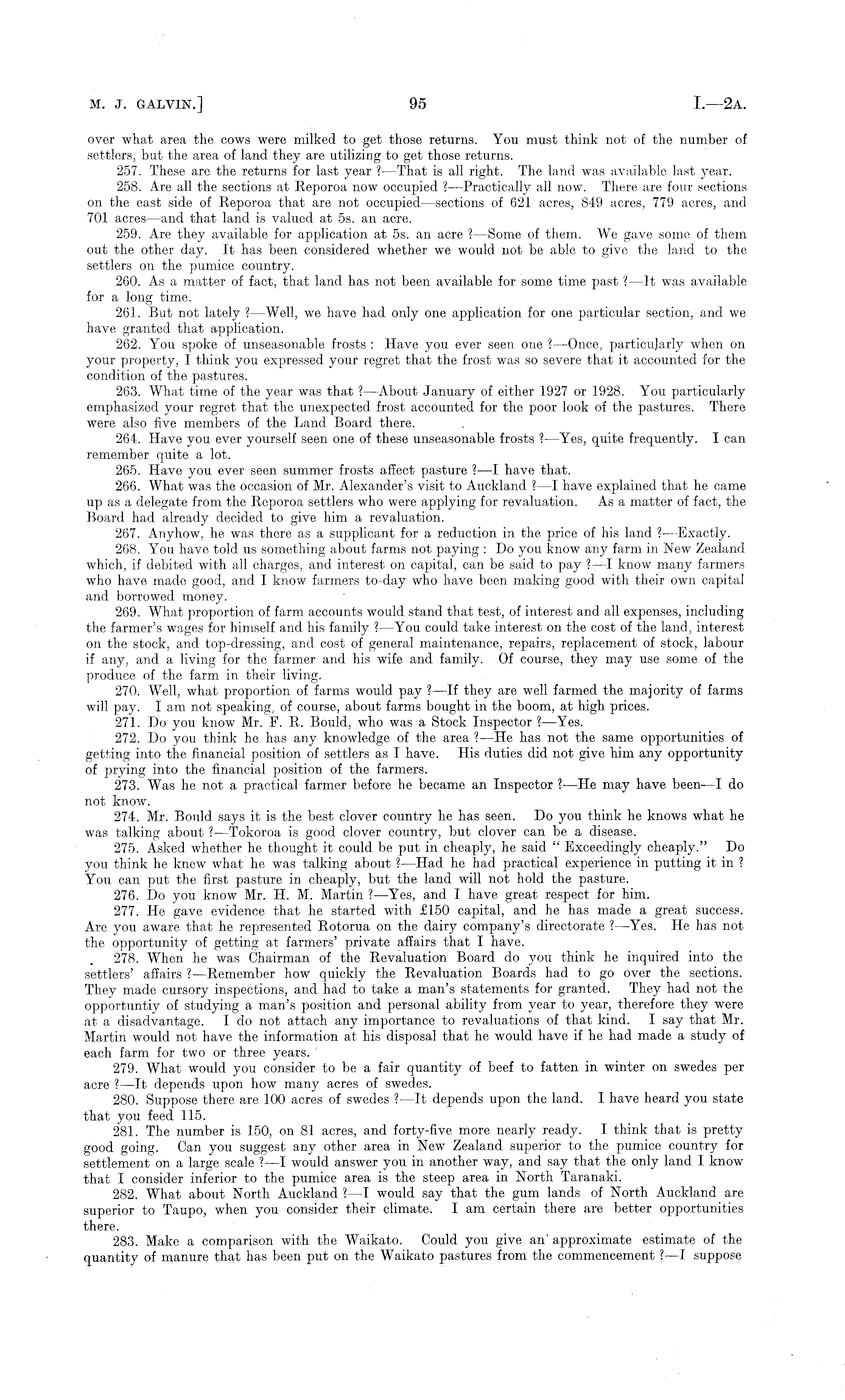 over what area the cows were milked to get those returns. You must think not of the number of settlers, but the area of land they are utilizing to get those returns. 257. These are the returns for last year ? —That is all right. The land was available last year. 258. Are all the sections at Reporoa now occupied ? —Practically all now. There are four sections on the east side of Reporoa that are not occupied—sections of 621 acres, 849 acres, 779 acres, and 701 acres —and that land is valued at ss. an acre. 259. Are they available for application at ss. an acre ? —Some of them. We gave some of them out the other day. It has been considered whether we would not be able to give the land to the settlers on the pumice country. 260. As a matter of fact, that land has not been available for some time past ? —lt was available for a long time. 261. But not lately ? —Well, we have had only one application for one particular section, and we have granted that application. 262. You spoke of unseasonable frosts : Have you ever seen one ? —Once, particularly when on your property, I think you expressed your regret that the frost was so severe that it accounted for the condition of the pastures. 263. What time of the year was that ?—About January of either 1927 or 1928. You particularly emphasized your regret that the unexpected frost accounted for the poor look of the pastures. There were also five members of the Land Board there. 264:. Have you ever yourself seen one of these unseasonable frosts ? —Yes, quite frequently. I can remember quite a lot. 265. Have you ever seen summer frosts affect pasture ?—I have that. 26,6. What was the occasion of Mr. Alexander's visit to Auckland ? —I have explained that he came up as a delegate from the Reporoa settlers who were applying for revaluation. As a matter of fact, the Board had already decided to give him a revaluation. 267. Anyhow, he was there as a supplicant for a reduction in the price of his land ? —Exactly. 268. You have told us something about farms not paying : Do you know any farm in New Zealand which, if debited with all charges, and interest on capital, can be said to pay ?—I know many farmers who have made good, and I know farmers to-day who have been making good with their own capital and borrowed money. 269. What proportion of farm accounts would stand that test, of interest and all expenses, including the farmer's wages for himself and his family ? —You could take interest on the cost of the land, interest on the stock, and top-dressing, and cost of general maintenance, repairs, replacement of stock, labour if any, and a living for the farmer and his wife and family. Of course, they may use some of the produce of the farm in their living. 270. Well, what proportion of farms would pay ? —lf they are well farmed the majority of farms will pay. lam not speaking, of course, about farms bought in the boom, at high prices. 271. Do you know Mr. F. R. Bould, who was a Stock Inspector %—Yes. 272. Do you think he has any knowledge of the area ?—He has not the same opportunities of getting into the financial position of settlers as I have. His duties did not give him any opportunity of prying into the financial position of the farmers. 273. Was he not a practical farmer before he became an Inspector ? —He may have been —I do not know. 274. Mr. Bould says it is the best clover country he has seen. Do you think he knows what he was talking about ? —Tokoroa is good clover country, but clover can be a disease. 275. Asked whether he thought it could be put in cheaply, he said " Exceedingly cheaply." Do you think he knew what he was talking about ?—Had he had practical experience in putting it in ? You can put the first pasture in cheaply, but the land will not hold the pasture. 276. Do you know Mr. H. M. Martin ?—Yes, and I have great respect for him. 277. He gave evidence that he started with £150 capital, ancl he has made a great success. Are you aware that he represented Rotorua on the dairy company's directorate ? —Yes. He has not the opportunity of getting at farmers' private affairs that I have. 278. When he was Chairman of the Revaluation Board do you think he inquired into the settlers' affairs ?—Remember how quickly the Revaluation Boards had to go over the sections. They made cursory inspections, and had to take a man's statements for granted. They had not the opportuntiy of studying a man's position and personal ability from year to year, therefore they were at a disadvantage. Ido not attach any importance to revaluations of that kind. I say that Mr. Martin would not have the information at his disposal that he would have if he had made a study of each farm for two or three years. 279. What would you consider to be a fair quantity of beef to fatten in winter on swedes per acre ?—lt depends upon how many acres of swedes. 280. Suppose there are 100 acres of swedes ? —lt depends upon the land. I have heard you state that you feed 115. 281. The number is 150, on 81 acres, and forty-five more nearly ready. I think that is pretty good going. Can you suggest any other area in New Zealand superior to the pumice country for settlement on a large scale ? —I would answer you in another way, and say that the only land I know that I consider inferior to the pumice area is the steep area in North Taranaki. 282. What about North Auckland ?—I would say that the gum lands of North Auckland are superior to Taupo, when you consider their climate. lam certain there are better opportunities there. 283. Make a comparison with the Waikato. Could you give an' approximate estimate of the quantity of manure that has been put on the Waikato pastures from the commencement ?—I suppose