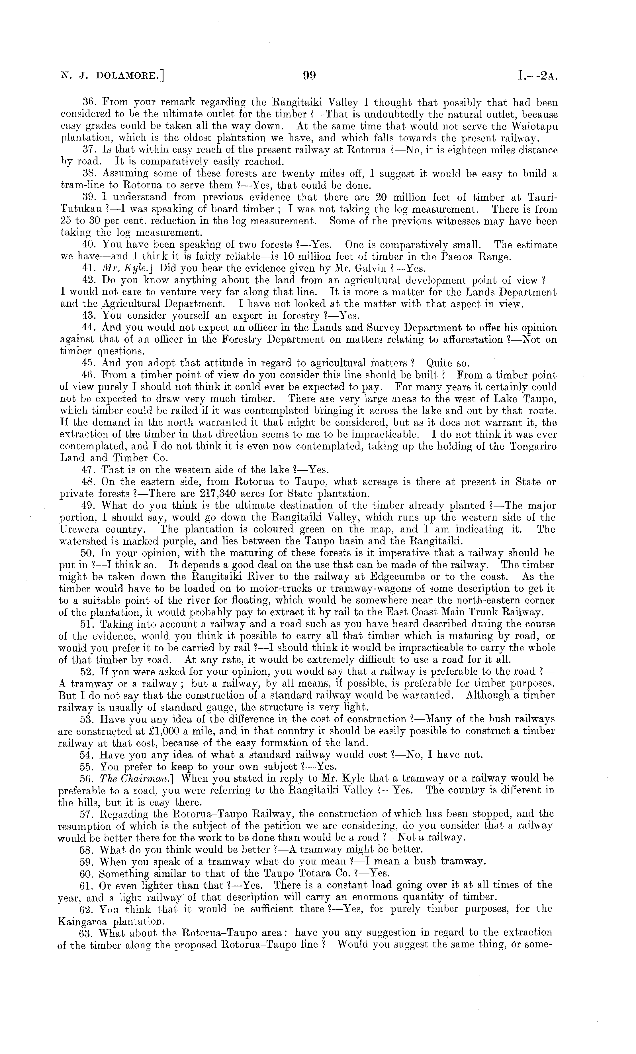 36. From your remark regarding the Rangitaiki Valley I thought that possibly that had been considered to be the ultimate outlet for the timber ? —That is undoubtedly the natural outlet, because easy grades could be taken all the way down. At the same time that would not serve the Waiotapu plantation, which is the oldest plantation we have, and which falls towards the present railway. 37. Is that within easy reach of the present railway at Rotorua ?—No, it is eighteen miles distance by road. It is comparatively easily reached. 38. Assuming some of these forests are twenty miles off, I suggest it would be easy to build a tram-line to Rotorua to serve them %—Yes, that could be done. 39. I understand from previous evidence that there are 20 million feet of timber at TauriTutukau ? —I was speaking of board timber ; I was not taking the log measurement. There is from 25 to 30 per cent, reduction in the log measurement. Some of the previous witnesses may have been taking the log measurement. 40. You have been speaking of two forests %—Yes. One is comparatively small. The estimate we have —and I think it is fairly reliable —is 10 million feet of timber in the Paeroa Range. 41. Mr. Kyle.'] Did you hear the evidence given by Mr. Galvin ?—Yes. 42. Do you know anything about the land from an agricultural development point of view ?— I would not care to venture very far along that line. It is more a matter for the Lands Department and the Agricultural Department. I have not looked at the matter with that aspect in view. 43. You consider yourself an expert in forestry ?—Yes. 44. And you would not expect an officer in the Lands and Survey Department to offer his opinion against that of an officer in the Forestry Department on matters relating to afforestation ?■ —Not on timber questions. 45. And you adopt that attitude in regard to agricultural matters ? —Quite so. 46. From a timber point of view do you consider this line should be built ?—From a timber point of view purely I should not think it could ever be expected to pay. For many years it certainly could not be expected to draw very much timber. There are very large areas to the west of Lake Taupo, which timber could be railed if it was contemplated bringing it across the lake and out by that route. If the demand in the north warranted it that might be considered, but as it does not warrant it, the extraction of the timber in that direction seems to me to be impracticable. Ido not think it was ever contemplated, and I do not think it is even now contemplated, taking up the holding of the Tongariro Land and Timber Co. 47. That is on the western side of the lake ? —Yes. 48. On the eastern side, from Rotorua to Taupo, what acreage is there at present in State or private forests ?—There are 217,340 acres for State plantation. 49. What do you think is the ultimate destination of the timber already planted ?—The major portion, I should say, would go down the Rangitaiki Valley, which runs up the western side of the IJrewera country. The plantation is coloured green on the map, and lam indicating it. The watershed is marked purple, and lies between the Taupo basin and the Rangitaiki. 50. In your opinion, with the maturing of these forests is it imperative that a railway should be put in ? —I think so. It depends a good deal on the use that can be made of the railway. The timber might be taken down the Rangitaiki River to the railway at Edgecumbe or to the coast. As the timber would have to be loaded on to motor-trucks or tramway-wagons of some description to get it to a suitable point of the river for floating, which would be somewhere near the north-eastern corner of the plantation, it would probably pay to extract it by rail to the East Coast Main Trunk Railway. 51. Taking into account a railway and a road such as you have heard described during the course of the evidence, would you think it possible to carry all that timber which is maturing by road, or would you prefer it to be carried by rail ? —I should think it would be impracticable to carry the whole of that timber by road. At any rate, it would be extremely difficult to use a road for it all. 52. If you were asked for your opinion, you would say that a railway is preferable to the road ? —• A tramway or a railway ; but a railway, by all means, if possible, is preferable for timber purposes. But Ido not say that the construction of a standard railway would be warranted. Although a timber railway is usually of standard gauge, the structure is very light. 53. Have you any idea of the difference in the cost of construction I—Many of the bush railways are constructed at £1,000 a mile, and in that country it should be easily possible to construct a timber railway at that cost, because of the easy formation of the land. 54. Have you any idea of what a standard railway would cost ?—No, I have not. 55. You prefer to keep to your own subject ? —Yes. 56. The Chairman.'] When you stated in reply to Mr. Kyle that a tramway or a railway would be preferable to a road, you were referring to the Rangitaiki Valley ? —Yes. The country is different in the hills, but it is easy there. 57. Regarding the Rotorua-Taupo Railway, the construction of which has been stopped, and the resumption of which is the subject of the petition we are considering, do you consider that a railway would be better there for the work to be done than would be a road ?—Not a railway. 58. What do you think would be better ?—A tramway might bo better. 59. When you speak of a tramway what do you mean ? —I mean a bush tramway. 60. Something similar to that of the Taupo Totara Co. ? —Yes. 61. Or even lighter than that I—Yes.1 —Yes. There is a constant load going over it at all times of the year, and a light railway of that description will carry an enormous quantity of timber. 62. You think that it would be sufficient there ? —Yes, for purely timber purposes, for the Kaingaroa plant