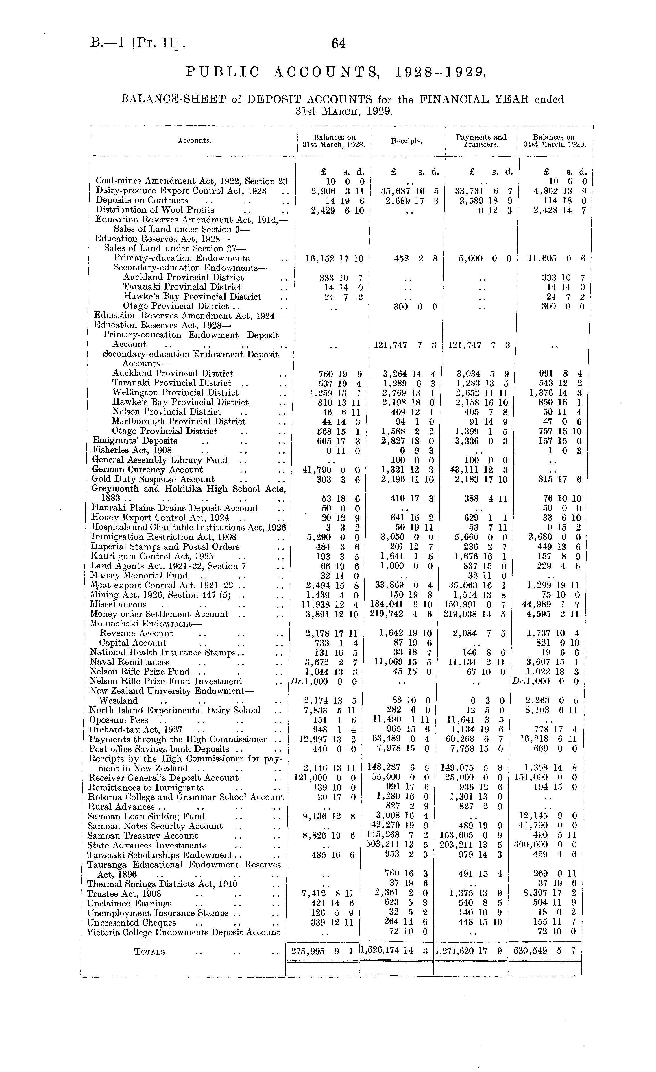 I " I I ~~ Accounts Balances on | i Payments and Balances on Accounts. 31st Marcl 1928i receipts. ! Transfers. 31st March, 1929. i I I £ a. d. £ s. d. £ s. d. | £ 8. d. Coal-mines Amendment Act, 1922, Section 23 10 0 0 .. .. 10 0 0 Dairy-produce Export Control Act, 1923 .. 2,906 3 11 35,687 16 5 33,731 6 7 4,862 13 9 Deposits on Contracts .. .. .. 14 19 6 2,689 17 3 2,589 18 9 114 18 0 Distribution of Wool Profits .. .. 2,429 6 10 .. 0 12 3 2,428 14 7 Education Reserves Amendment Act, 1914, — Sales of Land under Section 3— Education Reserves Act, 1928— Sales of Land under Section 27— Primary-education Endowments .. 16,152 17 10 452 2 8 5,000 0 0 11,605 0 6 Secondary-education Endowments— Auckland Provincial District .. 333 10 7 .. .. 333 10 7 Taranaki Provincial District .. { 14140 .. .. 14140 Hawke's Bay Provincial District .. 24 7 2 .. .. 24 7 2 Otago Provincial District .. .. .. 300 0 0 .. 300 0 0 Education Reserves Amendment Act, 1924— Education Reserves Act, 1928—• Primary-education Endowment Deposit Account .. .. .. .. j .. 121,747 7 3 121,747 7 3 Secondary-education Endowment Deposit ! Accounts— Auckland Provincial District .. 760 19 9 3,264 14 4 3,034 5 9 991 8 4 Taranaki Provincial District .. .. 537 19 4 1,289 6 3 1,283 13 5 543 12 2 Wellington Provincial District .. 1,259 13 1 , 2,769 13 1 2,652 11 11 1,376 14 3 Hawke's Bay Provincial District .. 810 13 11 j 2,198 18 0 2,158 16 10 850 15 1 Nelson Provincial District .. .. 46 6 11 409 12 1 405 7 8 50 11 4 Marlborough Provincial District .. 44 14 3 ; 94 1 0 91 14 9 47 0 6 Otago Provincial District .. .. 568 15 1 1,588 2 2 1,399 1 5 757 15 10 Emigrants'Deposits .. .. .. 665 17 3 2,827 18 0 3,336 0 3 157 15 0 Fisheries Act, 1908 .. .. .. 0110 093 .. 103 General Assembly Library Fund .. .. .. 100 0 0 100 0 0 German Currency Account .. .. 41,790 0 0 1,321 12 3 43,111 12 3 Gold Duty Suspense Account .. .. 303 3 6 2,196 11 10 2,183 17 10 315 17 6 Greymouth and Hokitika High School Acts, 1883 .. .. .. .. .. 53 18 6 410 17 3 388 4 11 76 10 10 Hauraki Plains Drains Deposit Account .. j 50 0 0 ■ ■ .. 50 0 0 I Honey Export Control Act, 1924 .. .. 20 12 9 641 15 2 629 1 1 33 6 10 Hospitals and Charitable Institutions Act, 1926 , 3 3 2 50 19 11 53 7 11 0 15 2 Immigration Restriction Act, 1908 .. j 5,290 0 0 3,050 0 0 5,660 0 0 2,680 0 0 [ Imperial Stamps and Postal Orders .. 484 3 6 201 12 7 236 2 7 449 13 6 Kauri-gum Control Act, 1925 .. .. 193 3 5 1,641 1 5 1,676 16 1 157 8 9 Land Agents Act, 1921-22, Section 7 .. 66 19 6 1,000 0 0 837 15 0 229 4 6 Massey Memorial Fund.. .. .. 32110 •• 32 110 Meat-export Control Act, 1921-22 .. .. 2,494 15 8 33,869 0 4 35,063 16 1 1,299 19 11 Mining Act, 1926, Section 447 (5) .. ..I 1,439 4 0 150 19 8 1,514 13 8 75 10 0 Miscellaneous .. .. .. .. 11,938 12 4 184,041 9 10 150,991 0 7 44,989 1 7 Money-order Settlement Account .. .. 3,891 12 10 219,742 4 6 219,038 14 5 4,595 2 11 Moumahaki Endowment— Revenue Account .. .. .. 2,178 17 11 1,642 19 10 2,084 7 5 1,737 10 4 Capital Account .. .. .. 733 1 4 87 19 6 .. 821 0 10 National Health Insurance Stamps.. .. 131 16 5 33 18 7 146 8 6 19 6 6 Naval Remittances .. .. .. 3,672 2 7 11,069 15 5 11,134 2 11 3,607 15 1 Nelson Rifle Prize Fund .. .. .. 1,044 13 3 45 15 0 67 10 0 1,022 18 3 Nelson Rifle Prize Fund Investment .. 2>r.l,000 0 0 .. .. -Dr.1,000 0 0 New Zealand University Endowment— Westland .. .. .. ..I 2,174 13 5 88 10 0 I 0 3 0 2,263 0 5 j North Island Experimental Dairy School .. 1 7,833 5 11 282 6 0 12 5 0 8,103 6 11 Opossum Fees .. .. .. .. 151 1 6 11,490 1 11 11,641 3 5 Orchard-tax Act, 1927 .. .. .. 948 1 4 965 15 6 1,134 19 6 778 17 4 Payments through the High Commissioner .. 12,997 13 2 63,489 0 4 60,268 6 7 16,218 6 11 Post-office Savings-bank Deposits .. .. 440 0 0 7,978 15 0 7,758 15 0 660 0 0 Receipts by the High Commissioner for payment in New Zealand .. .. .. 2,146 13 11 148,287 6 5 149,075 5 8 1,358 14 8 Receiver-General's Deposit Account .. 121,000 0 0 55,000 0 0 25,000 0 0 151,000 0 0 Remittances to Immigrants .. .. 139 10 0 991 17 6 936 12 6 194 15 0 Rotorua College and Grammar School Account 20 17 0 1,280 16 0 1,301 13 0 Rural Advances .. .. .. . . .. 827 2 9 827 2 9 Samoan Loan Sinking Fund .. .. 9,136 12 8 3,008 16 4 .. 12,145 9 0 Samoan Notes Security Account .. .. .. 42,279 19 9 489 19 9 41,790 0 0 Samoan Treasury Account .. .. 8,826 19 6 145,268 7 2 153,605 0 9 490 5 11 State Advances Investments .. .. .. 503,211 13 5 203,211 13 5 300,000 0 0 Taranaki Scholarships Endowment.. .. 485 16 6 953 2 3 979 14 3 459 4 6 Tauranga Educational Endowment Reserves Act, 1896 .. .. . . .. .. 760 16 3 491 15 4 269 0 11 Thermal Springs Districts Act, 1910 .. .. 37 19 6 .. 37 19 6 Trustee Act, 1908 .. .. .. 7,412 8 11 2,361 2 0 1,375 13 9 8,397 17 2 Unclaimed Earnings .. .. .. 421 14 6 623 5 8 540 8 5 504 11 9 Unemployment Insurance Stamps .. .. 126 5 9 32 5 2 140 10 9 18 0 2 Unpresented Cheques .. .. .. 339 12 11 264 14 6 448 15 10 155 11 7 Victoria College Endowments Deposit Account .. 72 10 0 .. 72 10 0 Totals .. .. .. 275,995 9 1 1,626,174 14 3 1,271,620 17 9 630,549 5 7