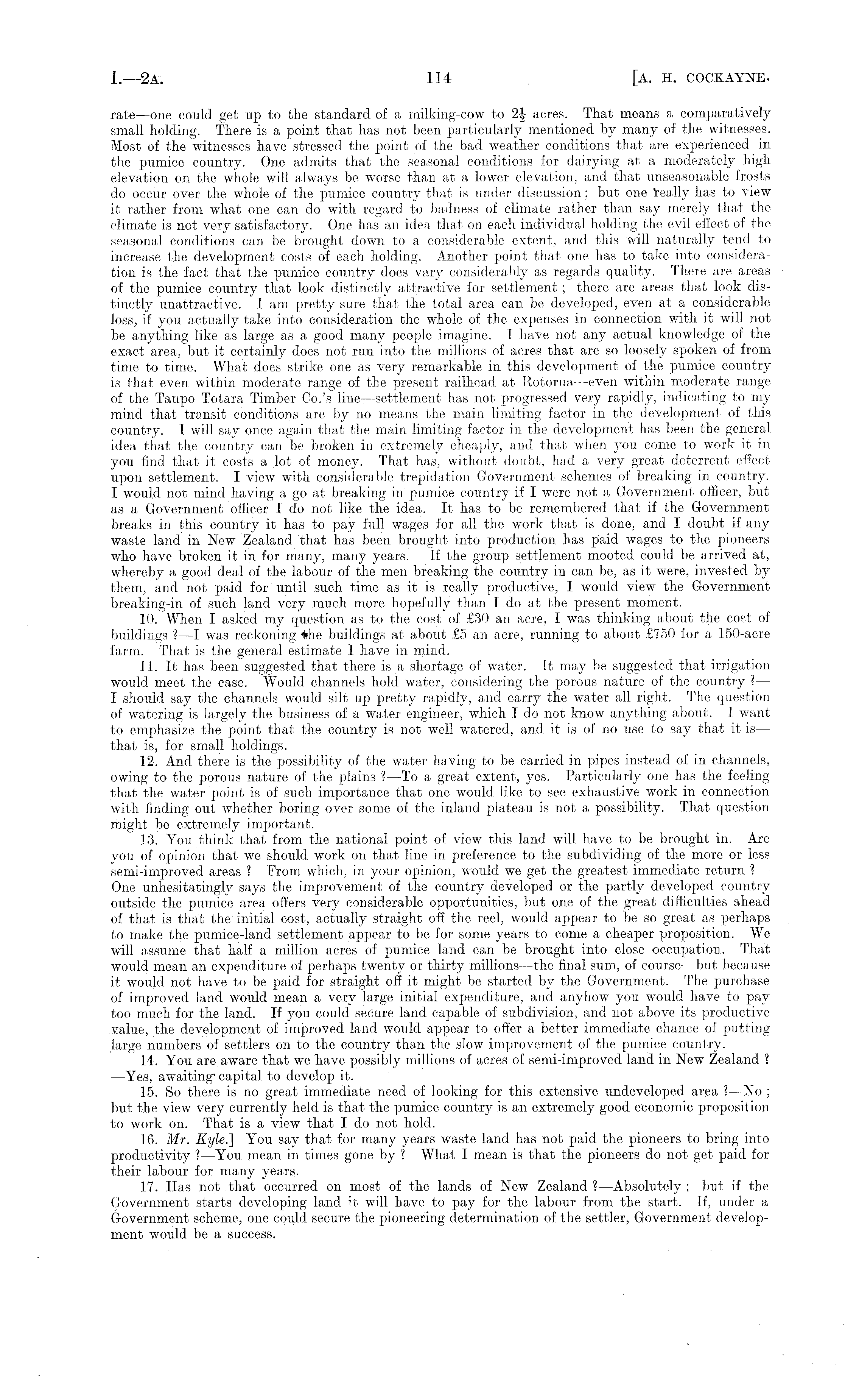 rate—one could get up to the standard of a milking-cow to 2| acres. That means a comparatively small holding. There is a point that has not been particularly mentioned by many of the witnesses. Most of the witnesses have stressed the point of the bad weather conditions that are experienced in the pumice country. One admits that the seasonal conditions for dairying at a moderately high elevation on the whole will always be worse than at a lower elevation, and that unseasonable frosts do occur over the whole of the pumice country that is under discussion; but one "really has to view it rather from what one can do with regard to badness of climate rather than say merely that the climate is not very satisfactory. One has an idea that on each individual holding the evil effect of the seasonal conditions can be brought down to a considerable extent, and this will naturally tend to increase the development costs of each holding. Another point that one has to take into consideration is the fact that the pumice country does vary considerably as regards quality. There are areas of the pumice country that look distinctly attractive for settlement ; there are areas that look distinctly unattractive. lam pretty sure that the total area can be developed, even at a considerable loss, if you actually take into consideration the whole of the expenses in connection with it will not be anything like as large as a good many people imagine. I have not any actual knowledge of the exact area, but it certainly does not run into the millions of acres that are so loosely spoken of from time to time. What does strike one as very remarkable in this development of the pumice country is that even within moderate range of the present railhead at Rotorua—even within moderate range of the Taupo Totara Timber Co.'s line —settlement has not progressed very rapidly, indicating to my mind that transit conditions are by no means the main limiting factor in the development of this country. I will say once again that the main limiting factor in the development has been the general idea, that the country can be broken in extremely cheaply, and that when you come to work it in you find that it costs a lot of money. That has, without doubt, had a very great deterrent effect upon settlement. I view with considerable trepidation Government schemes of breaking in country. I would not mind having a go at breaking in pumice country if I were not a Government officer, but as a Government officer I do not like the idea. It has to be remembered that if the Government breaks in this country it has to pay full wages for all the work that is done, and 1 doubt if any waste land in New Zealand that has been brought into production has paid wages to the pioneers who have broken it in for many, many years. If the group settlement mooted could be arrived at, whereby a good deal of the labour of the men breaking the country in can be, as it were, invested by them, and not paid for until such time as it is really productive, I would view the Government breaking-in of such land very much more hopefully than I do at the present moment. 10. When I asked my question as to the cost of £30 an acre, I was thinking about the cost of buildings ? —I was reckoning ihe buildings at about £5 an acre, running to about £750 for a 150-acre farm. That is the general estimate I have in mind. 11. It has been suggested that there is a shortage of water. It may be suggested that irrigation would meet the case. Would channels hold water, considering the porous nature of the country ? — I should say the channels would silt up pretty rapidly, and carry the water all right. The question of watering is largely the business of a water engineer, which Tdo not know anything about. I want to emphasize the point that the country is not well watered, and it is of no use to say that it is— that is, for small holdings. 12. And there is the possibility of the water having to be carried in pipes instead of in channels, owing to the porous nature of the plains ?—To a great extent, yes. Particularly one has the feeling that the water point is of such importance that one would like to see exhaustive work in connection with finding out whether boring over some of the inland plateau is not a possibility. That question might be extremely important. 13. You think that from the national point of view this land will have to be brought in. Are you of opinion that we should work on that line in preference to the subdividing of the more or less semi-improved area,s ? From which, in your opinion, would we get the greatest immediate return ? — One unhesitatingly says the improvement of the country developed or the partly developed country outside the pumice area offers very considerable opportunities, but one of the great difficulties ahead of that is that the initial cost, actually straight off the reel, would appear to be so great as perhaps to make the pumice-land settlement appear to be for some years to come a cheaper proposition. We will assume that half a million acres of pumice land can be brought into close occupation. That would mean an expenditure of perhaps twenty or thirty millions —the final sum, of course —but because it would not have to be paid for straight of! it might be started by the Government. The purchase of improved land would mean a very large initial expenditure, and anyhow you would have to pay too much for the land. If you could secure land capable of subdivision, and not above its productive value, the development of improved land would appear to offer a better immediate chance of putting large numbers of settlers on to the country tha,n the slow improvement of the pumice country. 14. You are aware that we have possibly millions of acres of semi-improved land in New Zealand ? —Yes, awaiting - capital to develop it. 15. So there is no great immediate need of looking for this extensive undeveloped area ? —No ; but the view very currently held