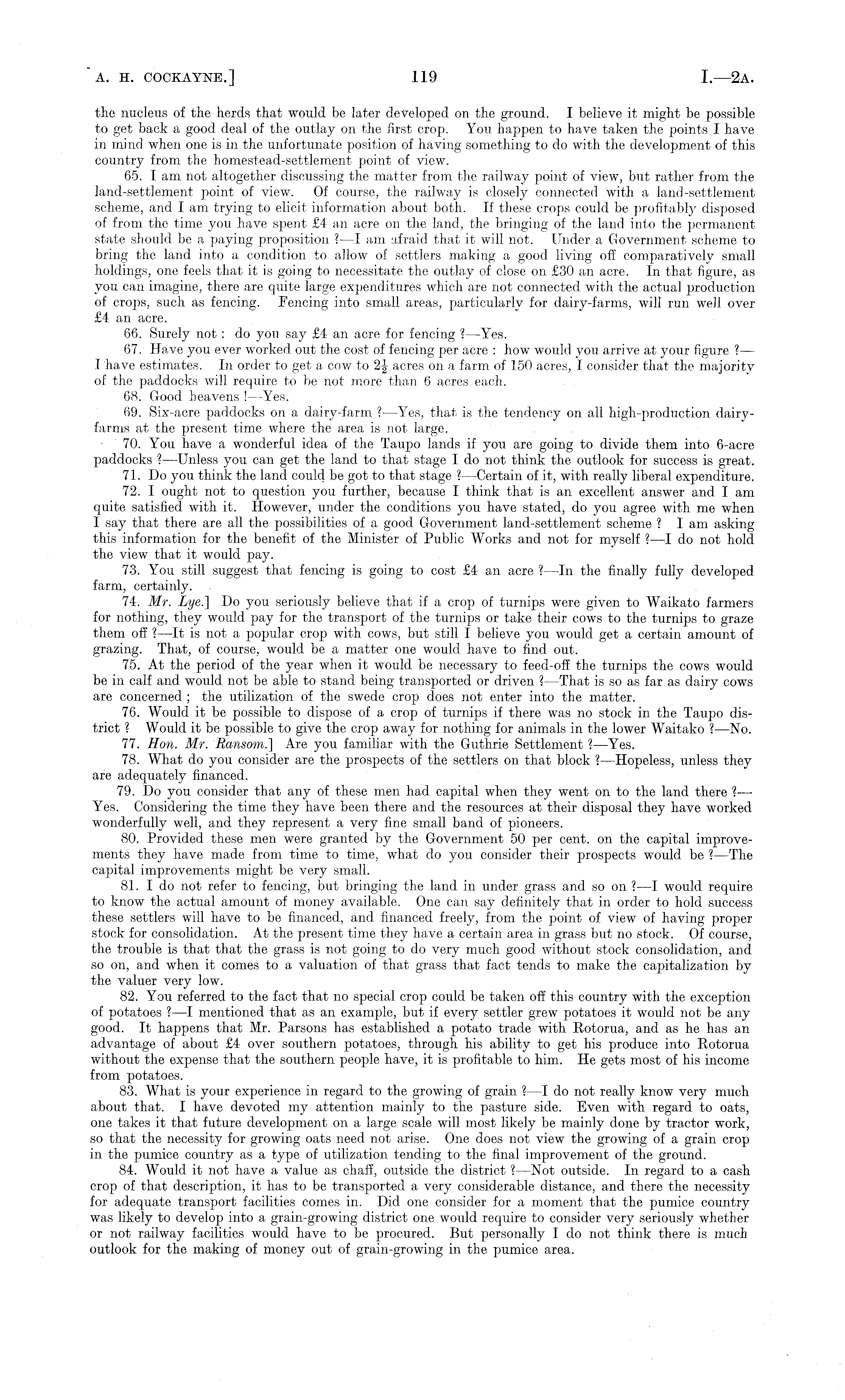 the nucleus of the herds that would be later developed on the ground. T believe it might be possible to get back a good deal of the outlay on the first crop. You happen to have taken the points I have in mind when one is in the unfortunate position of having something to do with the development of this country from the homestead-settlement point of view. 65. I am not altogether discussing the matter from the railway point of view, but rather from the land-settlement point of view. Of course, the railway is closely connected with a land-settlement scheme, and lam trying to elicit information about both. If these crops could be profitably disposed of from the time you have spent £4 an acre on the land, the bringing of the land into the permanent state should be a paying proposition ? —I am afraid that it will not. Under a Government scheme to bring the land into a condition to allow of settlers making a good living off comparatively small holdings, one feels that it is going to necessitate the outlay of close on £30 an acre. In that figure, as you can imagine, there are quite large expenditures which are not connected with the actual production of crops, such as fencing. Fencing into small areas, particularly for dairy-farms, will run well over £4 an acre. 66. Surely not : do you say £4 an acre for fencing ? —Yes. 67. Have you ever worked out the cost of fencing per acre : how would you arrive at your figure ?— I have estimates. In order to get a cow to 2J acres on a farm of 150 acres, I consider that the majority of the paddocks will require to be not more than 6 acres each. 68. Good heavens ! —Yes. 69. Six-acre paddocks on a dairy-farm ? —Yes, that is the tendency on all high-production dairyfarms at the present time where the area is not large. 70. You have a wonderful idea of the Taupo lands if you are going to divide them into 6-acre paddocks ? —Unless you can get the land to that stage I do not think the outlook for success is great. 71. Do you think the land could be got to that stage ? —Certain of it, with really liberal expenditure. 72. I ought not to question you further, because I think that is an excellent answer and I am quite satisfied with it. However, under the conditions you have stated, do you agree with me when I say that there are all the possibilities of a good Government land-settlement scheme ? lam asking this information for the benefit of the Minister of Public Works and not for myself ?—I do not hold the view that it would pay. 73. You still suggest that fencing is going to cost £4 an acre \ —ln the finally fully developed farm, certainly. 74. Mr. Lye.] Do you seriously believe that if a crop of turnips were given to Waikato farmers for nothing, they would pay for the transport of the turnips or take their cows to the turnips to graze them off ?—lt is not a popular crop with cows, but still I believe you would get a certain amount of grazing. That, of course, would be a matter one would have to find out. 75. At the period of the year when it would be necessary to feed-off the turnips the cows would be in calf and would not be able to stand being transported or driven I—That1 —That is so as far as dairy cows are concerned ; the utilization of the swede crop does not enter into the matter. 76. Would it be possible to dispose of a crop of turnips if there was no stock in the Taupo district ? Would it be possible to give the crop away for nothing for animals in the lower Waitako ? —No. 77. Hon. Mr. Ransom.] Are you familiar with the Guthrie Settlement ?—Yes. 78. What do you consider are the prospects of the settlers on that block ? —Hopeless, unless they are adequately financed. 79. Do you consider that any of these men had capital when they went on to the land there ? — Yes. Considering the time they have been there and the resources at their disposal they have worked wonderfully well, and they represent a very fine small band of pioneers. 80. Provided these men were granted by the Government 50 per cent, on the capital improvements they have made from time to time, what do you consider their prospects would be ? —The capital improvements might be very small. 81. Ido not refer to fencing, but bringing the land in under grass and so on ? —I would require to know the actual amount of money available. One can say definitely that in order to hold success these settlers will have to be financed, and financed freely, from the point of view of having proper stock for consolidation. At the present time they have a certain area in grass but no stock. Of course, the trouble is that that the grass is not going to do very much good without stock consolidation, and so on, and when it comes to a valuation of that grass that fact tends to make the capitalization by the valuer very low. 82. You referred to the fact that no special crop could be taken off this country with the exception of potatoes ? —I mentioned that as an example, but if every settler grew potatoes it would not be any good. It happens that Mr. Parsons has established a potato trade with Rotorua, and as he has an advantage of about £4 over southern potatoes, through his ability to get his produce into Rotorua without the expense that the southern people have, it is profitable to him. He gets most of his income from potatoes. 83. What is your experience in regard to the growing of grain ? —I do not really know very much about that. I have devoted my attention mainly to the pasture side. Even with regard to oats, one takes it that future development on a large scale will most likely be mainly done by tractor work, so that the necessity for growing oats need not arise. One does not view the growing of a grain crop in the pumice country as a type of utilization tending to the final improvement of the ground. 84. Would it not have a value as chaff, outside the district ? —Not outside. In regard to a cash crop of that description, it has to be transported a very considerable