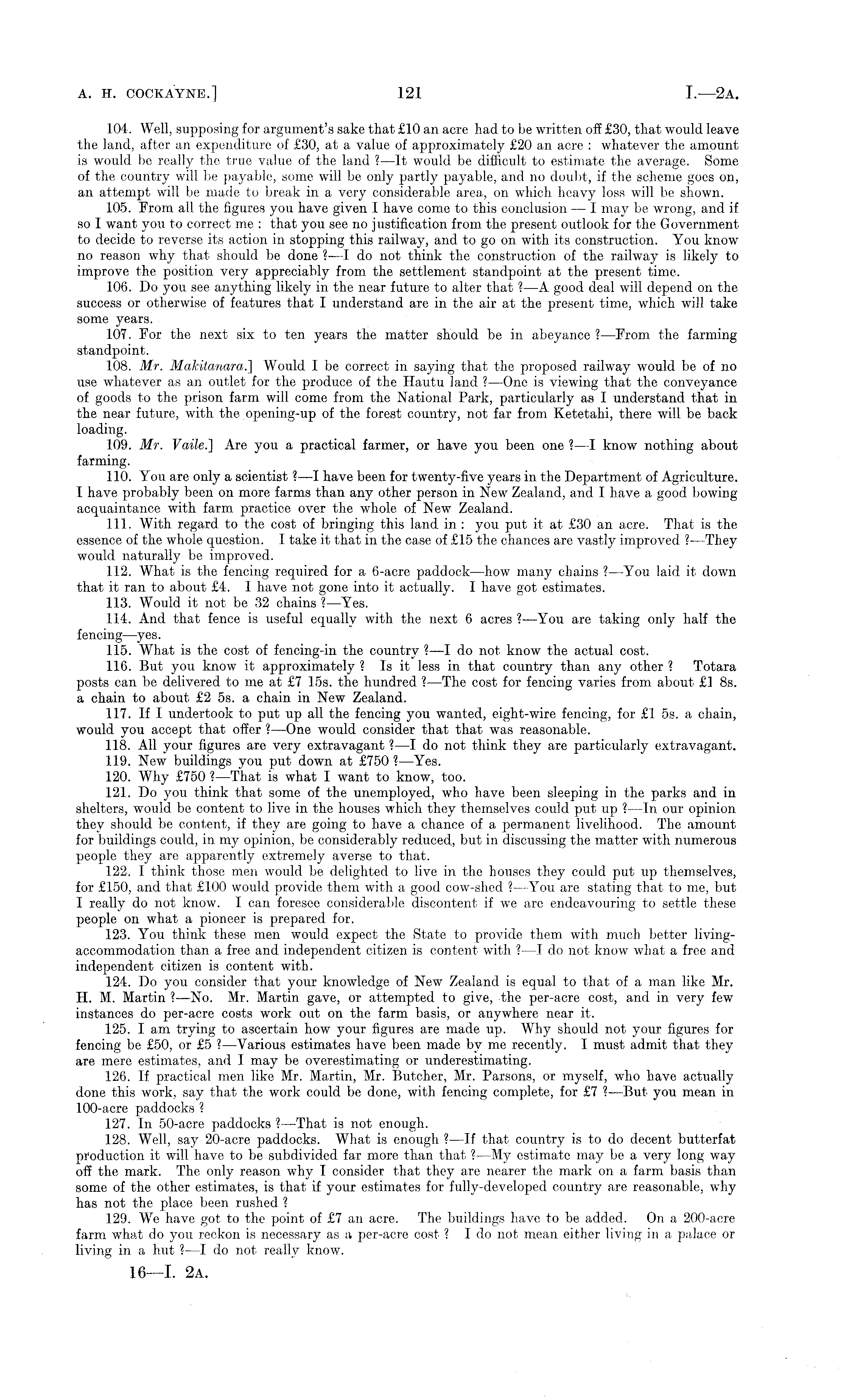 104. Well, supposing for argument's sake that £10 an acre had to be written off £30, that would leave the land, after an expenditure of £30, at a value of approximately £20 an acre : whatever the amount is would be really the true value of the land ? —lt would be difficult to estimate the average. Some of the country will be payable, some will be only partly payable, and no doubt, if the scheme goes on, an attempt will be made to break in a very considerable area, on which heavy loss will be shown. 105. From all the figures you have given I have come to this conclusion — I may be wrong, and if so I want you to correct me : that you see no justification from the present outlook for the Government to decide to reverse its action in stopping this railway, and to go on with its construction. You know no reason why that should be done ? —I do not think the construction of the railway is likely to improve the position very appreciably from the settlement standpoint at the present time. 106. Do you. see anything likely in the near future to alter that ?—A good deal will depend on the success or otherwise of features that I understand are in the air at the present time, which will take some years. 107. For the next six to ten years the matter should be in abeyance ?■—From the farming standpoint. 108. Mr. Makitanara.'] Would I be correct in saying that the proposed railway would be of no use whatever as an outlet for the produce of the Hautu land ? —One is viewing that the conveyance of goods to the prison farm will come from the National Park, particularly as I understand that in the near future, with the opening-up of the forest country, not far from Ketetahi, there will be back loading. 109. Mr. Vaile.] Are you a practical farmer, or have you been one ? —I know nothing about farming. 110. You are only a scientist ? —I have been for twenty-five years in the Department of Agriculture. I have probably been on more farms than any other person in New Zealand, and I have a good bowing acquaintance with farm practice over the whole of New Zealand. 111. With regard to the cost of bringing this land in : you put it at £30 an acre. That is the essence of the whole question. I take it that in the case of £15 the chances are vastly improved ?—They would naturally be improved. 112. What is the fencing required for a 6-acre paddock—how many chains ? —You laid it down that it ran to about £4. I have not gone into it actually. I have got estimates. 113. Would it not be 32 chains ? —Yes. 114. And that fence is useful equally with the next 6 acres ? —You are taking only half the fencing —yes. 115. What is the cost of fencing-in the country ? —I do not know the actual cost. 116. But you know it approximately ? Is it less in that country than any other ? Totara posts can be delivered to me at £7 15s. the hundred ? —The cost for fencing varies from about £1 Bs. a chain to about £2 ss. a chain in New Zealand. 117. If I undertook to put up all the fencing you wanted, eight-wire fencing, for £1 ss. a chain, would you accept that offer ? —One would consider that that was reasonable. 118. All your figures are very extravagant ?—I do not think they are particularly extravagant. 119. New buildings you put down at £750 ? —Yes. 120. Why £750 ? —That is what I want to know, too. 121. Do you think that some of the unemployed, who have been sleeping in the parks and in shelters, would be content to live in the houses which they themselves could put up ? —ln our opinion they should be content, if they are going to have a chance of a permanent livelihood. The amount for buildings could, in my opinion, be considerably reduced, but in discussing the matter with numerous people they are apparently extremely averse to that. 122. I think those men would be delighted to live in the houses they could put up themselves, for £150, and that £100 would provide them with a good cow-shed ? —You are stating that to me, but I really do not know. I can foresee considerable discontent if we are endeavouring to settle these people on what a pioneer is prepared for. 123. You think these men would expect the State to provide them, with much better livingaccommodation than a free and independent citizen is content with ?—I do not know what a free and independent citizen is content with. 124. Do you consider that your knowledge of New Zealand is equal to that of a man like Mr. H. M. Martin ? —No. Mr. Martin gave, or attempted to give, the per-acre cost, and in very few instances do per-acre costs work out on the farm basis, or anywhere near it. 125. lam trying to ascertain how your figures are made up. Why should not your figures for fencing be £50, or £5 ? —Various estimates have been made by me recently. I must admit that they are mere estimates, and I may be overestimating or underestimating. 126. If practical men like Mr. Martin, Mr. Butcher, Mr. Parsons, or myself, who have actually done this work, say that the work could be done, with fencing complete, for £7 ? —But you mean in 100-acre paddocks ? 127. In 50-acre paddocks I—That1 —That is not enough. 128. Well, say 20-acre paddocks. What is enough ? —lf that country is to do decent butterfat production it will have to be subdivided far more than that ? —My estimate may be a very long way off the mark. The only reason why I consider that they are nearer the mark on a farm basis than some of the other estimates, is that if your estimates for fully-developed country are reasonable, why has not the place been rushed ? 129. We have got to the point of £7 an acre. The buildings have to be added. On a 200-acre farm what do you reckon is necessary as a per-acre cost ? Ido not mean either living in a palace or living in a hut ? —I do not really know.