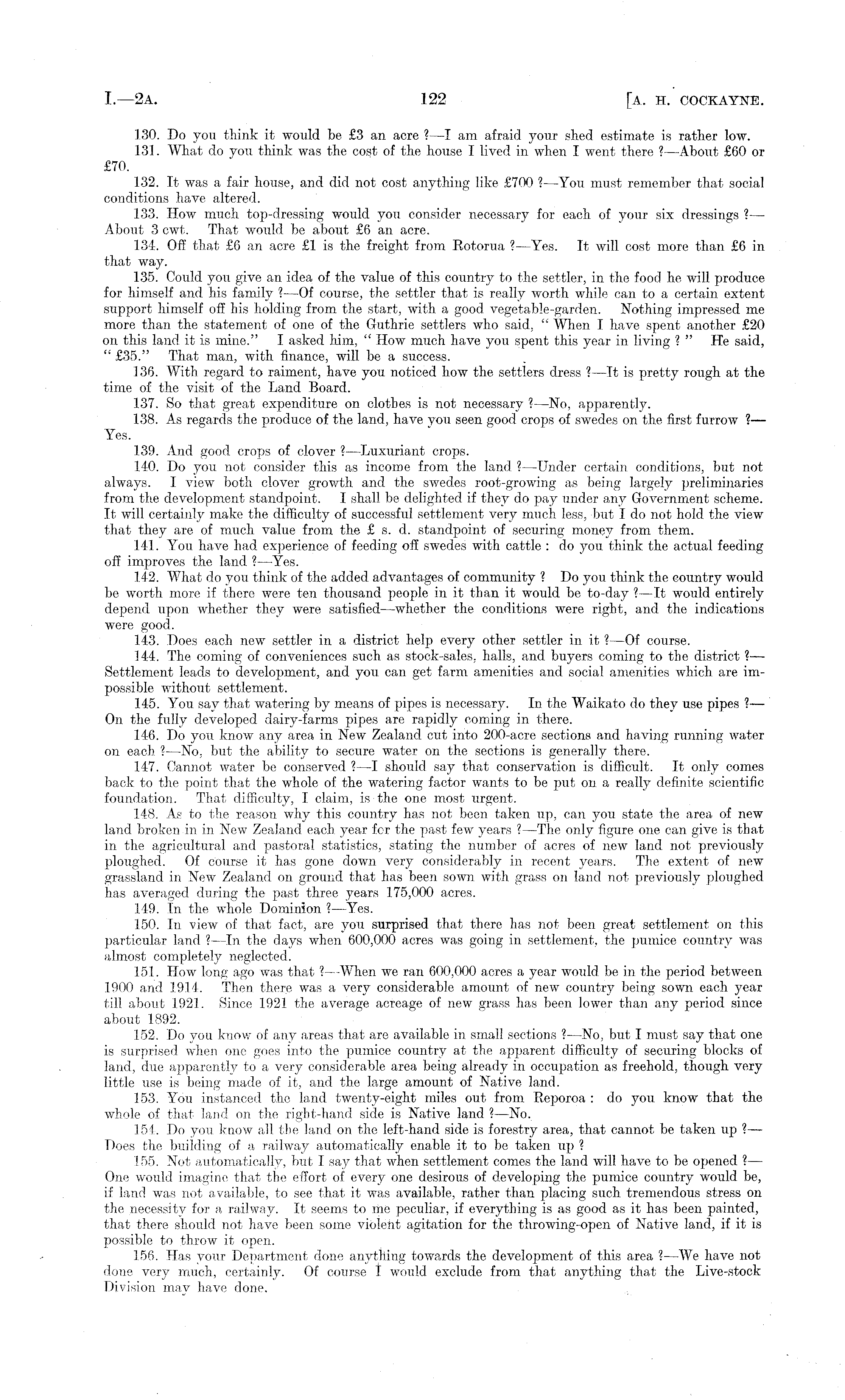 130. Do you think it would be £3 an acre ? —I am afraid your shed estimate is rather low. 131. What do you think was the cost of the house I lived in when I went there ?—About £60 or £70. 132. It was a fair house, and did not cost anything like £700 ? —You must remember that social conditions have altered. 133. How much top-dressing would you consider necessary for each of your six dressings ? — About 3 cwt. That would be about £6 an acre. 134. Off that £6 an acre £1 is the freight from Kotorua ? —Yes. It will cost more than £6 in that way. 135. Could you give an idea of the value of this country to the settler, in the food he will produce for himself and his family ? —Of course, the settler that is really worth while can to a certain extent support himself off his holding from the start, with a good vegetable-garden. Nothing impressed me more than the statement of one of the Guthrie settlers who said, " When I have spent another £20 on this land it is mine." I asked him, " How much have you spent this year in living ? " He said, " £35." That man, with finance, will be a success. 136. With regard to raiment, have you noticed how the settlers dress ? —lt is pretty rough at the time of the visit of the Land Board. 137. So that great expenditure on clothes is not necessary ?—No, appa.rently. 138. As regards the produce of the land, have you seen good crops of swedes on the first furrow ? — Yes. 139. And good crops of clover ? —Luxuriant crops. 140. Do you not consider this as income from the land? —Under certain conditions, but not always. I view both clover growth and the swedes root-growing as being largely preliminaries from the development standpoint. I shall be delighted if they do pay under any Government scheme. It will certainly make the difficulty of successful settlement very much less, but I do not hold the view that they are of much value from the £ s. d. standpoint of securing money from them. 141. You have had experience of feeding off swedes with cattle : do you think the actual feeding off improves the land ?—Yes. 142. What do you think of the added advantages of community ? Do you think the country would be worth more if there were ten thousand people in it than it would be to-day ? —lt would entirely depend upon whether they were satisfied—whether the conditions were right, and the indications were good. 143. Does each new settler in a district help every other settler in it ? —Of course. 144. The coming of conveniences such as stock-sales, halls, and buyers coming to the district ? — Settlement leads to development, and you can get farm amenities and social amenities which are impossible without settlement. 145. You say that watering by means of pipes is necessary. In the Waikato do they use pipes ?— On the fully developed dairy-farms pipes are rapidly coming in there. 146. Do you know any area in New Zealand cut into 200-acre sections and having running water on each ? —No, but the ability to secure water on the sections is generally there. 147. Cannot water be conserved ?—I should say that conservation is difficult. It only comes back to the point that the whole of the watering factor wants to be put on a really definite scientific foundation. That difficulty, I claim., is the one most urgent. 148. As to the reason why this country has not been taken up, can you state the area of new land broken in in New Zealand each year for the past few years ?—The only figure one can give is that in the agricultural and pastoral statistics, stating the number of acres of new land not previously ploughed. Of course it has gone down very considerably in recent years. The extent of new grassland in New Zealand on ground that has been sown with grass on land not previously ploughed has averaged during the past three years 175,000 acres. 149. In the whole Dominion ? —Yes. 150. In view of that fact, are you surprised that there has not been great settlement on this particular land ? —ln the days when 600,000 acres was going in settlement, the pumice country was almost completely neglected. 151. How long ago was that ?—When we ran 600,000 acres a year would be in the period between 1900 and 1914. Then there was a very considerable amount of new country being sown each year till about 1921. Since 1921 the average acreage of new grass has been lower than any period since about 1892. 152. Do you know of any areas that are available in small sections ? —No, but I must say that one is surprised when one goes into the pumice country at the apparent difficulty of securing blocks of land, due apparently to a very considerable area being already in occupation as freehold, though very little use is being made of it, and the large amount of Native land. 153. You instanced the land twenty-eight miles out from Reporoa : do you know that the whole of that land on the right-hand side is Native land ? —No. 154. Do you know all the land on the left-hand side is forestry area, that cannot be taken up ?— Does the building of a railway automatically enable it to be taken up ? 155. Not automatically, but I say that when settlement comes the land will have to be opened ? — One would imagine that the effort of every one desirous of developing the pumice country would be, if land was not available, to see that it was available, rather than placing such tremendous stress on the necessity for a railway. It seems to me peculiar, if everything is as good as it has been painted, that there should not have been some violeht agitation for the throwing-open of Native land, if it is possible to throw it open. 156. Has your Department done anything towards the development of this area ? —We have not done very much, certainly. Of course t would exclude from that anything that the Live-stock Division mav have done.