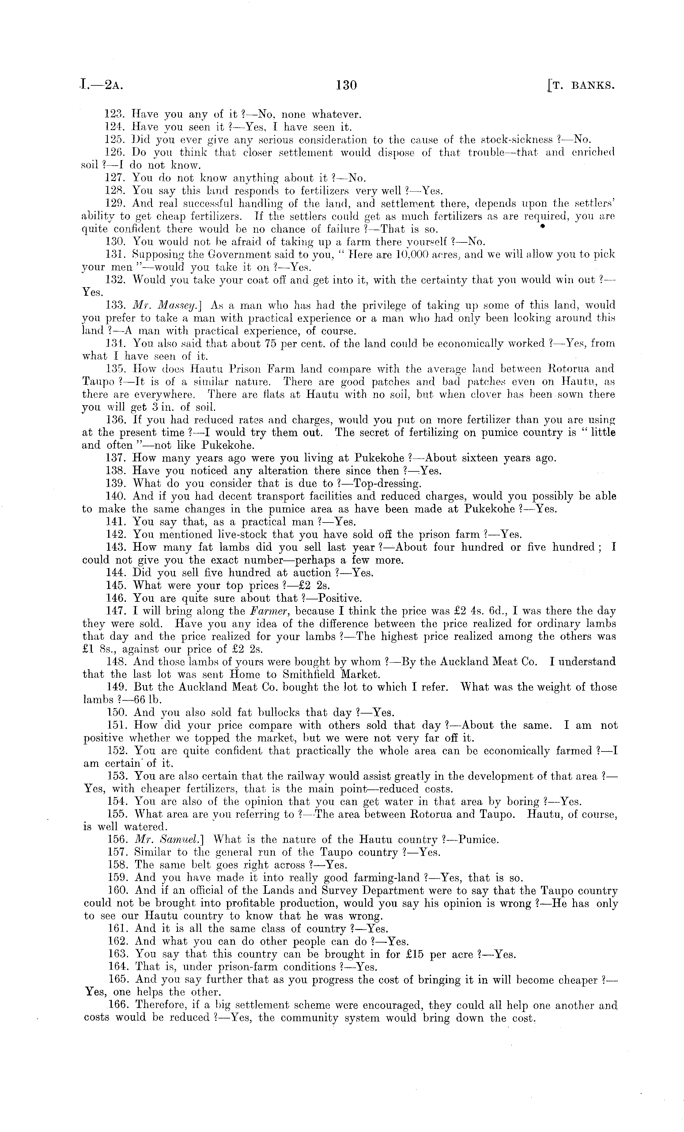 123. Have you any of it ?—No, none whatever. 124. Have you seen it ? —Yes, I have seen it. 125. Did you ever give any serious consideration to the cause of the stock-sickness ? —No. 126. Do you think that closer settlement would dispose of that trouble —that and enriched soil ?—I do not know. 127. You do not know anything about it ?—No. 128. You say this land responds to fertilizers very well ? —Yes. 129. And real successful handling of the land, and settlement there, depends upon the settlers' ability to get cheap fertilizers. If the settlers could get as much fertilizers as are required, you are quite confident there would be no chance of failure ? —That is so. 130. You would not be afraid of taking up a farm there yourself ?—No. 131. Supposing the Government said to you, " Here are 10,000 acres, and we will allow you to pick your men " —would you take it on ? —Yes. 132. Would von take your coat off and get into it, with the certainty that you would win out ?— Yes. 133. Mr. Masset/.] As a man who has had the privilege of taking up some of this land, would you prefer to take a man with practical experience or a man who had only been looking around this land ? —A man with practical experience, of course. 131. You also said that about 75 per cent, of the land could be economically worked ?—Yes, from what I have seen of it. 135. How does Hautu Prison Farm land compare with the average land between Rotorua and Taupo ? —lt is of a similar nature. There are good patches and bad patches even on Hautu, as there are everywhere. There are flats at Hautu with no soil, but when clover has been sown there you will get 3 in. of soil. 136. If you had reduced rates and charges, would you put on more fertilizer than you are using at the present time ? —I would try them out. The secret of fertilizing on pumice country is " little and often " —not like Pukekohe. 137. How many years ago were you living at Pukekohe ?—About sixteen years ago. 138. Have you noticed any alteration there since then ? —Yes. 139. What do you consider that is due to ?—Top-dressing. 140. And if you had decent transport facilities and reduced charges, would you possibly be able to make the same changes in the pumice area as have been made at Pukekohe ? —Yes. 141. You say that, as a practical man ? —Yes. 142. You mentioned live-stock that you have sold off the prison farm ? —Yes. 143. How many fat lambs did you sell last year ?—About four hundred or five hundred ; I could not give you the exact number —perhaps a few more. 144. Did you sell five hundred at auction ? —Yes. 145. What were your top prices I—£21 —£2 2s. 146. You are quite sure about that ?—Positive. 147. I will bring along the Farmer, because I think the price was £2 4s. 6d., I was there the day they were sold. Have you any idea of the difference between the price realized for ordinary lambs that day and the price realized for your lambs ? —The highest price realized among the others was £1 Bs., against our price of £2 2s. 148. And those lambs of yours were bought by whom ? —By the Auckland Meat Co. I understand that the last lot was sent Home to Smithfield Market. 149. But the Auckland Meat Co. bought the lot to which I refer. What was the weight of those lambs ? —66 lb. 150. And you also sold fat bullocks that day %—Yes. 151. How did your price compare with others sold that day ? —About the same. I am not positive whether we topped the market, but we were not very far off it. 152. You are quite confident that practically the whole area can be economically farmed ? —I am certain of it. 153. You are also certain that the railway would assist greatly in the development of that area ? — Yes, with cheaper fertilizers, that is the main point—reduced costs. 154-. You are also of the opinion that you can get water in that area by boring ? —Yes. 155. What area are you referring to ? —The area between Rotorua and Taupo. Hautu, of course, is well watered. 156. Mr. Samuel.] What, is the nature of the Hautu country ? —Pumice. 157. Similar to the general run of the Taupo country ? —Yes. 158. The same belt goes right across ?—Yes. 159. And you have made it into really good farming-land ? —Yes, that is so. 160. And if an official of the Lands and Survey Department were to say that the Taupo country could not be brought into profitable production, would you say his opinion is wrong ? —He has only to see our Hautu country to know that he was wrong. 161. And it is all the same class of country ?—Yes. 162. And what you can do other people can do ? —Yes. 163. You say that this country can be brought in for £15 per acre ?—Yes. 164. That is, under prison-farm conditions ? —Yes. 165. And you say further that as you progress the cost of bringing it in will become cheaper ?— Yes, one helps the other. 166. Therefore, if a big settlement scheme were encouraged, they could all help one another and costs would be reduced I—Yes, the community system would bring down the cost,