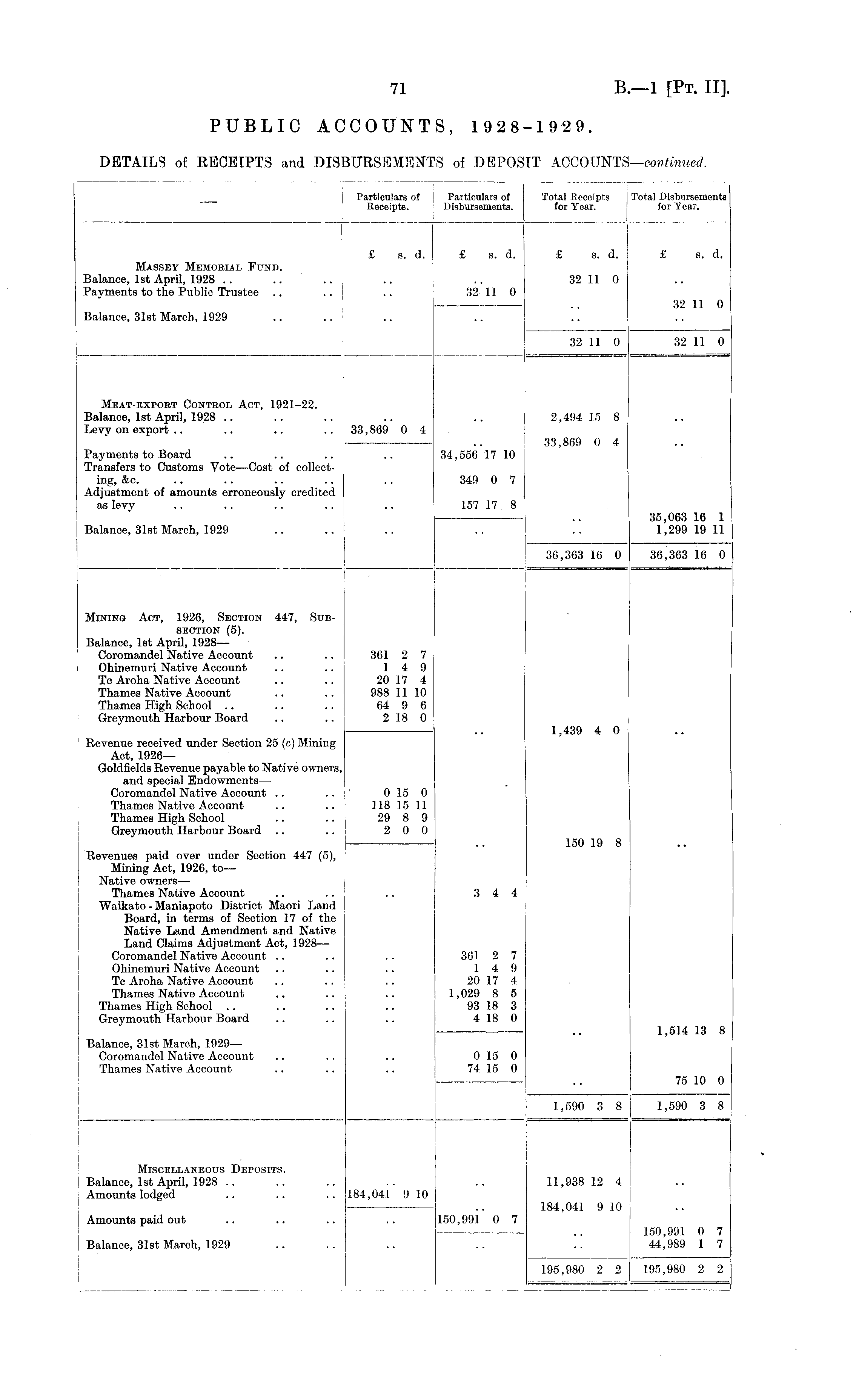 Particulars of Particulars of Total Receipts Total Disbursements Receipts. Disbursements. for Year. for Year. £ s. d. £ s. d. £ s. d. £ s. d. Massey Memobial Fund. Balance, 1st April, 1928 .. .. .. .. .. 32 11 0 Payments to the Public Trustee .. .. .. 32 11 0 — .. 32 11 0 Balance, 31st March, 1929 .. 32 11 0 32 11 0 Meat-export Control Act, 1921-22. Balance, 1st April, 1928 .. .. .. .. .. 2,494 15 8 Levy on export .. .. .. 33,869 0 4 .. 33,869 0 4 Payments to Board .. .. .. .. 34,556 17 10 Transfers to Customs Vote —Cost of collecting, &e. .. .. .. .. .. 349 0 7 Adjustment of amounts erroneously credited as levy .. .. .. .. .. 157 17 8 .. 35,063 16 1 Balance, 31st March, 1929 .. .. .. .. .. 1,299 19 11 36,363 16 0 36,363 16 0 ' Mininq Aot, 1926, Section 447, Subsection (5). Balance, 1st April, 1928 — Coromandel Native Account .. .. 361 2 7 Ohinemuri Native Account .. .. 14 9 Te Aroha Native Account .. .. 20 17 4 Thames Native Account .. .. 988 11 10 Thames High School .. .. .. 64 9 6 Grey mouth Harbour Board .. .. 2 18 0 .. 1,439 4 0 Revenue received under Section 25 (c) Mining Act, 1926 — Goldfields Revenue payable to Native owners, and special Endowments— Coromandel Native Account .. .. 0 15 0 Thames Native Account .. .. 118 15 11 Thames High School .. .. 29 8 9 Greymouth Harbour Board .. .. 2 0 0 .. 150 19 8 Revenues paid over under Section 447 (5), Mining Act, 1926, to— Native ownersThames Native Account .. .. .. 3 4 4 Waikato - Maniapoto District Maori Land Board, in terms of Section 17 of the Native Land Amendment and Native Land Claims Adjustment Act, 1928— Coromandel Native Account .. .. .. 361 2 7 Ohinemuri Native Account .. .. .. 14 9 Te Aroha Native Account .. .. .. 20 17 4 Thames Native Account .. .. .. 1,029 8 5 Thames High School .. .. .. .. 93 18 3 j Greymouth Harbour Board .. .. .. 4 18 0 .. 1,514 13 8 Balance, 31st March, 1929 — Coromandel Native Account .. .. .. 0 15 0 Thames Native Account .. .. .. 74 15 0 .. 75 10 0 1,590 3 8 1,590 3 8 Miscellaneous Deposits. Balance, 1st April, 1928 .. .. .. .. .. 11,938 12 4 Amounts lodged .. .. .. 184,041 9 10 .. 184,041 9 10 Amounts paid out .. .. .. .. 150,991 0 7 .. 150,991 0 7 Balance, 31st March, 1929 .. .. .. .. .. 44,989 1 7 195,980 2 2 195,980 2 2