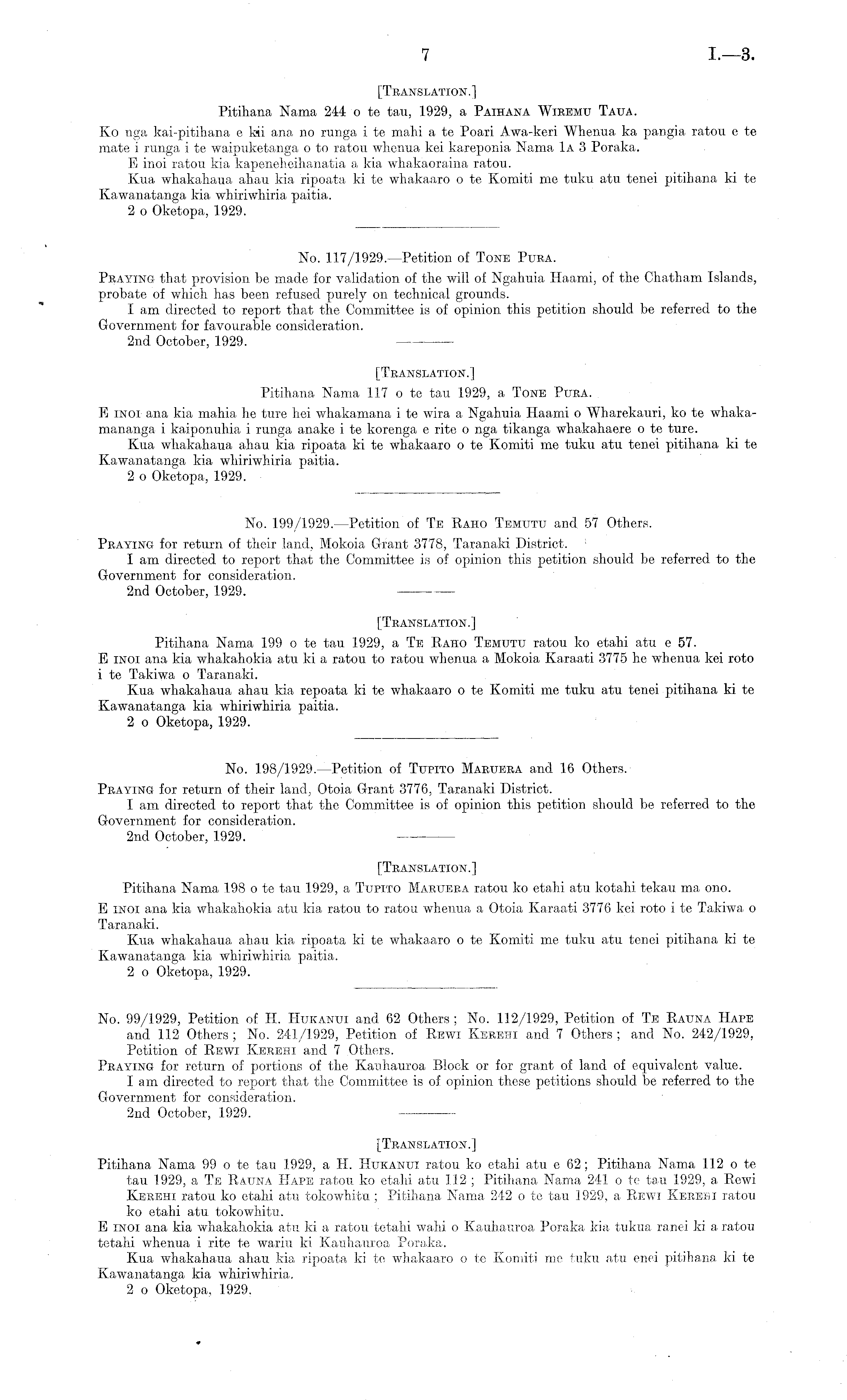 No. 199/1929. —Petition of Te Raho Temutu and 57 Others. Praying for return of their land, Mokoia Grant 3778, Taranaki District. 1 am directed to report that the Committee is of opinion this petition should be referred to the Government for consideration. 2nd October, 1929. [Translation.] Pitihana Nama 199 o te tau 1929, a Te Raho Temutu ratou ko etahi atu e 57. E inoi ana kia whakahokia atu ki a ratou to ratou whenua a Mokoia Karaati 3775 he whenua kei roto i te Takiwa o Taranaki. Kua whakahaua ahau kia repoata kite whakaaro o te Komiti me tuku atu tenei pitihana kite Kawanatanga kia whiriwhiria paitia. 2 o Oketopa, 1929.