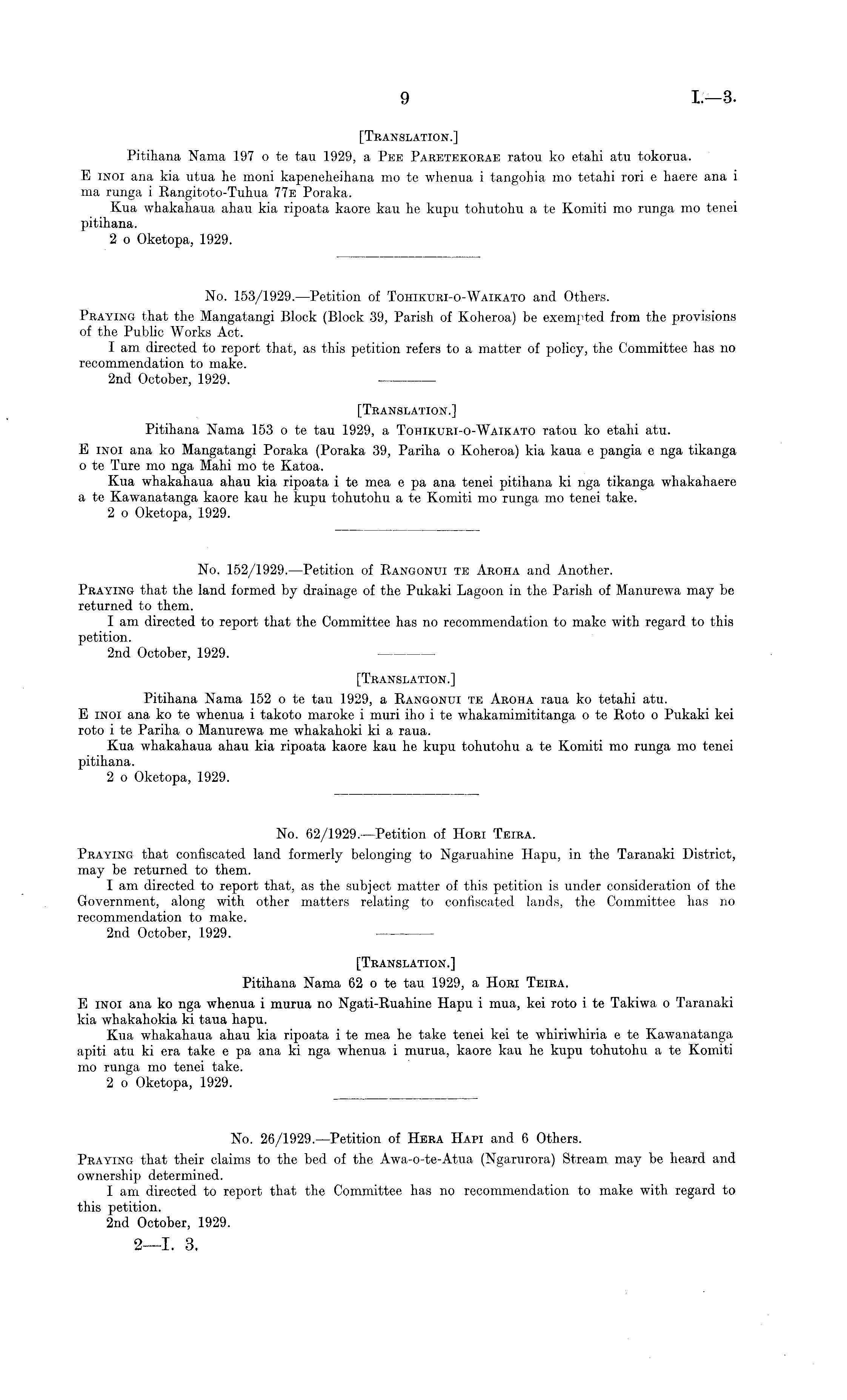 [Translation.] Pitihana Nama 197 o te tau 1929, a Pee Paretekorae ratou ko etahi atu tokorua. E inoi ana kia utua he moni kapeneheihana mo te whenua i tangohia mo tetahi rori e haere ana i ma runga i Rangitoto-Tuhua 77e Poraka. Kua whakahaua ahau kia ripoata kaore kau he kupu tohutohu a te Komiti mo runga mo tenei pitihana. 2 o Oketopa, 1929.