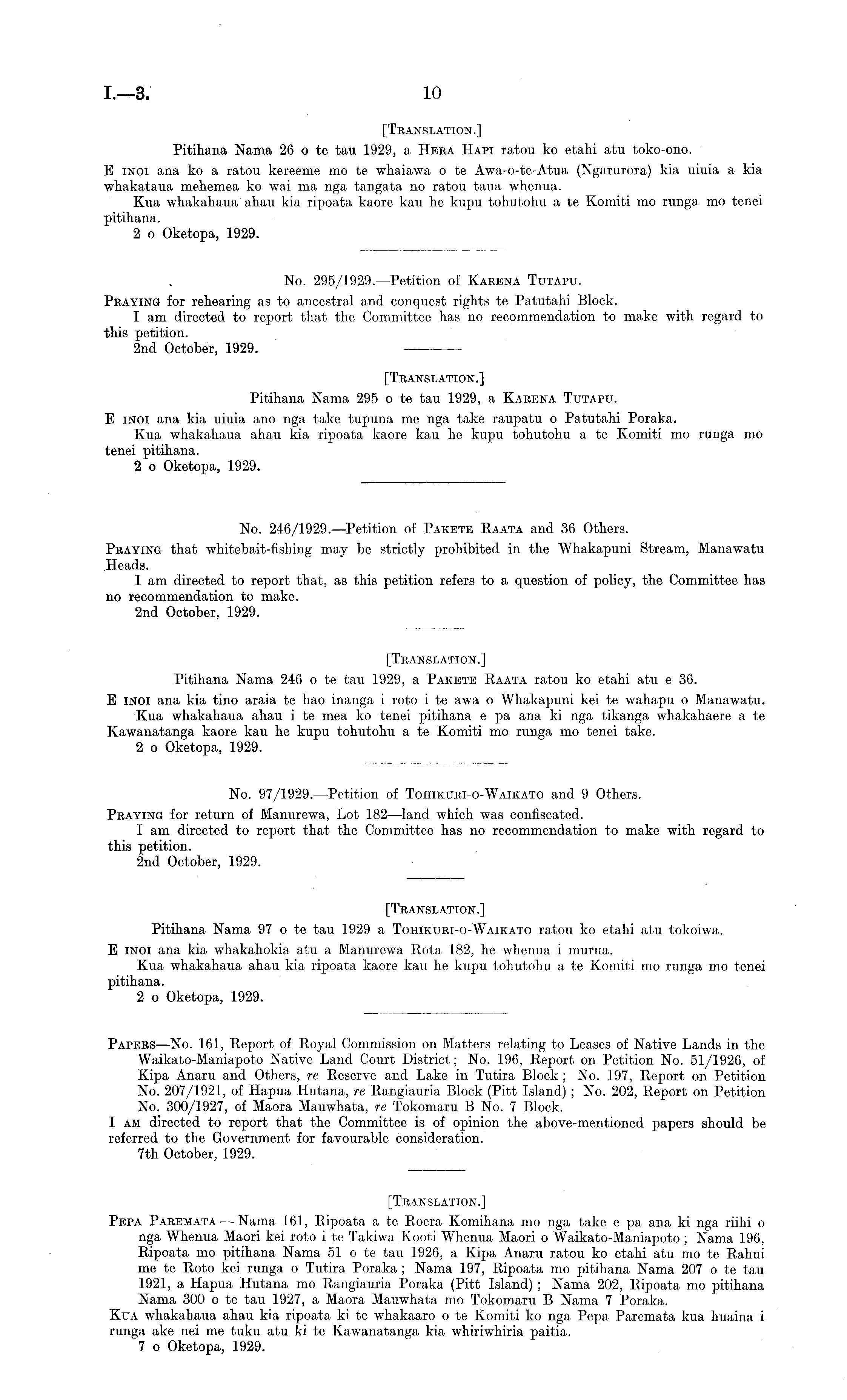 No. 295/1929. —Petition of Karena Tutapu. Praying for rehearing as to ancestral and conquest rights te Patutahi Block. 1 am directed to report that the Committee has no recommendation to make with regard to this petition. 2nd October, 1929. [Translation.] Pitihana Nama 295 o te tau 1929, a Karena Tutapu. E inoi ana kia uiuia ano nga take tupuna me nga take raupatu o Patutahi Poraka. Kua whakahaua ahau kia ripoata kaore kau he kupu tohutohu a te Komiti mo runga mo tenei pitihana. 2 o Oketopa, 1929.