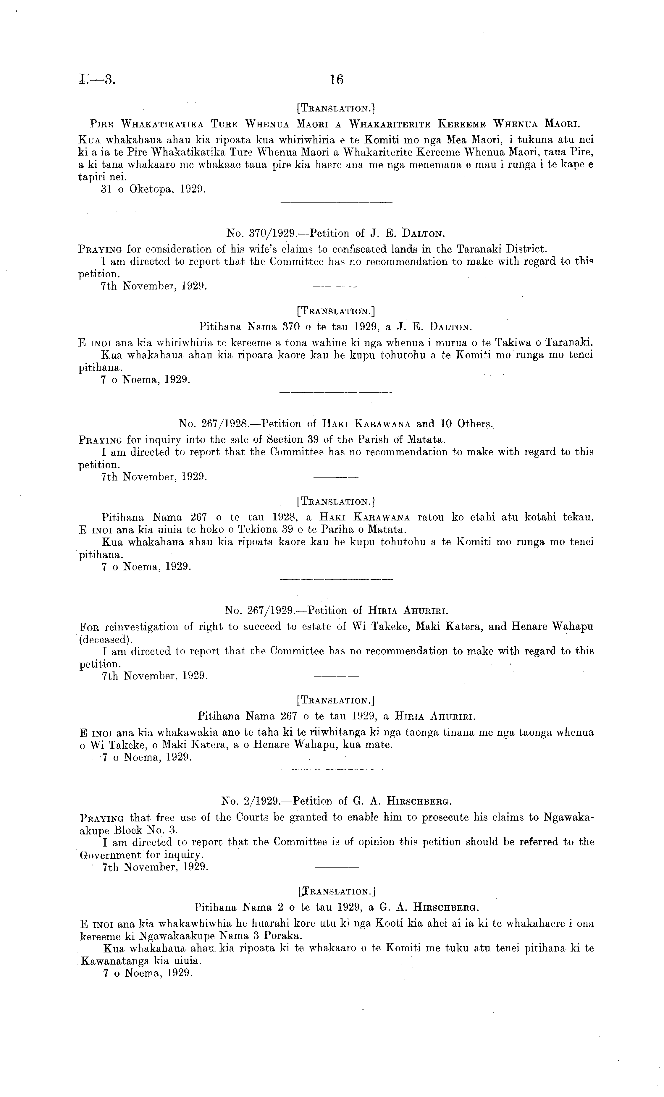 No. 267/1928. —Petition of Haki Karawana and 10 Others. Praying for inquiry into the sale of Section 39 of the Parish of Matata. I am directed to report that the Committee has no recommendation to make with regard to this petition. 7th November, 1929. [Translation.] Pitihana Nama 267 o te tau 1928, a Haki Karawana ratou ko etahi atu kotahi tekau. E inoi ana kia uiuia te hoko o Tekiona 39 o te Pariha o Matata. Kua whakahaua ahau kia ripoata kaore kau he kupu tohut.ohu a te Komiti mo runga mo tenei pitihana. 7 o Noema, 1929.