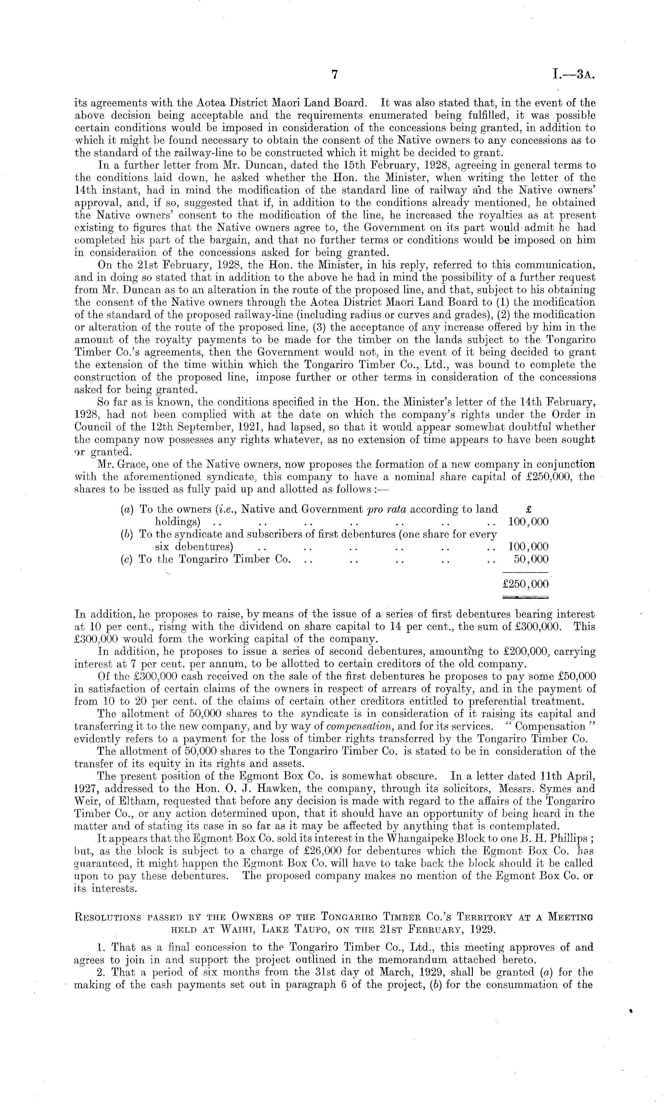 its agreements with the Aotea District Maori Lancl Board. It was also stated that, in the event of the above decision being acceptable and the requirements enumerated being fulfilled, it was possible certain conditions would be imposed in consideration of the concessions being granted, in addition to which it might be found necessary to obtain the consent of the Native owners to any concessions as to the standard of the railway-line to be constructed which it might be decided to grant. In a further letter from Mr. Duncan, dated the 15th February, 1928, agreeing in general terms to the conditions laid down, he asked whether the Hon. the Minister, when writing the letter of the 14th instant, had in mind the modification of the standard line of railway and the Native owners' approval, and, if so, suggested that if, in addition to the conditions already mentioned, he obtained the Native owners' consent to the modification of the line, he increased the royalties as at present existing to figures that the Native owners agree to, the Government on its part would admit he had completed his part of the bargain, and that no further terms or conditions would be imposed on him in consideration of the concessions asked for being granted. On the 21st February, 1928, the Hon. the Minister, in his reply, referred to this communication, and in doing so stated that in addition to the above he had in mind the possibility of a further request from Mr. Duncan as to an alteration in the route of the proposed line, and that, subject to his obtaining the consent of the Native owners through the Aotea District Maori Land Board to (1) the modification of the standard of the proposed railway-line (including radius or curves and grades), (2) the modification or alteration of the route of the proposed line, (3) the acceptance of any increase offered by him in the amount of the royalty payments to be made for the timber on the lands subject to the Tongariro Timber Co.'s agreements, then the Government would not, in the event of it being decided to grant the extension of the time within which the Tongariro Timber Co., Ltd., was bound to complete the construction of the proposed line, impose further or other terms in consideration of the concessions asked for being granted. So far as is known, the conditions specified in the Hon. the Minister's letter of the 14th February, 1928, had not been complied with at the date on which the company's rights under the Order in Council of the 12th September, 1921, had lapsed, so that it would appear somewhat doubtful whether the company now possesses any rights whatever, as no extension of time appears to have been sought or granted. Mr. Grace, one of the Native owners, now proposes the formation of a new company in conjunction with the aforementioned syndicate, this company to have a nominal share capital of £250,000, the shares to be issued as fully paid up and allotted as follows : — {a) To the owners {i.e., Native and Government fro rata according to land £ holdings) .. .. .. .. .. .. .. 100,000 (b) To the syndicate and subscribers of first debentures (one share for every six debentures) .. .. .. .. .. .. 100,000 (c) To the Tongariro Timber Co. .. .. .. .. .. 50,000 £250,000 In addition, he proposes to raise, by means of the issue of a series of first debentures bearing interest at 10 per cent., rising with the dividend on share capital to 14 per cent., the sum of £300,000. This £300,000 would form the working capital of the company. In addition, he proposes to issue a series of second debentures, amounting to £200,000, carrying interest at 7 per cent, per annum, to be allotted to certain creditors of the old company. Of the £300,000 cash received on the sale of the first debentures he proposes to pay some £50,000 in satisfaction of certain claims of the owners in respect of arrears of royalty, and in the payment of from 10 to 20 per cent, of the claims of certain other creditors entitled to preferential treatment. The allotment of 50,000 shares to the syndicate is in consideration of it raising its capital and transferring it to the new company, and by way of compensation, and for its services. " Compensation " evidently refers to a payment for the loss of timber rights transferred by the Tongariro Timber Co. The allotment of 50,000 shares to the Tongariro Timber Co. is stated to be in consideration of the transfer of its equity in its rights and assets. The present position of the Egmont Box Co. is somewhat obscure. In a letter dated 11th April, 1927, addressed to the Hon. O. <T. Hawken, the company, through its solicitors, Messrs. Symes and Weir, of Eltham, requested that before any decision is made with regard to the affairs of the Tongariro Timber Co., or any action determined upon, that it should have an opportunity of being heard in the matter and of stating its case in so far as it may be affected by anything that is contemplated. It appears that the Egmont Box Co. sold its interest in the Whangaipeke Block to one B. H. Phillips ; but, as the block is subject to a charge of £26,000 for debentures which the Egmont Box Co. has guaranteed, it might happen the Egmont Box Co. will have to take back the block should it be called upon to pay these debentures. The proposed company makes no mention of the Egmont Box Co. or its interests.. Resolutions passed by the Owners of the Tongariro Timber Co.'s Territory at a Meeting HELD AT WaIHI, LAKE TAIJPO, ON THE 21ST FEBRUARY, 1929. 1. That as a final concession to the Tongariro Timber Co., Ltd., this meeting approves of and agrees to join in and support the project outlined in the memorandum attached hereto. 2. That a period of six months from the 31st day of March, 1929, shall be granted (a) for the making of the cash payments set out in paragraph 6 of the project, (b) for the consummation of the