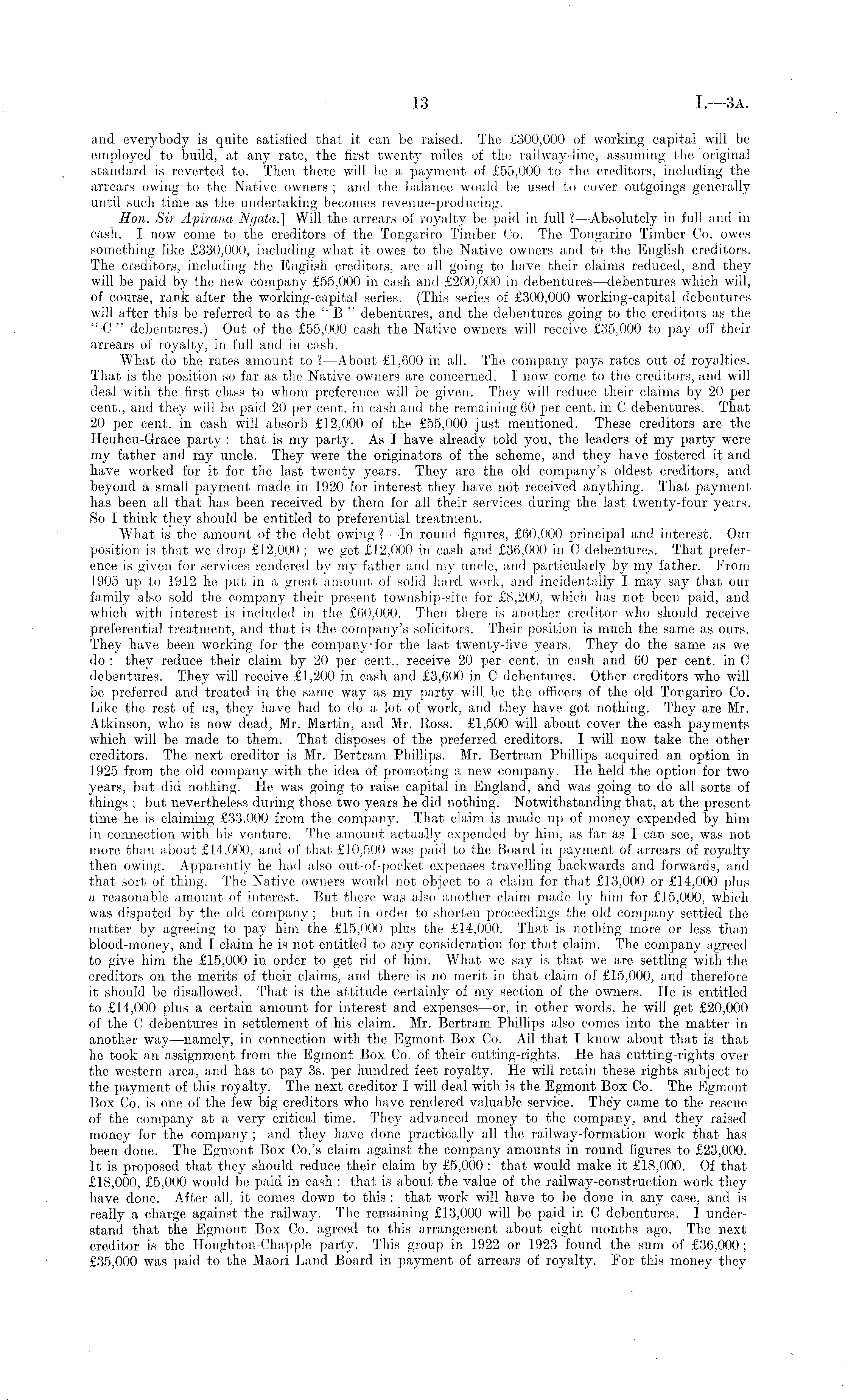 and everybody is quite satisfied that it can be raised. The £300,000 of working capital will be employed to build, at any rate, the first twenty miles of the railway-line, assuming the original standard is reverted to. Then there will be a payment of £55,000 to the creditors, including the arrears owing to the Native owners ; and the balance would be used to cover outgoings generally until such time as the undertaking becomes revenue-producing. Hon. Sir Apirana Ngata.] Will the arrears of royalty be paid in full ? —Absolutely in full and in cash. I now come to the creditors of the Tongariro Timber Co. The Tongariro Timber Co. owes something like £330,000, including what it owes to the Native owners and to the English creditors. The creditors, including the English creditors, are all going to have their claims reduced, and they will be paid by the new company £55,000 in cash and £200,000 in debentures —debentures which will, of course, rank after the working-capital series. (This series of £300,000 working-capital debentures will after this be referred to as the " B " debentures, and the debentures going to the creditors as the "C " debentures.) Out of the £55,000 cash the Native owners will receive £35,000 to pay off their arrears of royalty, in full and in cash. What do the rates amount to ?—About £1,600 in all. The company pays rates out of royalties. That is the position so far as the Native owners are concerned. I now come to the creditors, and will deal with the first class to whom preference will be given. They will reduce their claims by 20 per cent., and they will be paid 20 per cent, in cash and the remaining 60 per cent, in C debentures. That 20 per cent, in cash will absorb £12,000 of the £55,000 just mentioned. These creditors are the Heuheu-Grace party : that is my party. As 1 have already told you, the leaders of my party were my father and my uncle. They were the originators of the scheme, and they have fostered it and have worked for it for the last twenty years. They are the old company's oldest creditors, and beyond a small payment made in 1920 for interest they have not received anything. That payment has been all that has been received by them for all their services during the last twenty-four years. So I think they should be entitled to preferential treatment. What is the amount of the debt owing ? —ln round figures, £60,000 principal and interest. Our position is that we drop £12,000 ; we get £12,000 in cash and £36,000 in C debentures. That preference is given for services rendered by my father and my uncle, and particularly by my father. From 1905 up to 1912 he put in a great amount of solid hard work, and incidentally I may say that our family also sold the company their present township-site for £8,200, which has not been paid, and which with interest is included in the £60,000. Then there is another creditor who should receive preferential treatment, and that is the company's solicitors. Their position is much the same as ours. They have been working for the company for the last twenty-five years. They do the same as we do : they reduce their claim by 20 per cent., receive 20 per cent, in cash and 60 per cent, in C debentures. They will receive £1,200 in cash and £3,600 in C debentures. Other creditors who will be preferred and treated in the same way as my party will be the officers of the old Tongariro Co. Like the rest of us, they have had to do a lot of work, and they have got nothing. They are Mr. Atkinson, who is now dead, Mr. Martin, and Mr. Boss. £1,500 will about cover the cash payments which will be made to them. That disposes of the preferred creditors. I will now take the other creditors. The next creditor is Mr. Bertram Phillips. Mr. Bertram Phillips acquired an option in 1925 from the old company with the idea of promoting a new company. He held the option for two years, but did nothing. He was going to raise capital in England, and was going to do all sorts of things ; but nevertheless during those two years he did nothing. Notwithstanding that, at the present time he is claiming £33,000 from the company. That claim is made up of money expended by him in connection with his venture. The amount actually expended, by him, as far as 1 can see, was not more than about £14,000, and of that £10,500 was paid to the Board in payment of arrears of royalty then owing. Apparently he had also out-of-pocket expenses travelling backwards and forwards, and that sort of thing. The Native owners would not object to a claim for that £13,000 or £14,000 plus a reasonable amount of interest. But there was also another claim made by him for £15,000, which was disputed by the old company ; but in order to shorten proceedings the old company settled the matter by agreeing to pay him the £15,000 plus the £14,000. That is nothing more or less than blood-money, and I claim he is not entitled to any consideration for that claim. The company agreed to give him the £15,000 in order to get rid of him.. What we say is that we are settling with the creditors on the merits of their claims, and there is no merit in that claim of £15,000, and therefore it should be disallowed. That is the attitude certainly of my section of the owners. He is entitled to £14,000 plus a certain amount for interest and expenses —or, in other words, he will get £20,000 of the C debentures in settlement of his claim. Mr. Bertram Phillips also comes into the matter in another way —namely, in connection with the Egmont Box Co. All that I know about that is that he took an assignment from the Egmont Box Co. of their cutting-rights. He has cutting-rights over the western area, and has to pay 3s. per hundred feet royalty. He will retain these rights subject to the payment of this royalty. The next creditor I will deal with is the Egmont Box Co. The Egmont Box Co. is one of the few big creditors who have rendered valuable service. They came to the rescue of the comp