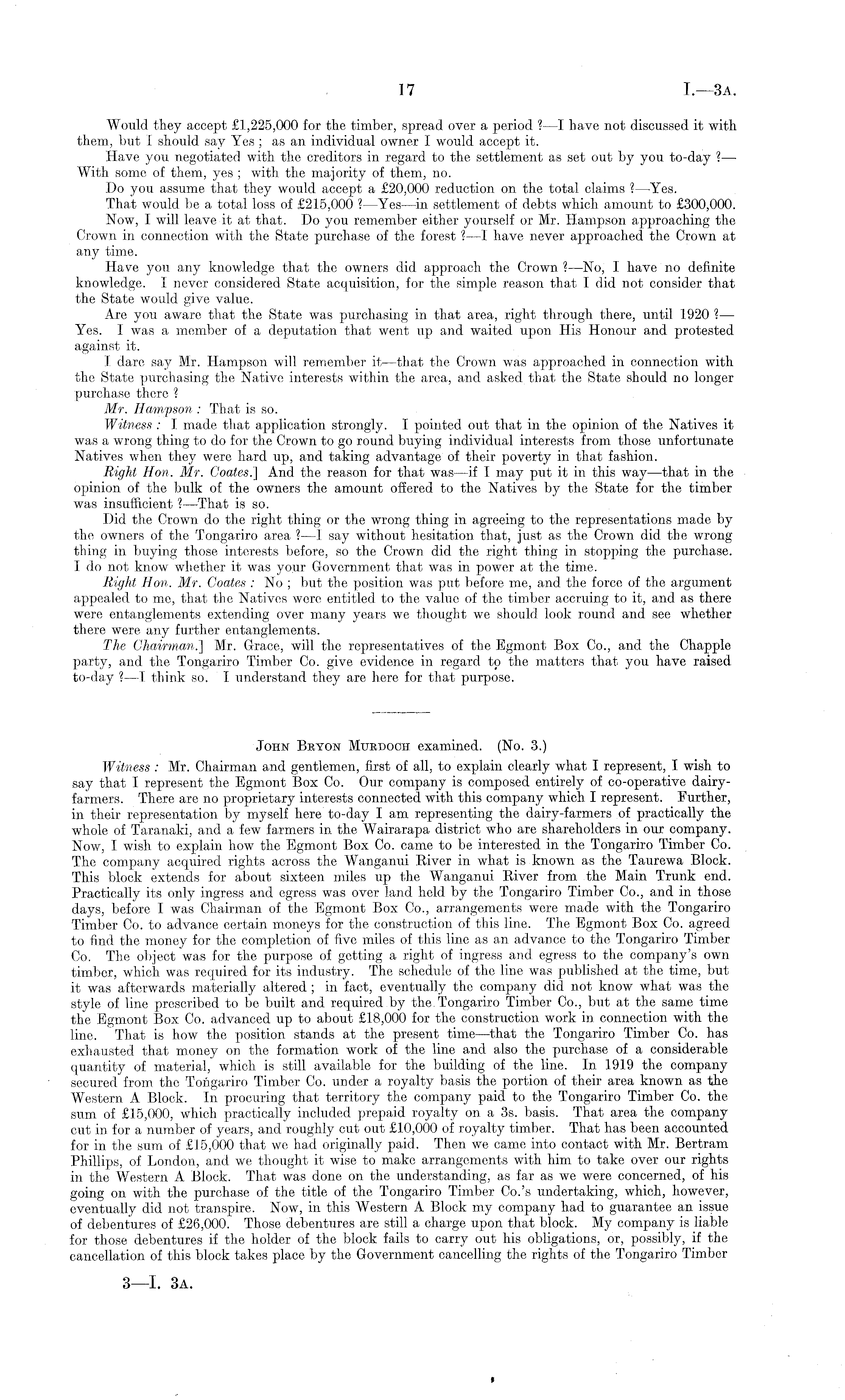 Would they accept £1,225,000 for the timber, spread over a period ? —I have not discussed it with them, but I should say Yes ; as an individual owner I would accept it. Have you negotiated with the creditors in regard to the settlement as set out by you to-day ?— With some of them, yes ; with the majority of them, no. Do you assume that they would accept a £20,000 reduction on the total claims ?—Yes. That would be a total loss of £215,000 ?—Yes—in settlement of debts which amount to £300,000. Now, I will leave it at that. Do you remember either yourself or Mr. Hampson approaching the Crown in connection with the State purchase of the forest ?—I have never approached the Crown at any time. Have you any knowledge that the owners did approach the Crown ? —No, I have no definite knowledge. I never considered State acquisition, for the simple reason that I did not consider that the State would give value. Are you aware that the State was purchasing in that area, right through there, until 1920 ? —■ Yes. I was a member of a deputation that went up and waited upon His Honour and protested against it. I dare say Mr. Hampson will remember it—that the Crown was approached in connection with the State purchasing the Native interests within the area, and asked that the State should no longer purchase there ? Mr. Hampson : That is so. Witness : I made that application strongly. I pointed out that in the opinion of the Natives it was a wrong thing to do for the Crown to go round buying individual interests from those unfortunate Natives when they were hard up, and taking advantage of tlieir poverty in that fashion. Right Hon. Mr. Coates.] And the reason for that was —if I may put it in this way —that in the opinion of the bulk of the owners the amount offered to the Natives by the State for the timber was insufficient ? —That is so. Did the Crown do the right thing or the wrong thing in agreeing to the representations made by the owners of the Tongariro area ? —I say without hesitation that, just as the Crown did the wrong thing in buying those interests before, so the Crown did the right thing in stopping the purchase. I do not know whether it was your Government that was in power at the time. Right Hon. Mr. Coates : No ; but the position was put before me, and the force of the argument appealed to me, that the Natives were entitled to the value of the timber accruing to it, and as there were entanglements extending over many years we thought we should look round and see whether there were any further entanglements. The Chairman.'] Mr. Grace, will the representatives of the Egmont Box Co., and the Chappie party, and the Tongariro Timber Co. give evidence in regard to the matters that you have raised to-day ? —I think so. I understand they are here for that purpose. John Bkyon Murdoch examined. (No. 3.) Witness : Mr. Chairman and gentlemen, first of all, to explain clearly what I represent, I wish to say that I represent the Egmont Box Co. Our company is composed entirely of co-operative dairyfarmers. There are no proprietary interests connected with this company which I represent. Further, in their representation by myself here to-day 1 am representing the dairy-farmers of practically the whole of Taranaki, and a few farmers in the Wairarapa district who are shareholders in our company. Now, I wish to explain how the Egmont Box Co. came to be interested in the Tongariro Timber Co. The company acquired rights across the Wanganui River in what is known as the Taurewa Block. This block extends for about sixteen miles up the Wanganui River from the Main Trunk end. Practically its only ingress and egress was over land held by the Tongariro Timber Co., and in those days, before I was Chairman of the Egmont Box Co., arrangements were made with the Tongariro Timber Co. to advance certain moneys for the construction of this line. The Egmont Box Co. agreed to find the money for the completion of five miles of this line as an advance to the Tongariro Timber Co. The object was for the purpose of getting a right of ingress and egress to the company's own timber, which was required for its industry. The schedule of the line was published at the time, but it was afterwards materially altered ; in fact, eventually the company did not know what was the style of line prescribed to be built and required by the. Tongariro Timber Co., but at the same time the Egmont Box Co. advanced up to about £18,000 for the construction work in connection with the line. That is how the position stands at the present time—that the Tongariro Timber Co. has exhausted that money on the formation work of the line and also the purchase of a considerable quantity of material, which is still available for the building of the line. In 1919 the company secured from the Tongariro Timber Co. under a royalty basis the portion of their area known as the Western A Block. In procuring that territory the company paid to the Tongariro Timber Co. the sum of £15,000, which practically included prepaid royalty on a 3s. basis. That area the company cut in for a number of years, and roughly cut out £10,000 of royalty timber. That has been accounted for in the sum of £15,000 that we had originally paid. Then we came into contact with Mr. Bertram Phillips, of London, and we thought it wise to make arrangements with him to take over our rights in the Western A Block. That was done on the understanding, as far as we were concerned, of his going on with the purchase of the title of the Tongariro Timber Co.'s undertaking, which, however, eventually did not transpire. Now, in this Western A Block my company had to guarantee an issue of debentures of £26,000. Those debentures are still a charge upon that block. My company is liable for those debentures if the holder of the block fails to carry out his obligations, or, possibly, if the cancellation of this block takes place by the Government cancelling the rights of the Tonga