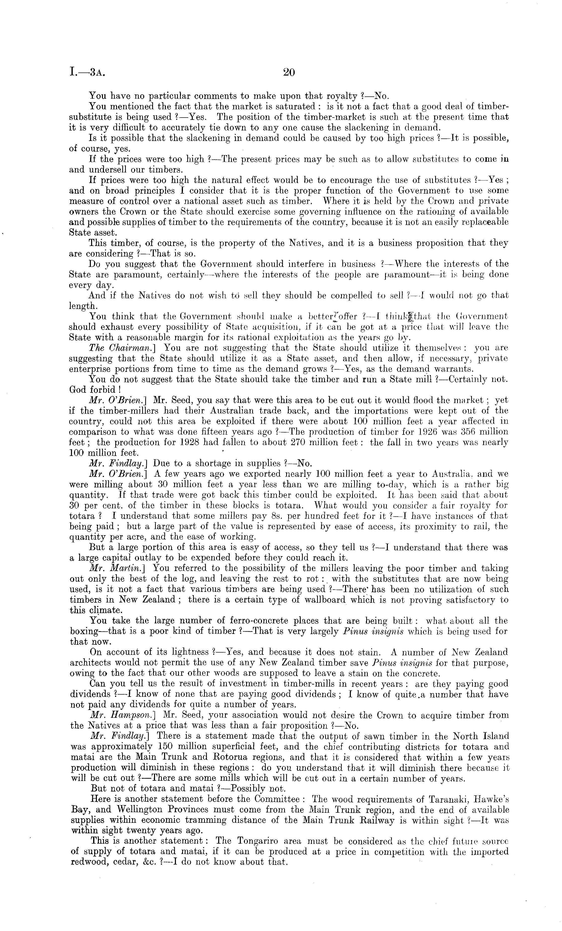 You have no particular comments to make upon that royalty ?—No. You mentioned the fact that the market is saturated : is it not a fact that a good deal of timbersubstitute is being used ?—Yes. The position of the timber-market is such at the present time that it is very difficult to accurately tie down to any one cause the slackening in demand. Is it possible that the slackening in demand could be caused by too high prices ? —lt is possible, of course, yes. If the prices were too high ? —The present prices may be such as to allow substitutes to come in and undersell our timbers. If prices were too high the natural effect would be to encourage the use of substitutes ? —Yes ; and on broad principles I consider that it is the proper function of the Government to use some measure of control over a national asset such as timber. Where it is held by the Crown and private owners the Crown or the State should exercise some governing influence on the rationing of available and possible supplies of timber to the requirements of the country, because it is not an easily replaceable State asset. This timber, of course, is the property of the Natives, and it is a business proposition that they are considering ?—That is so. Do you suggest that the Government should interfere in business ? —Where the interests of the State are paramount, certainly —where the interests of the people are paramount —it is being done every day. And if the Natives do not wish tc) sell they should be compelled to sell ? —I would not go that length. You think that the Government should make a betterjoffer ? —I thinkjthat the Government should exhaust every possibility of State acquisition, if it can be got at a price that will leave the State with a reasonable margin for its rational exploitation as the years go by. The Chairman.] You are not suggesting that the State should utilize it themselves : you are suggesting that the State should utilize it as a State asset, and then allow, if necessary, private enterprise portions from time to time as the demand grows ? —Yes, as the demand warrants. You do not suggest that the State should take the timber and run a State mill ? —Certainly not. God forbid ! Mr. O'Brien.'] Mr. Seed, you say that were this area to be cut out it would flood the market; yet if the timber-millers had their Australian trade back, and the importations were kept out of the country, could not this area be exploited if there were about 100 million feet a year affected in comparison to what was done fifteen years ago ? —The production of timber for 1926 was 356 million feet; the production for 1928 had fallen to about 270 million feet: the fall in two years was nearly 100 million feet. Mr. Findlay.] Due to a shortage in supplies ? —No. Mr. O'Brien.] A few years ago we exported nearly 100 million feet a year to Australia, and we were milling about 30 million feet a year less than we are milling to-day, which is a rather big quantity. If that trade were got back this timber could be exploited. It has been said that about 30 per cent, of the timber in these blocks is totara. What would you consider a fair royalty for totara ? I understand that some millers pay Bs. per hundred feet for it ?—I have instances of that being paid ; but a large part of the value is represented by ease of access, its proximity to rail, the quantity per acre, and the ease of working. But a large portion of this area is easy of access, so they tell us ? —I understand that there was a large capital outlay to be expended before they could reach it. Mr. Martin.] You referred to the possibility of the millers leaving the poor timber and taking out only the best of the log, and leaving the rest to rot : with the substitutes that are now being used, is it not a fact that various timbers are being used ? —There' has been no utilization of such timbers in New Zealand ; there is a certain type of wallboard which is not proving satisfactory to this climate. You take the large number of ferro-eoncrete places that are being built: what about all the boxing —that is a poor kind of timber ?—That is very largely Pinus insignis which is being used for that now. On account of its lightness ? —Yes, and because it does not stain. A. number of New Zealand architects would not permit the use of any New Zealand timber save Pinus insignis for that purpose, owing to the fact that our other woods are supposed to leave a stain on the concrete. Can you tell us the result of investment in timber-mills in recent years : are they paying good dividends ? —I know of none that are paying good dividends ; I know of quite.a number that have not paid any dividends for quite a number of years. Mr. Hampson.] Mr. Seed, your association would not desire the Crown to acquire timber from the Natives at a price that was less than a fair proposition ? —No. Mr. Findlay.'] There is a statement made that the output of sawn timber in the North Island was approximately 150 million superficial feet, and the chief contributing districts for totara and matai are the Main Trunk and Rotorua regions, and that it is considered that within a few years production will diminish in these regions : do you understand that it will diminish there because it will be cut out ? —There are some mills which will be cut out in a certain number of years. But not of totara and matai ?—Possibly not. Here is another statement before the Committee : The wood requirements of Taranaki, Hawke's Bay, and Wellington Provinces must come from the Main Trunk region, and the end of available supplies within economic tramming distance of the Main Trunk Railway is within sight ? —lt was within sight twenty years ago. This is another statement: The Tongariro area must be considered as the chief future source of supply of totara and matai, if it can be produced at a price in competition with the imported redwood, cedar, &c. ? —I do not know about that.