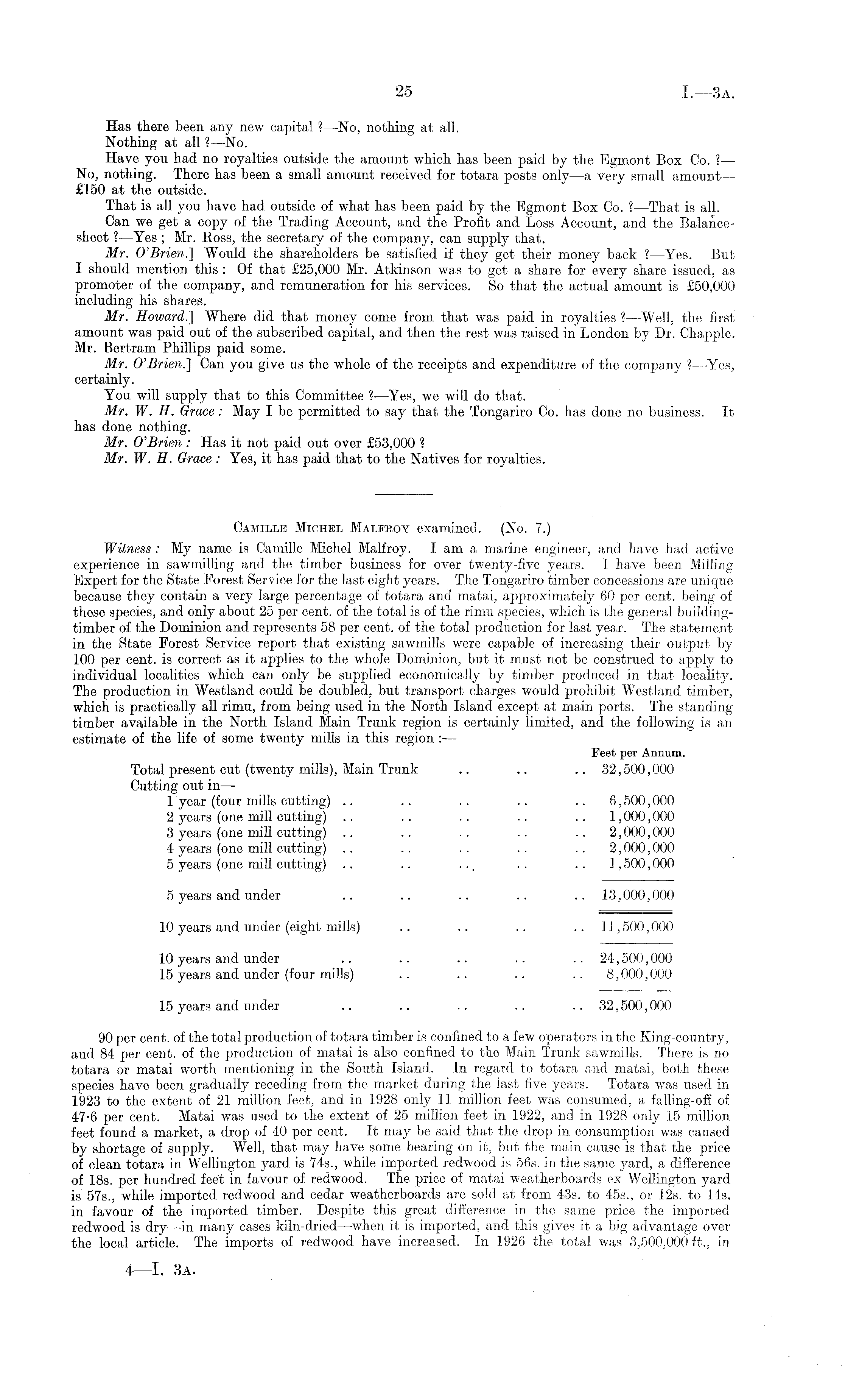 Has there been any new capital ? —No, nothing at all. Nothing at all ? —No. Have you had no royalties outside the amount which has been paid by the Egmont Box Co. ? — No, nothing. There has been a small amount received lor totara posts only—a very small amount — £150 at the outside. That is all you have had outside of what has been paid by the Egmont Box Co. ?—That is all. Can we get a copy of the Trading Account, and the Profit and Loss Account, and the Balancesheet ?—Yes ; Mr. Ross, the secretary of the company, can supply that. Mr. o'Brien.\ Would the shareholders be satisfied if they get their money back ?—Yes. But I should mention this : Of that £25,000 Mr. Atkinson was to get a share for every share issued, as promoter of the company, and remuneration for his services. So that the actual amount is £50,000 including his shares. Mr. Howard.\ Where did that money come from that was paid in royalties ?—Well, the first amount was paid out of the subscribed capital, and then the rest was raised in London by Dr. Chappie. Mr. Bertram Phillips paid some. Mr. O'Brien.] Can you give us the whole of the receipts and expenditure of the company ? —Yes, certainly. You will supply that to this Committee I—Yes,1 —Yes, we will do that. Mr. W. H. Grace: May Ibe permitted to say that the Tongariro Co. has done no business. It has done nothing. Mr. O'Brien : Has it not paid out over £53,000 ? Mr. W. H. Grace : Yes, it has paid that to the Natives for royalties. Camille Michel Malfeoy examined. (No. 7.) Witness : My name is Camille Michel Malfroy. lam a marine engineer, and have had active experience in sawmilling and the timber business for over twenty-five years. I have been Milling Expert for the State Forest Service for the last eight years. The Tongariro timber concessions are unique because they contain a very large percentage of totara and Hiatal, approximately 60 per cent, being of these species, and only about 25 per cent, of the total is of the rimu species, which is the general buildingtimber of the Dominion and represents 58 per cent, of the total production for last year. The statement in the State Forest Service report that existing sawmills were capable of increasing their output by 100 per cent, is correct as it applies to the whole Dominion, but it must not be construed to apply to individual localities which can only be supplied economically by timber produced in that locality. The production in Westland could be doubled, but transport charges would prohibit Westland timber, which is practically all rimu, from being used in the North Island except at main ports. The standing timber available in the North Island Main Trunk region is certainly limited, and the following is an estimate of the life of some twenty mills in this region : — Feet per Annum. Total present out (twenty mills), Main Trunk .. .. .. 32,500,000 Cutting out in— 1 year (four mills cutting) .. .. .. .. .. 6,500,000 2 years (one mill cutting) .. .. .. . . . . 1,000,000 3 years (one mill cutting) .. .. .. .. .. 2,000,000 4 years (one mill cutting) .. .. .. .. .. 2,000,000 5 years (one mill cutting) .. .. ... . . .. 1,500,000 5 years and under .. .. .. .. .. 13,000,000 10 years and under (eight mills) .. .. .. .. 11,500,000 10 years and under .. .. .. .. .. 24,500,000 15 years and under (four mills) .. .. .. .. 8,000,000 15 years and under .. .. .. .. .. 32,500,000 90 per cent, of the total production of totara timber is confined to a few operators in the King-country, and 84 per cent, of the production of matai is also confined to the Main Trunk sawmills. There is no totara or matai worth mentioning in the South Island. In regard to totara and matai, both these species have been gradually receding from the market during the last five years. Totara was used in 1923 to the extent of 21 million feet, and in 1928 only 11 million feet was consumed, a falling-off of 47-6 per cent. Matai was used to the extent of 25 million feet in 1922, and in 1928 only 15 million feet found a market, a drop of 40 per cent. It may be said that the drop in consumption was caused by shortage of supply. Well, that may have some bearing on it, but the main cause is that the price of clean totara in Wellington yard is 745., while imported redwood is 565. in the same yard, a difference of 18s. per hundred feet in favour of redwood. The price of matai weatherboards ex Wellington yard is 575., while imported redwood and cedar weatherboards are sold at from 435. to 455., or 12s. to 14s. in favour of the imported timber. Despite this great difference in the same price the imported redwood is dry—in many cases kiln-dried —when it is imported, and this gives it a big advantage over the local article. The imports of redwood have increased. In 1926 the total was 3,500,000 ft., in