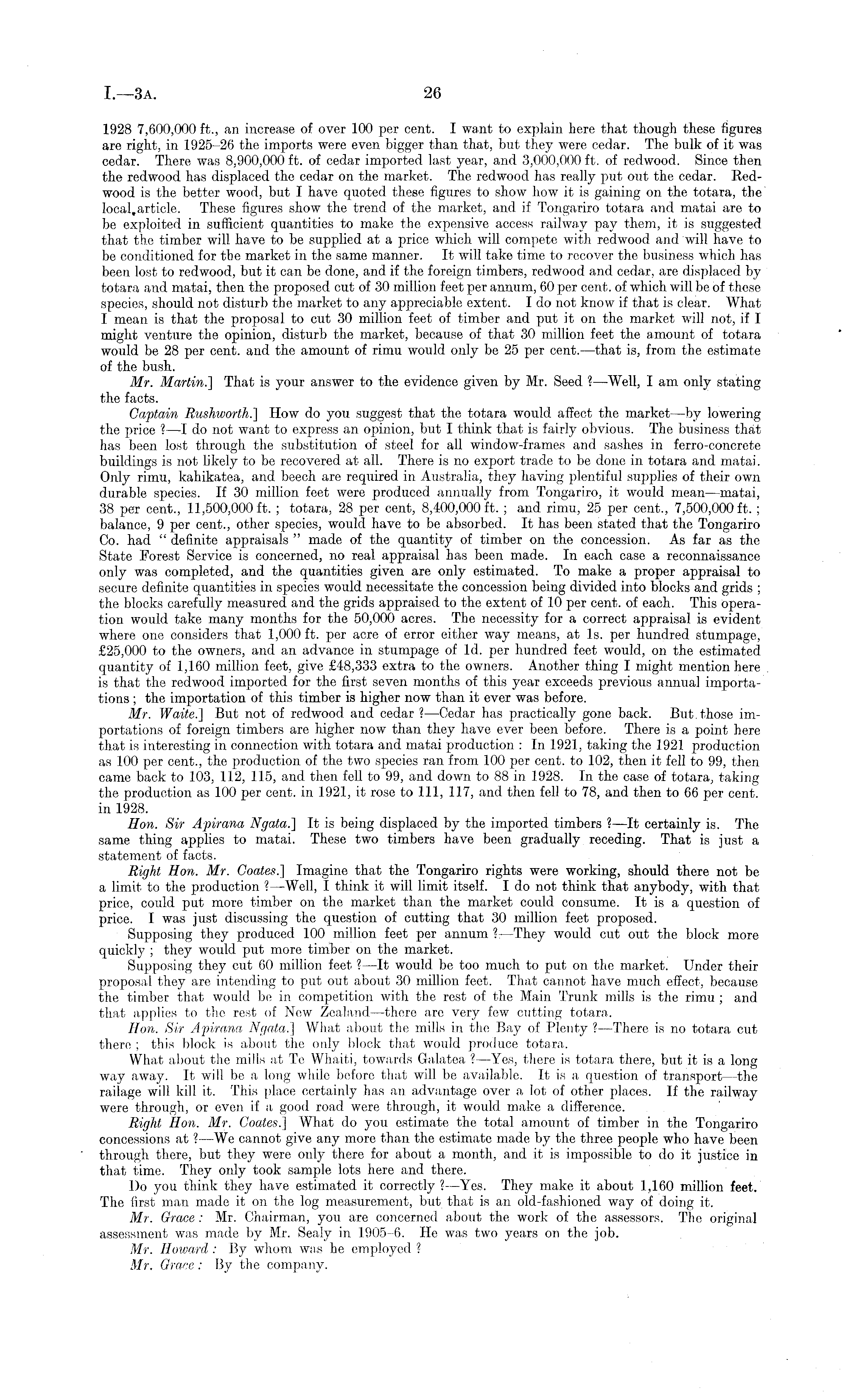 1928 7,600,000 ft., an increase of over 100 per cent. I want to explain here that though these figures are right, in 1925-26 the imports were even bigger than that, but they were cedar. The bulk of it was cedar. There was 8,900,000 ft. of cedar imported last year, and 3,000,000 ft. of redwood. Since then the redwood has displaced the cedar on the market. The redwood has really put out the cedar. Redwood is the better wood, but I have quoted these figures to show how it is gaining on the totara, the local.article. These figures show the trend of the market, and if Tongariro totara and matai are to be exploited in sufficient quantities to make the expensive access railway pay them, it is suggested that the timber will have to be supplied at a price which will compete with redwood and will have to be conditioned for the market in the same manner. It will take time to recover the business which has been lost to redwood, but it can be done, and if the foreign timbers, redwood and cedar, are displaced by totara and matai, then the proposed cut of 30 million feet per annum, 60 per cent, of which will be of these species, should not disturb the market to any appreciable extent. Ido not know if that is clear. What I mean is that the proposal to cut 30 million feet of timber and put it on the market will not, if I might venture the opinion, disturb the market, because of that 30 million feet the amount of totara would be 28 per cent, and the amount of rimu would only be 25 per cent. —that is, from the estimate of the bush. Mr. Martin.] That is your answer to the evidence given by Mr. Seed ? —Well, I am only stating the facts. Captain Rushworth.\ How do you suggest that the totara would affect the market—by lowering the price ? —I do not want to express an opinion, but I think that is fairly obvious. The business that has been lost through the substitution of steel for all window-frames and sashes in ferro-concrete buildings is not likely to be recovered at all. There is no export trade to be done in totara and matai. Only rimu, kahikatea, and beech are required in Australia, they having plentiful supplies of their own durable species. If 30 million feet were produced annually from Tongariro, it would mean —matai, 38 per cent., 11,500,000 ft. ; totara, 28 per cent, 8,400,000 ft. ; and rimu, 25 per cent., 7,500,000 ft.; balance, 9 per cent., other species, would have to be absorbed. It has been stated that the Tongariro Co. had " definite appraisals " made of the quantity of timber on the concession. As far as the State Forest Service is concerned, no real appraisal has been made. In each case a reconnaissance only was completed, and the quantities given are only estimated. To make a proper appraisal to secure definite quantities in species would necessitate the concession being divided into blocks and grids ; the blocks carefully measured and the grids appraised to the extent of 10 per cent, of each. This operation would take many months for the 50,000 acres. The necessity for a correct appraisal is evident where one considers that 1,000 ft. per acre of error either way means, at Is. per hundred stumpage, £25,000 to the owners, and an advance in stumpage of Id. per hundred feet would, on the estimated quantity of 1,160 million feet, give £48,333 extra to the owners. Another thing I might mention here is that the redwood imported for the first seven months of this year exceeds previous annual importations ; the importation of this timber is higher now than it ever was before. Mr. Waite.] But not of redwood and cedar ? —Cedar has practically gone back. But. those importations of foreign timbers are higher now than they have ever been before. There is a point here that is interesting in connection with totara and matai production : In 1921, taking the 1921 production as 100 per cent., the production of the two species ran from 100 per cent, to 102, then it fell to 99, then came back to 103, 112, 115, and then fell to 99, and down to 88 in 1928. In the case of totara, taking the production as 100 per cent, in 1921, it rose to 111, 117, and then fell to 78, and then to 66 per cent, in 1928. Hon. Sir Apirana Ngata.~\ It is being displaced by the imported timbers ? —lt certainly is. The same thing applies to matai. These two timbers have been gradually receding. That is just a statement of facts. Right Hon. Mr. Goates.] Imagine that the Tongariro rights were working, should there not be a limit to the production ? —Well, I think it will limit itself. Ido not think that anybody, with that price, could put more timber on the market than the market could consume. It is a question of price. I was just discussing the question of cutting that 30 million feet proposed. Supposing they produced 100 million feet per annum I. —They would cut out the block more quickly ; they would put more timber on the market. Supposing they cut 60 million feet ? —lt would be too much to put on the market. Under their proposal they are intending to put out about 30 million feet. That cannot have much effect, because the timber that would be in competition with the rest of the Main Trunk mills is the rimu ; and that applies to the rest of New Zealand —there are very few cutting totara. Hon. Sir Apirana Ngata.] What about the mills in the Bay of Plenty ? —There is no totara cut there ; this block is about the only block that would produce totara. What about the mills at Te Whaiti, towards Galatea ? —Yes, there is totara there, but it is a long way away. It will be a long while before that will be available. It is a question of transport—the railage will kill it. This place certainly has an advantage over a lot of other places. If the railway were through, or even if a good road were through, it woidd make a difference. Right Hon. Mr. Goates.] What do you estimate the total amount of timber in the Tongariro concessions at ?—We cannot give any more than the estimate made by the three people who have been