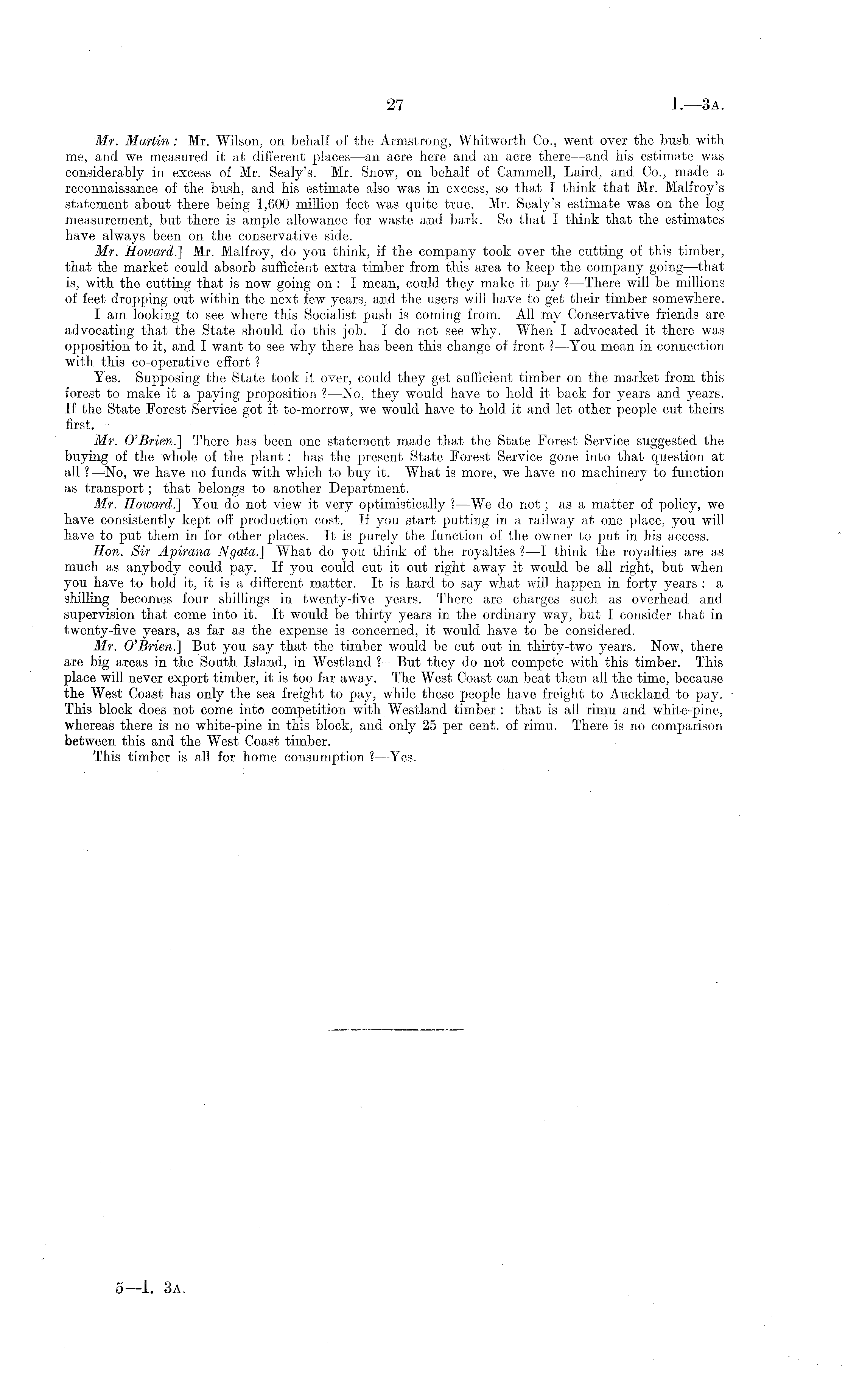 Mr. Martin : Mr. Wilson, on behalf of tie Armstrong, Whitworth Co., went over the bush with me, and we measured it at different places —an acre here and an acre there —and his estimate was considerably in excess of Mr. Sealy's. Mr. Snow, on behalf of Cammell, Laird, and Co., made a reconnaissance of the bush, and his estimate also was in excess, so that I think that Mr. Malfroy's statement about there being 1,600 million feet was quite true. Mr. Sealy's estimate was on the log measurement, but there is ample allowance for waste and bark. So that I think that the estimates have always been on the conservative side. Mr. Howard.] Mr. Malfroy, do you think, if the company took over the cutting of this timber, that the market could absorb sufficient extra timber from this area to keep the company going—that is, with the cutting that is now going on : I mean, could they make it pay ?—There will be millions of feet dropping out within the next few years, and the users will have to get their timber somewhere. I am looking to see where this Socialist push is coming from. All my Conservative friends are advocating that the State should do this job. I do not see why. When I advocated it there was opposition to it, and I want to see why there has been this change of front ? —You mean in connection with this co-operative effort ? Yes. Supposing the State took it over, could they get sufficient timber on the market from this forest to make it a paying proposition ? —No, they would have to hold it back for years and years. If the State Forest Service got it to-morrow, we would have to hold it and let other people cut theirs first. Mr. O'Brien.'] There has been one statement made that the State Forest Service suggested the buying of the whole of the plant: has the present State Forest Service gone into that question at all I—No,1 —No, we have no funds with which to buy it. What is more, we have no machinery to function as transport; that belongs to another Department. Mr. Howard.'] You do not view it very optimistically ? —We do not; as a matter of policy, we have consistently kept off production cost. If you start putting in a railway at one place, you will have to put them in for other places. It is purely the function of the owner to put in his access. Hon. Sir Apirana Ngata.] What do you think of the royalties ? —1 think the royalties are as much as anybody could pay. If you could cut it out right away it would be all right, but when you have to hold it, it is a different matter. It is hard to say what will happen in forty years : a shilling becomes four shillings in twenty-five years. There are charges such as overhead and supervision that come into it. It would be thirty years in the ordinary way, but I consider that in twenty-five years, as far as the expense is concerned, it would have to be considered. Mr. O'Brien.] But you say that the timber would be cut out in thirty-two years. Now, there are big areas in the South Island, in Westland ? —But they do not compete with this timber. This place will never export timber, it is too far away. The West Coast can beat them all the time, because the West Coast has only the sea freight to pay, while these people have freight to Auckland to pay. This block does not come into competition with Westland timber : that is all rimu and white-pine, whereas there is no white-pine in this block, and only 25 per cent, of rimu. There is no comparison between this and the West Coast timber. This timber is all for home consumption ?—Yes.