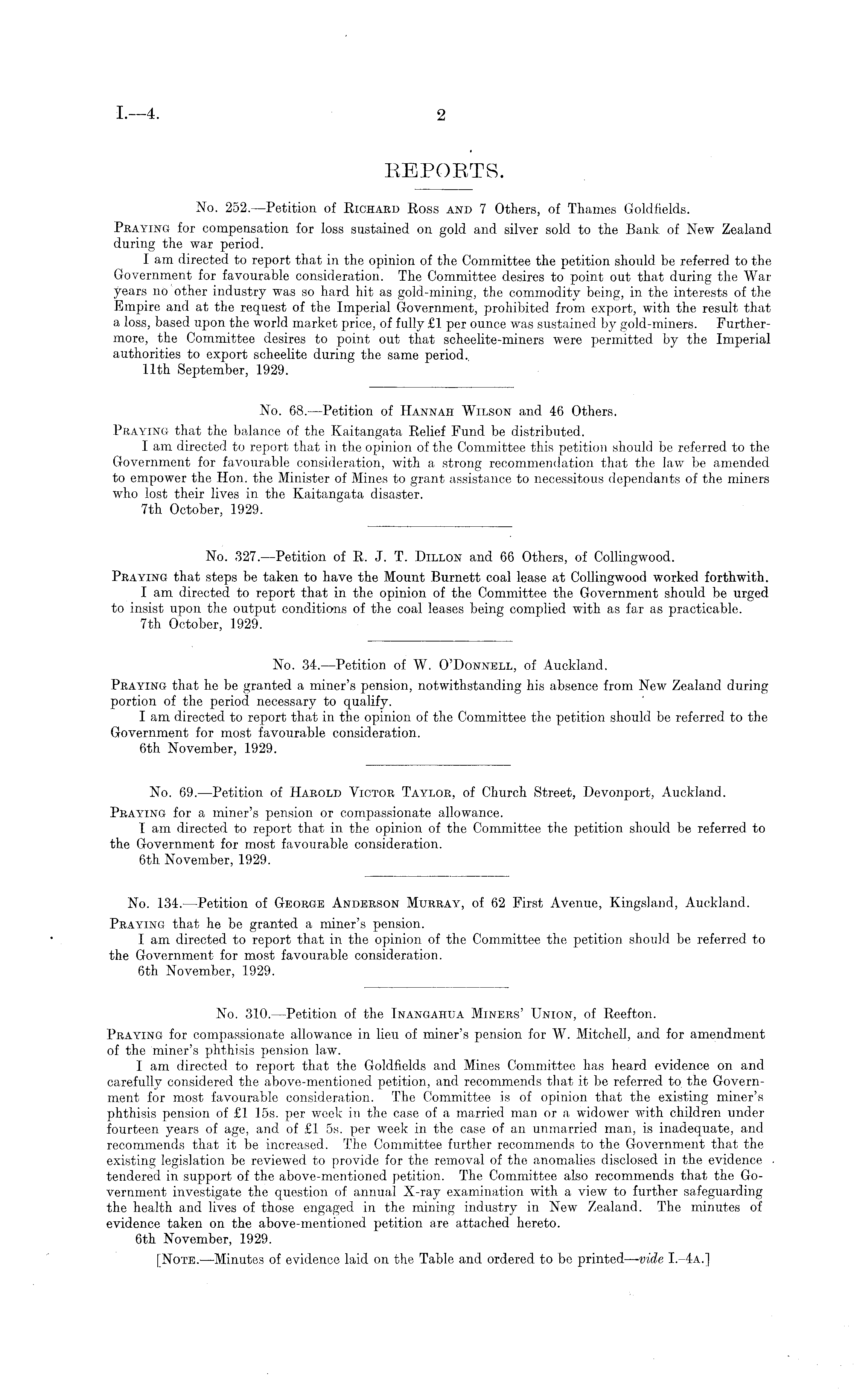No. 310.—Petition of the Inangahua Miners' Union, of Reefton. Praying for compassionate allowance in lieu of miner's pension for W. Mitchell, and for amendment of the miner's phthisis pension law. I am directed to report that the Goldfields and Mines Committee has heard evidence on and carefully considered the above-mentioned petition, and recommends that it be referred to the Government for most favourable consideration. The Committee is of opinion that the existing miner's phthisis pension of £1 15s. per week in the case of a married man or a widower with children under fourteen years of age, and of £1 ss. per week in the case of an unmarried man, is inadequate, and recommends that it be increased. The Committee further recommends to the Government that the existing legislation be reviewed to provide for the removal of the anomalies disclosed in the evidence tendered in support of the above-mentioned petition. The Committee also recommends that the Government investigate the question of annual X-ray examination with a view to further safeguarding the health and lives of those engaged in the mining industry in New Zealand. The minutes of evidence taken on the above-mentioned petition are attached hereto. 6th November, 1929. [Note. —Minutes of evidence laid on the Table and ordered to be printed—vide 1.-4 a.]