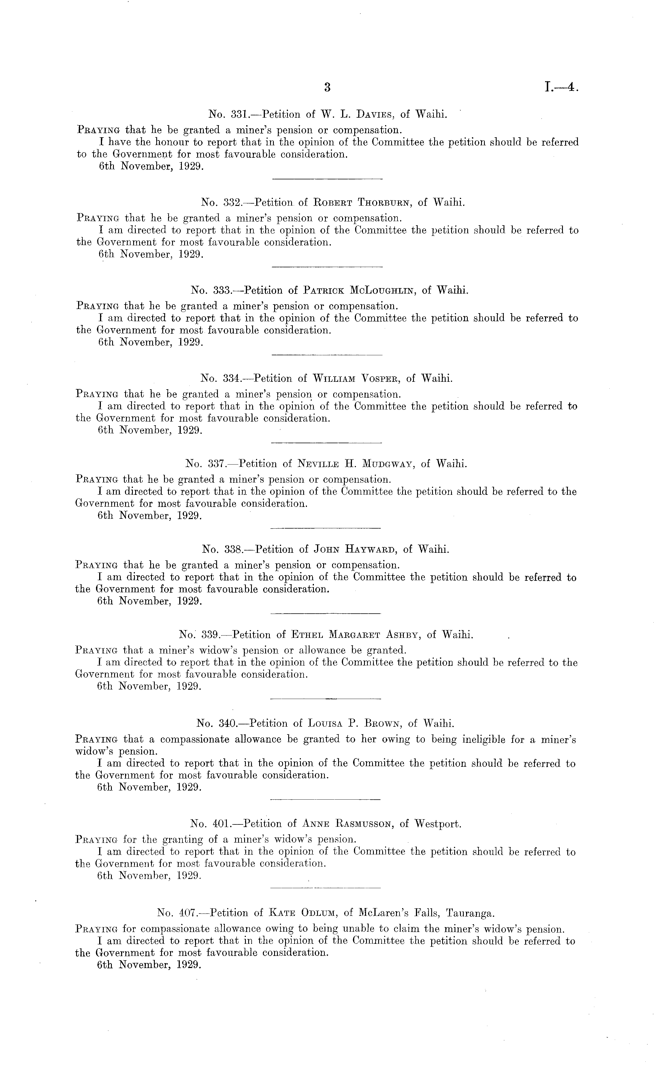 No. 338. —Petition of John Hayward, of Waihi. Praying that he be granted a miner's pension or compensation. I am directed to report that in the opinion of the Committee the petition should be referred to the Government for most favourable consideration. 6th November, 1929.