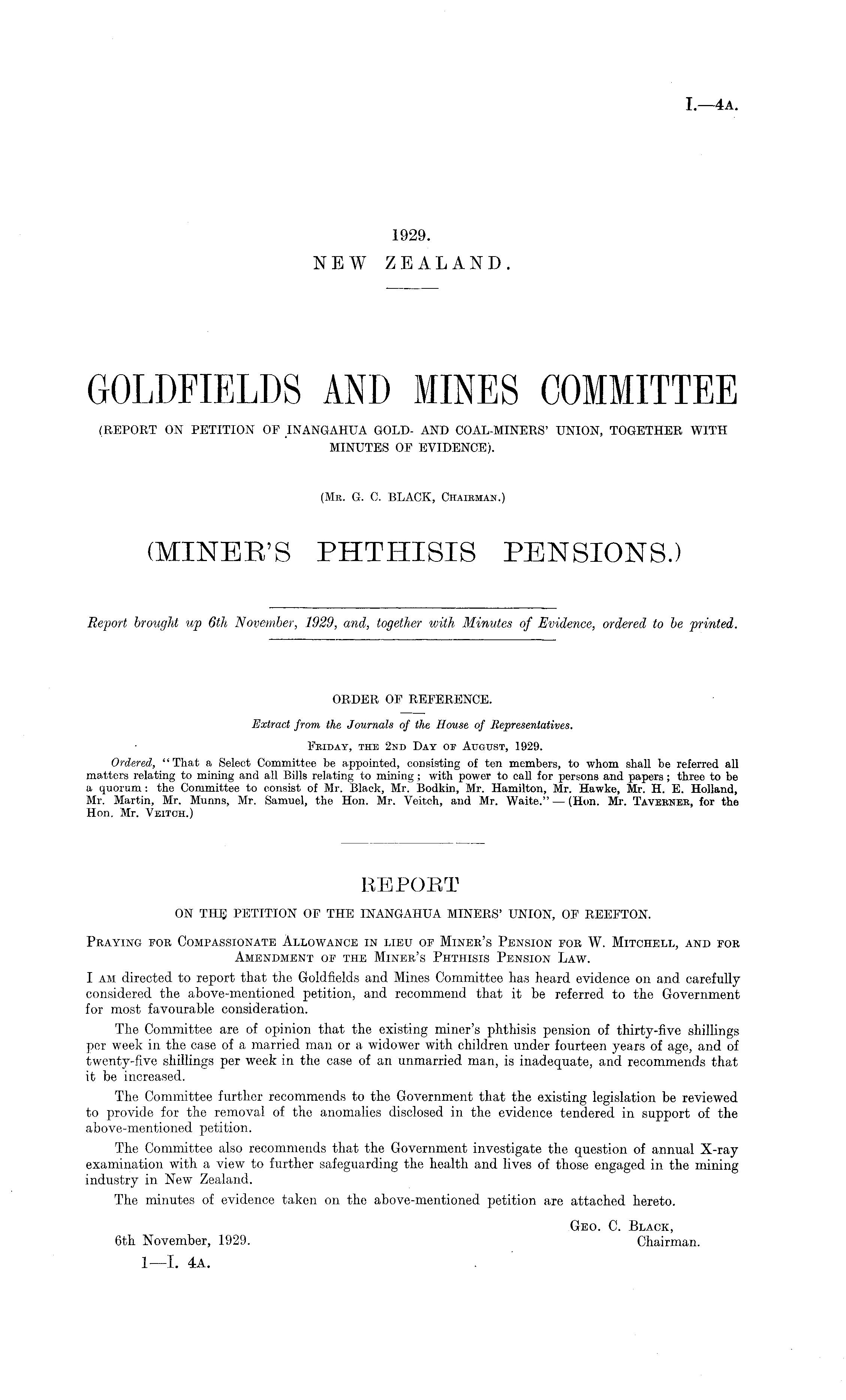 REPORT ON THE PETITION OF THE INANGAHUA MINERS' UNION, OP REEFTON. Praying for Compassionate Allowance in lieu of Miner's Pension for W. Mitchell, and for Amendment of the Miner's Phthisis Pension Law. I am directed to report that the Goldfields and Mines Committee has heard evidence on and carefully considered the above-mentioned petition, and recommend that it be referred to the Government for most favourable consideration. The Committee are of opinion that the existing miner's phthisis pension of thirty-five shillings per week in the case of a married man or a widower with children under fourteen years of age, and of twenty-five shillings per week in the case of an unmarried man, is inadequate, and recommends that it be increased. The Committee further recommends to the Government that the existing legislation be reviewed to provide for the removal of the anomalies disclosed in the evidence tendered in support of the above-mentioned petition. The Committee also recommends that the Government investigate the question of annual X-ray examination with a view to further safeguarding the health and lives of those engaged in the mining industry in New Zealand. The minutes of evidence taken on the above-mentioned petition are attached hereto. Geo. C. Black, 6th November, 1929. Chairman.