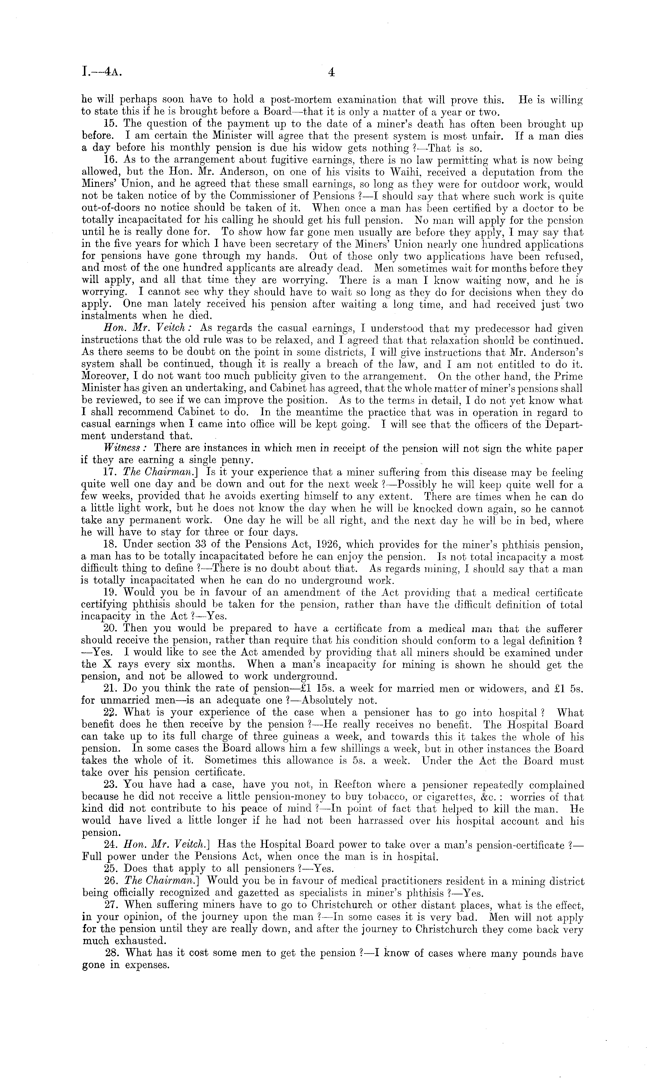lie will perhaps soon have to hold a post-mortem examination that will prove this. He is willing to state this if he is brought before a Board—that it is only a matter of a year or two. 15. The question of the payment up to the date of a miner's death has often been brought up before. lam certain the Minister will agree that the present system is most unfair. If a man dies a day before his monthly pension is due his widow gets nothing ?—That is so. 16. As to the arrangement about fugitive earnings, there is no law permitting what is now being allowed, but the Hon. Mr. Anderson, on one of his visits to Waihi, received a deputation from the Miners' Union, and he agreed that these small earnings, so long as they were for outdoor work, would not be taken notice of by the Commissioner of Pensions ? —I should say that where such work is quite out-of-doors no notice should be taken of it. When once a man has been certified by a doctor to be totally incapacitated for his calling he should get his full pension. No man will apply for the pension until he is really done for. To show how far gone men usually are before they apply, I may say that in the five years for which I have been secretary of the Miners' Union nearly one hundred applications for pensions have gone through my hands. Out of those only two applications have been refused, and most of the one hundred applicants are already dead. Men sometimes wait for months before they will apply, and all that time they are worrying. There is a man I know waiting now, and he is worrying. I cannot see why they should have to wait so long as they do for decisions when they do apply. One man lately received his pension after waiting a long time, and had received just two instalments when he died. Hon. Mr. Veitch : As regards the casual earnings, I understood that my predecessor had given instructions that the old rule was to be relaxed, and I agreed that that relaxation should be continued. As there seems to be doubt on the point in some districts, I will give instructions that Mr. Anderson's system shall be continued, though it is really a breach of the law, and I am not entitled to do it. Moreover, Ido not want too much publicity given to the arrangement. On the other hand, the Prime Minister has given an undertaking, and Cabinet has agreed, that the whole matter of miner's pensions shall be reviewed, to see if we can improve the position. As to the terms in detail, Ido not yet know what I shall recommend Cabinet to do. In the meantime the practice that was in operation in regard to casual earnings when I came into office will be kept going. I will see that the officers of the Department understand that. Witness : There are instances in which men in receipt of the pension will not sign the white paper if they are earning a single penny. 17. The Chairman.] Is it your experience that a miner suffering from this disease may be feeling quite well one day and be down and out for the next week ? —Possibly he will keep quite well for a few weeks, provided that he avoids exerting himself to any extent. There are times when he can do a little light work, but he does not know the day when he will be knocked down again, so he cannot take any permanent work. One day he will be all right, and the next day he will be in bed, where he will have to stay for three or four days. 18. Under section 33 of the Pensions Act, 1926, which provides for the miner's phthisis pension, a man has to be totally incapacitated before he can enjoy the pension. Is not total incapacity a most difficult thing to define ?—There is no doubt about that. As regards mining, I should say that a man is totally incapacitated when he can do no underground work. 19. Would you be in favour of an amendment of the Act providing that a medical certificate certifying phthisis should be taken for the pension, rather than have the difficult definition of total incapacity in the Act ? —Yes. 20. Then you would be prepared to have a certificate from a medical man that the sufferer should receive the pension, rather than require that his condition should conform to a legal definition ? —Yes. I would like to see the Act amended by providing that all miners should be examined under the X rays every six months. When a man's incapacity for mining is shown he should get the pension, and not be allowed to work underground. 21. Do you think the rate of pension—£l 15s. a week for married men or widowers, and £1 ss. for unmarried men —is an adequate one ?—Absolutely not. 22. What is your experience of the case when a pensioner has to go into hospital ? What benefit does he then receive by the pension ?—He really receives no benefit. The Hospital Board can take up to its full charge of three guineas a week, and towards this it takes the whole of his pension. In some cases the Board allows him a few shillings a week, but in other instances the Board takes the whole of it. Sometimes this allowance is ss. a week. Under the Act the Board must take over his pension certificate. 23. You have had a case, have you not, in Eeefton where a pensioner repeatedly complained because he did not receive a little pension-money to buy tobacco, or cigarettes, &c. : worries of that kind did not contribute to his peace of mind ?—ln point of fact that helped to kill the man. He would have lived a little longer if he had not been harrassed over his hospital account and his pension. 24. Hon. Mr. Veitch.] Has the Hospital Board power to take over a man's pension-certificate ?•— Full power under the Pensions Act, when once the man is in hospital. 25. Does that apply to all pensioners ? —Yes. 26. The Chairman.] Would you be in favour of medical practitioners resident in a mining district being officially recognized and gazetted as specialists in miner's phthisis ? —Yes. 27. When suffering miners have to go to Christchurch or other distant places, what is the effect, in your opinion, of the journey upon the man