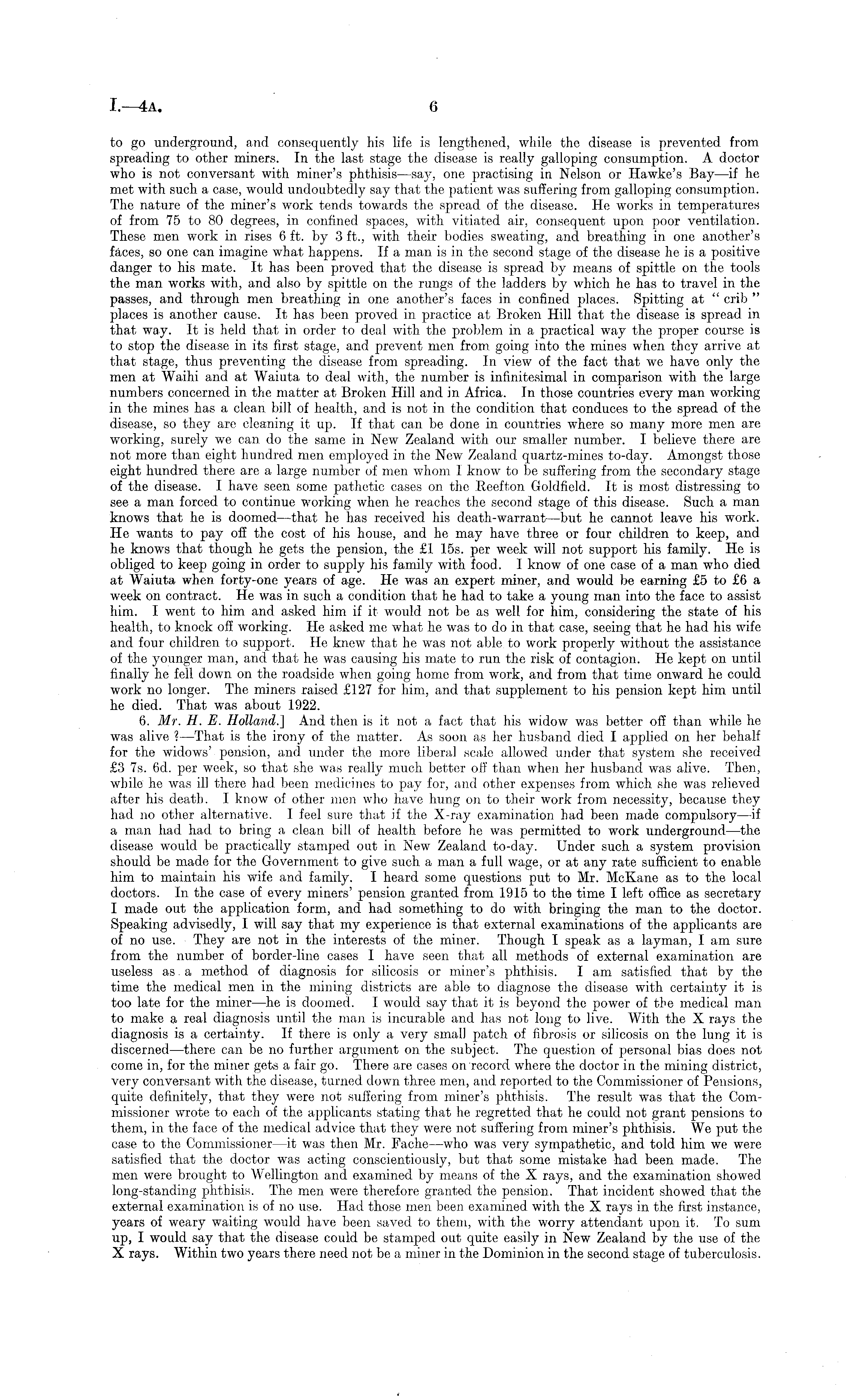 to go underground, and consequently his life is lengthened, while the disease is prevented from spreading to other miners. In the last stage the disease is really galloping consumption. A doctor who is not conversant with miner's phthisis —say, one practising in Nelson or Hawke's Bay —if he met with such a case, would undoubtedly say that the patient was suffering from galloping consumption. The nature of the miner's work tends towards the spread of the disease. He works in temperatures of from 75 to 80 degrees, in confined spaces, with vitiated air, consequent upon poor ventilation. These men work in rises 6 ft. by 3 ft., with their bodies sweating, and breathing in one another's faces, so one can imagine what happens. If a man is in the second stage of the disease he is a positive danger to his mate. It has been proved that the disease is spread by means of spittle on the tools the man works with, and also by spittle on the rungs of the ladders by which he has to travel in the passes, and through men breathing in one another's faces in confined places. Spitting at " crib " places is another cause. It has been proved in practice at Broken Hill that the disease is spread in that way. It is held that in order to deal with the problem in a practical way the proper course is to stop the disease in its first stage, and prevent men from going into the mines when they arrive at that stage, thus preventing the disease from spreading. In view of the fact that we have only the men at Waihi and at Waiuta to deal with, the number is infinitesimal in comparison with the large numbers concerned in the matter at Broken Hill and in Africa. In those countries every man working in the mines has a clean bill of health, and is not in the condition that conduces to the spread of the disease, so they are cleaning it up. If that can be done in countries where so many more men are working, surely we can do the same in New Zealand with our smaller number. I believe there are not more than eight hundred men employed in the New Zealand quartz-mines to-day. Amongst those eight hundred there are a large number of men whom 1 know to be suffering from the secondary stage of the disease. I have seen some pathetic cases on the Reefton Goldfield. It is most distressing to see a man forced to continue working when he reaches the second stage of this disease. Such a man knows that he is doomed—that he has received his death-warrant—but he cannot leave his work. He wants to pay off the cost of his house, and he may have three or four children to keep, and he knows that though he gets the pension, the £1 15s. per week will not support his family. He is obliged to keep going in order to supply his family with food. I know of one case of a man who died at Waiuta when forty-one years of age. He was an expert miner, and would be earning £5 to £6 a week on contract. He was in such a condition that he had to take a young man into the face to assist him. I went to him and asked him if it would not be as well for him, considering the state of his health, to knock off working. He asked me what he was to do in that case, seeing that he had his wife and four children to support. He knew that he was not able to work properly without the assistance of the younger man, and that he was causing his mate to run the risk of contagion. He kept on until finally he fell down on the roadside when going home from work, and from that time onward he could work no longer. The miners raised £127 for him, and that supplement to his pension kept him until he died. That was about 1922. 6. Mr. H. E. Holland.] And then is it not a fact that his widow was better off than while he was alive ?—That is the irony of the matter. As soon as her husband died I applied on her behalf for the widows' pension, and under the more liberal scale allowed under that system she received £3 7s. 6d. per week, so that she was really much better off than when her husband was alive. Then, while he was ill there had been medicines to pay for, and other expenses from which she was relieved after his death. I know of other men who have hung on to their work from necessity, because they had no other alternative. I feel sure that if the X-ray examination had been made compulsory —if a man had had to bring a clean bill of health before he was permitted to work underground —the disease would be practically stamped out in New Zealand to-day. Under such a system provision should be made for the Government to give such a man a full wage, or at any rate sufficient to enable him to maintain his wife and family. I heard some questions put to Mr. McKane as to the local doctors. In the case of every miners' pension granted from 1915 to the time I left office as secretary I made out the application form, and had something to do with bringing the man to the doctor. Speaking advisedly, I will say that my experience is that external examinations of the applicants are of no use. They are not in the interests of the miner. Though I speak as a layman, lam sure from the number of border-line cases I have seen that all methods of external examination are useless as. a method of diagnosis for silicosis or miner's phthisis. I am satisfied that by the time the medical men in the mining districts are able to diagnose the disease with certainty it is too late for the miner—he is doomed. I would say that it is beyond the power of the medical man to make a real diagnosis until the man is incurable and has not long to live. With the X rays the diagnosis is a certainty. If there is only a very small patch of fibrosis or silicosis on the lung it is discerned —there can be no further argument on the subject. The question of personal bias does not come in, for the miner gets a fair go. There are cases on record where the doctor in the mining district, very conversant with the disease, turned down three men, and reported to the Commissioner of Pensions, quite definitely, that they were not s