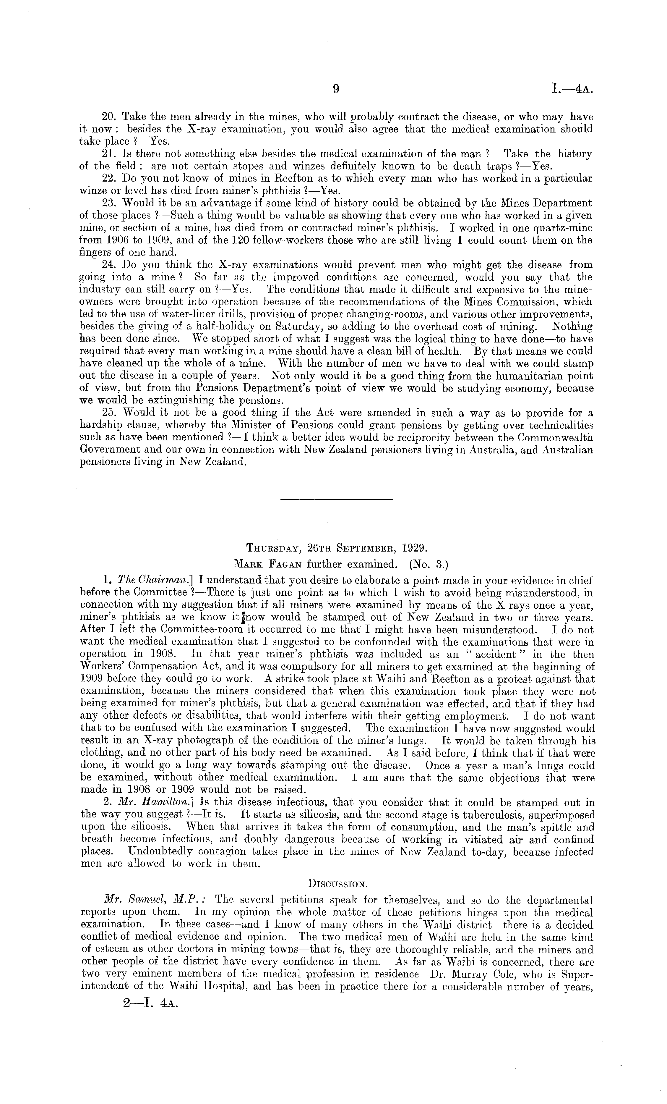 Thursday, 26th September, 1929. Mark Fag an further examined. (No. 3.) 1. The Chairman.] I understand that you desire to elaborate a point made in your evidence in chief before the Committee ? —There is just one point as to which I wish to avoid being misunderstood, in connection with my suggestion that if all miners were examined by means of the X rays once a year, miner's phthisis as we know it|now would be stamped out of New Zealand in two or three years. After I left the Committee-room it occurred to me that I might have been misunderstood. Ido not want the medical examination that I suggested to be confounded with the examinations that were in operation in 1908. In that year miner's phthisis was included as an " accident" in the then Workers' Compensation Act, and it was compulsory for all miners to get examined at the beginning of 1909 before they could go to work. A strike took place at Waihi and Reefton as a protest against that examination, because the miners considered that when this examination took place they were not being examined for miner's phthisis, but that a general examination was effected, and that if they had any other defects or disabilities, that would interfere with their getting employment. Ido not want that to be confused with the examination I suggested. The examination I have now suggested would result in an X-ray photograph of the condition of the miner's lungs. It would be taken through his clothing, and no other part of his body need be examined. As I said before, I think that if that were done, it would go a long way towards stamping out the disease. Once a year a man's lungs could be examined, without other medical examination. lam sure that the same objections that were made in 1908 or 1909 would not be raised. 2. Mr. Hamilton.] Is this disease infectious, that you consider that it could be stamped out in the way you suggest ? —lt is. It starts as silicosis, and the second stage is tuberculosis, superimposed upon the silicosis. When that arrives it takes the form of consumption, and the man's spittle and breath become infectious, and doubly dangerous because of working in vitiated air and confined places. Undoubtedly contagion takes place in the mines of New Zealand to-day, because infected men are allowed to work in them. Discussion. Mr. Samuel, M.P. : The several petitions speak for themselves, and so do the departmental reports upon them. In my opinion the whole matter of these petitions hinges upon the medical examination. In these cases—and I know of many others in the Waihi district—there is a decided conflict of medical evidence and opinion. The two medical men of Waihi are held in the same kind of esteem as other doctors in mining towns —that is, they are thoroughly reliable, and the miners and other people of the district have every confidence in them. As far as Waihi is concerned, there are two very eminent members of the medical profession in residence—Dr. Murray Cole, who is Superintendent of the Waihi Hospital, and has been in practice there for a considerable number of years,