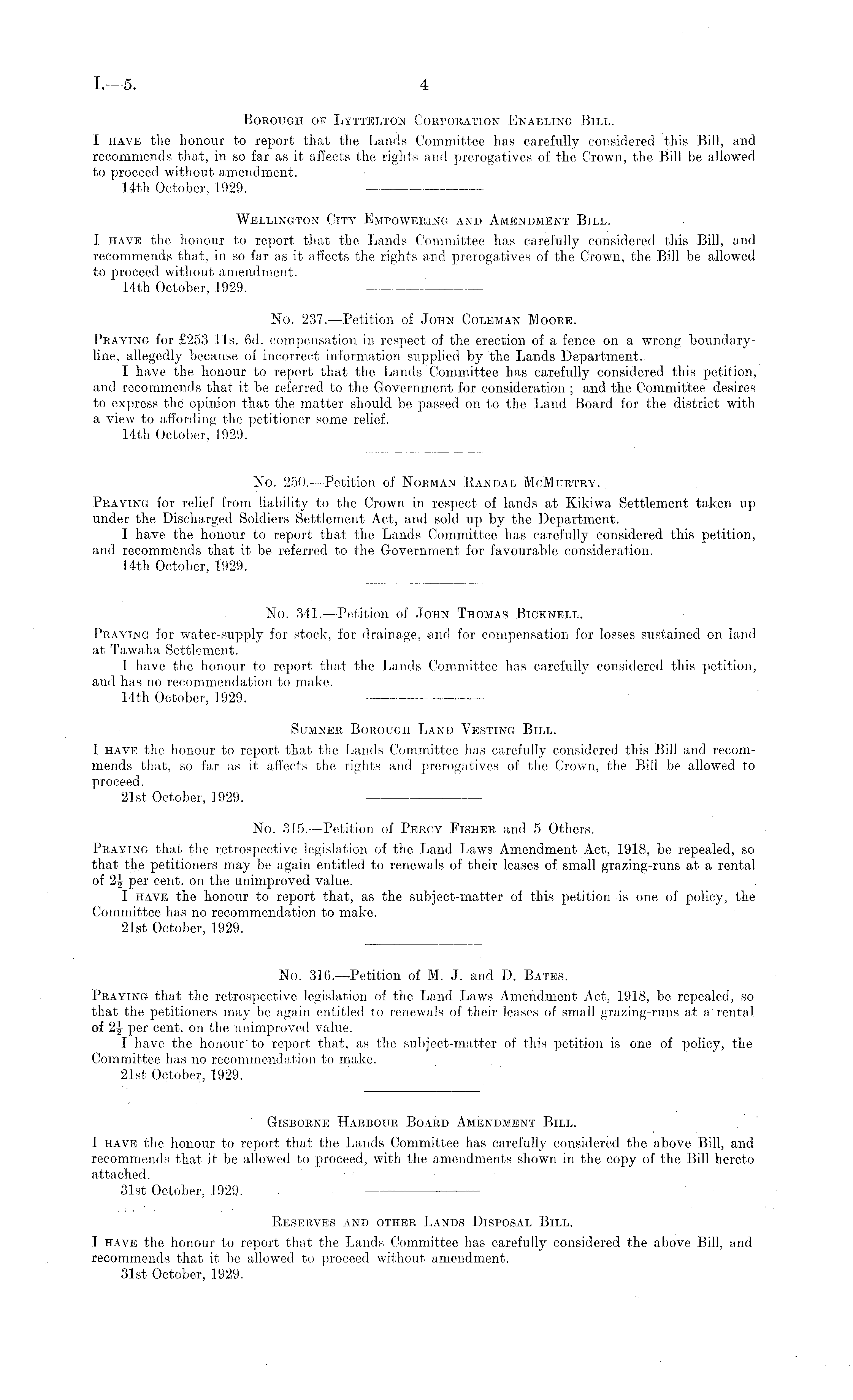 No. 237. —Petition of John Coleman Moore. Praying for £253 lis. 6d. compensation in respect of the erection of a fence on a wrong boundaryline, allegedly because of incorrect information supplied by the Lands Department. I have the honour to report that the Lands Committee has carefully considered this petition, and recommends that it be referred to the Government for consideration ; and the Committee desires to express the opinion that the matter should be passed on to the Land Board for the district with a view to affording the petitioner some relief. 14th October, 1929.