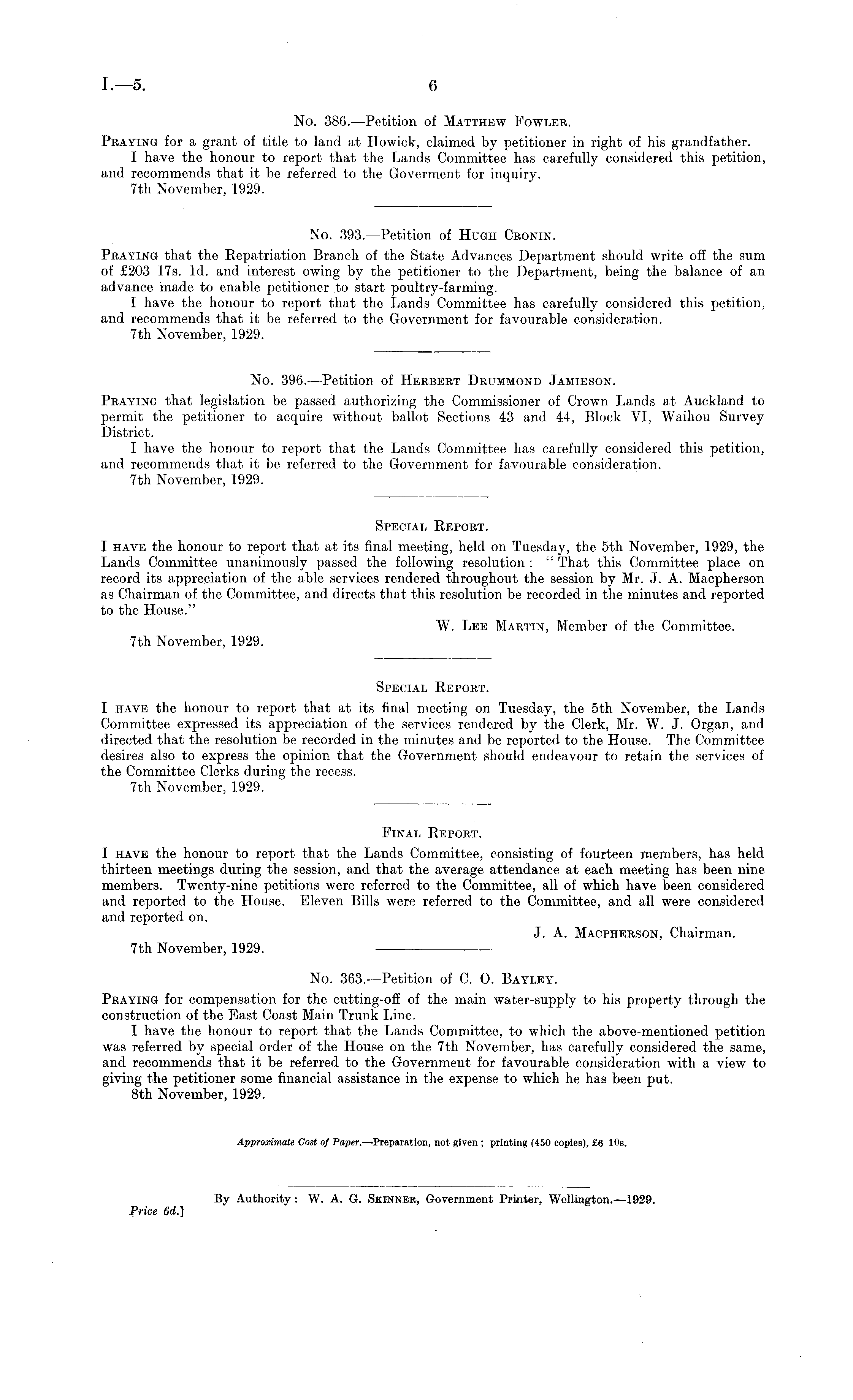 Special Report. I have the honour to report that at its final meeting, held on Tuesday, the sth November, 1929, the Lands Committee unanimously passed the following resolution : " That this Committee place on record its appreciation of the able services rendered throughout the session by Mr. J. A. Macpherson as Chairman of the Committee, and directs that this resolution be recorded in the minutes and reported to the House." W. Lee Martin, Member of the Committee. 7th November, 1929.