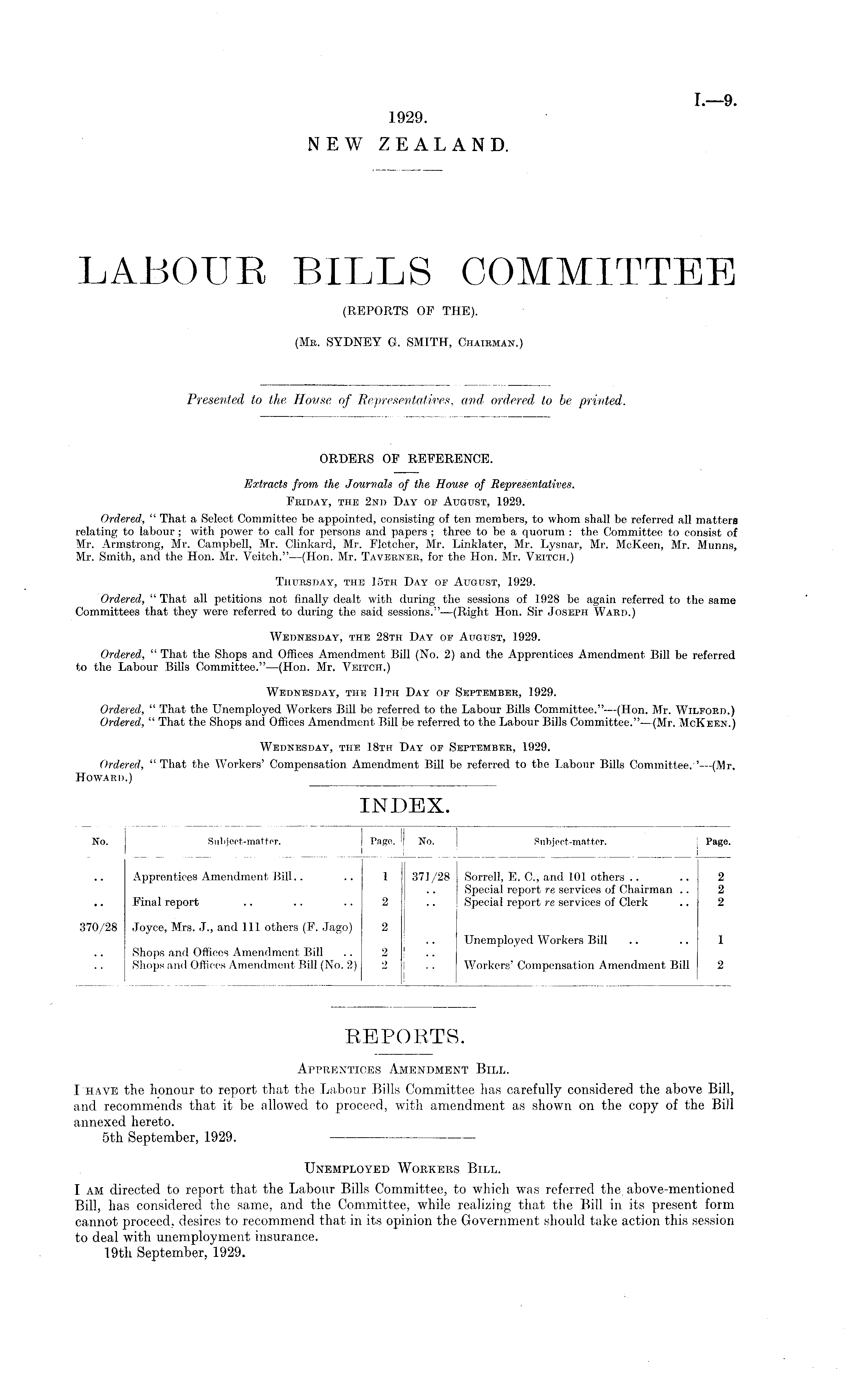 ORDERS OF REFERENCE. Extracts from the Journals of the House of Representatives. Friday, the 2nd 'Day of August, 1929. Ordered, " That a Select Committee be appointed, consisting of ten members, to whom shall be referred all matters relating to labour ; with power to call for persons and papers ; three to be a quorum : the Committee to consist of Mr. Armstrong, Mr. Campbell, Mr. Clinkard, Mr. Fletcher, Mr. Linklater, Mr. Lysnar, Mr. McKeert, Mr. Munns, Mr. Smith, and the Hon. Mr. Veitch."—(Hon. Mr. Taverner, for the Hon. Mr. Veitch.) Thursday, the 15th Day oe August, 1929. Ordered, "That all petitions not finally dealt with during the sessions of 1928 be again referred to the same Committees that they were referred to during the said sessions."—(Right Hon. Sir Joseph Ward.) Wednesday, the 28th Day of August, 1929. Ordered, " That the Shops and Offices Amendment Bill (No. 2) and the Apprentices Amendment Bill be referred to the Labour Bilis Committee."—(Hon. Mr. Veitch.) Wednesday, the Uth Day of September, 1929. Ordered, " That the Unemployed Workers Bill be referred to the Labour Bills Committee."—(Hon. Mr. Wilford.) Ordered, " That the Shops and Offices Amendment Bill be referred to the Labour Bills Committee."—(Mr. McKeen.) Wednesday, the 18th Day of September, 1929. Ordered, " That the Workers' Compensation Amendment Bill be referred to the Labour Bills Committee. ' —(Mr. Howard.)
