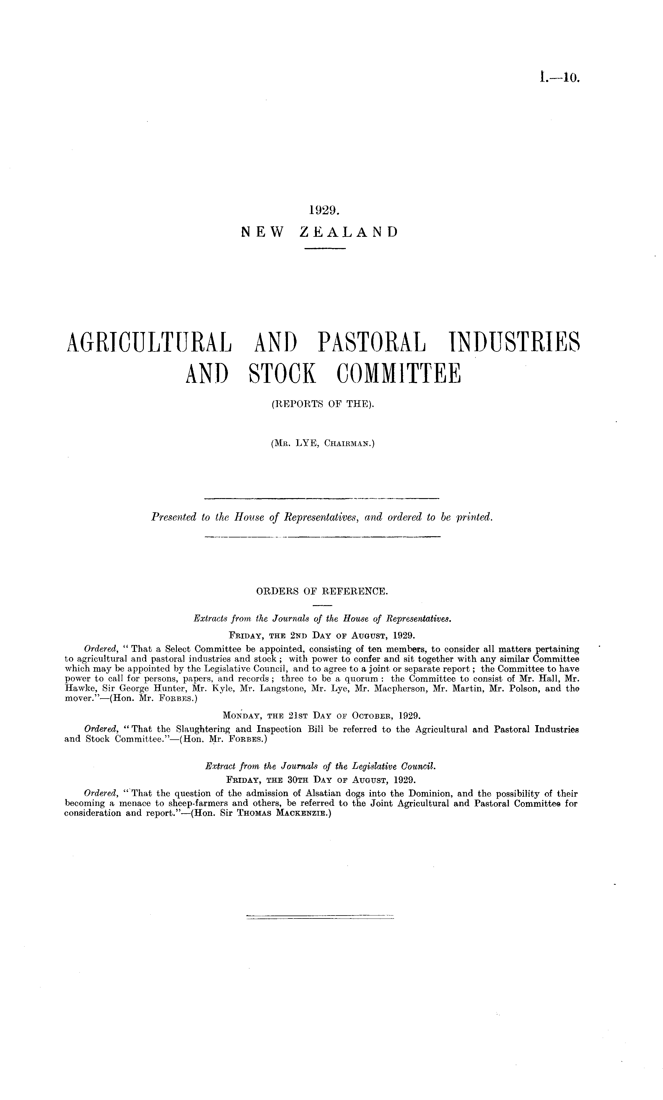 ORDERS OF REFERENCE. Extracts from the Journals of the House of Representatives. Friday, the 2nd Day of August, 1929. Ordered, " That a Select Committee be appointed, consisting of ten members, to consider all matters pertaining to agricultural and pastoral industries and stock ; with power to confer and sit together with any similar Committee which may be appointed by the Legislative Council, and to agree to a joint or separate report; the Committee to have power to call for persons, papers, and records ; three to be a quorum : the Committee to consist of Mr. Hall, Mr. Hawke, Sir George Hunter, Mr. Kyle, Mr. Langstone, Mr. Lye, Mr. Macpherson, Mr. Martin, Mr. Poison, and the mover." —(Hon. Mr. Forbes.) Monday, the 21st Day of October, 1929. Ordered, " That the Slaughtering and Inspection Bill be referred to the Agricultural and Pastoral Industries and Stock Committee." —(Hon. Mr. Forbes.) Extract from the Journals of the Legislative Council. Friday, the 30th Day of August, 1929. Ordered, " That the question of the admission of Alsatian dogs into the Dominion, and the possibility of their becoming a menace to sheep-farmers and others, be referred to the Joint Agricultural and Pastoral Committee for consideration and report."—(Hon. Sir Thomas Mackenzie.)