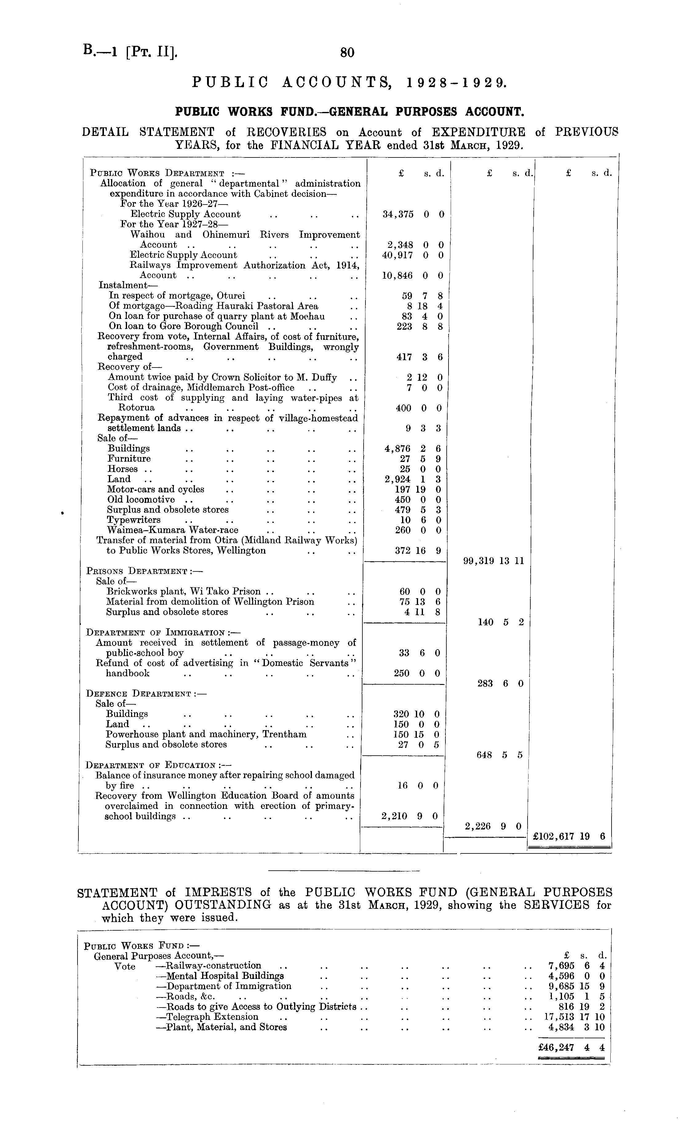 Public Works Fund :— General Purposes Account, — £ s. d. Vote -Railway-construction .. .. .. .. .. .. .. 7,695 6 4 —Mental Hospital Buildings .. .. .. .. .. .. 4,596 0 0 —Department of Immigration .. .. .. .. .. .. 9,685 15 9 —Roads, &c. .. .. .. .. .. .. .. 1,105 1 5 —Roads to give Access to Outlying Districts .. .. .. . . .. 816 19 2 —Telegraph Extension .. .. .. .. .. .. .. 17,513 17 10 —Plant, Material, and Stores .. .. .. .. .. .. 4,834 3 10 £46,247 4 4