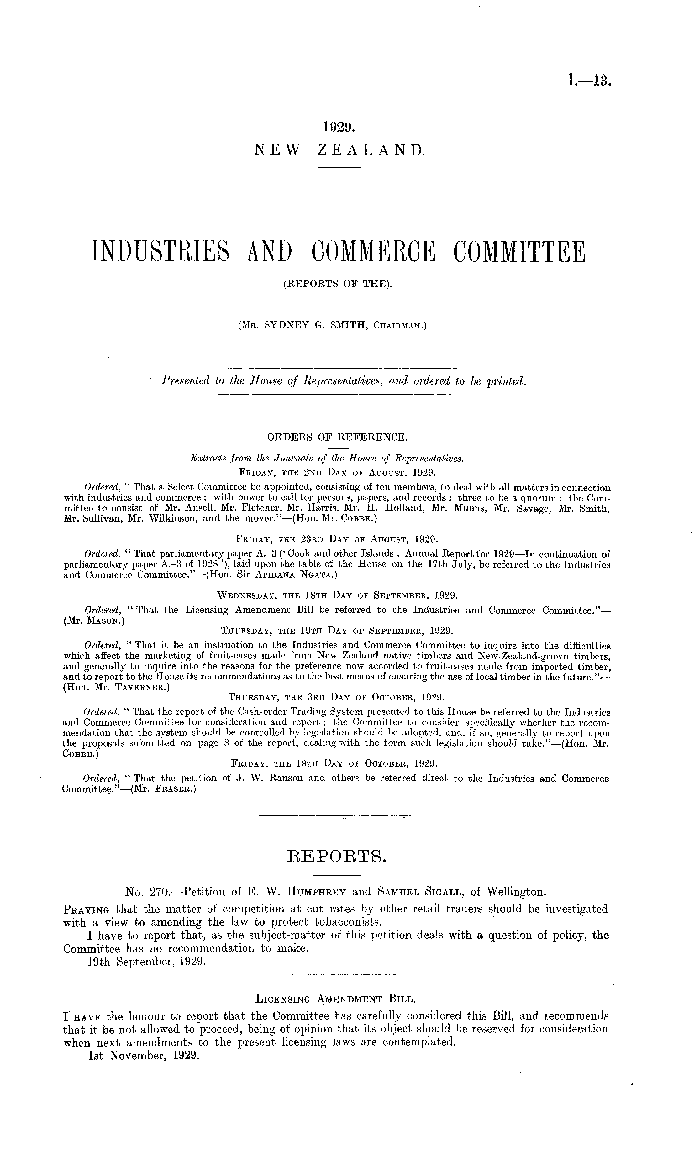 ORDERS OF REFERENCE. Extracts from the Journals of the House of Representatives. Friday, the 2nd Day of August, 1929. Ordered, " That a Select Committee be appointed, consisting of ten members, to deal with all matters in connection with industries and commerce ; with power to call for persons, papers, and records ; three to be a quorum : the Committee to consist of Mr. Ansell, Mr. Fletcher, Mr. Harris, Mr. H. Holland, Mr. Munns, Mr. Savage, Mr. Smith, Mr. Sullivan, Mr. Wilkinson, and the mover."'—(Hon. Mr. Cobbe.) Friday, the 23bd Day of August, 1929. Ordered, " That parliamentary paper A.-3('Cook and other Islands : Annual Report for 1929 —In continuation of parliamentary paper A.-3 of 1928 '), laid upon the table of the House on the 17th July, bo referred-to the Industries and Commerce Committee."—(Hon. Sir Apirana Ngata.) Wednesday, the 18th Day of September, 1929. Ordered, " That the Licensing Amendment Bill be referred to the Industries and Commerce Committee."— (Mr. Mason.) Thursday, the 19th Day of September, 1929. Ordered, " That it be an instruction to the Industries and Commerce Committee to inquire into the difficulties which affect the marketing of fruit-cases made from New Zealand native timbers and New-Zealand-grown timbers, and generally to inquire into the reasons for the preference now accorded to fruit-cases made from imported timber, and to report to the House its recommendations as to the best means of ensuring the use of local timber in the future."— (Hon. Mr. Taverner.) Thursday, the 3rd Day of October, 1929. Ordered, " That the report of the Cash-order Trading System presented to this House be referred to the Industries and Commerce Committee for consideration and report; the Committee to consider specifically whether the recommendation that the system should be controlled by legislation should be adopted, and, if so, generally to report upon the proposals submitted on page 8 of the report, dealing with the form such legislation should take."—(Hon. Mr. Cobbe.) Friday, the 18th Day of October, 1929. Ordered, " That the petition of J. W. Ranson and others be referred direct to the Industries and Commerce Committee." —(Mr. Fraser.)