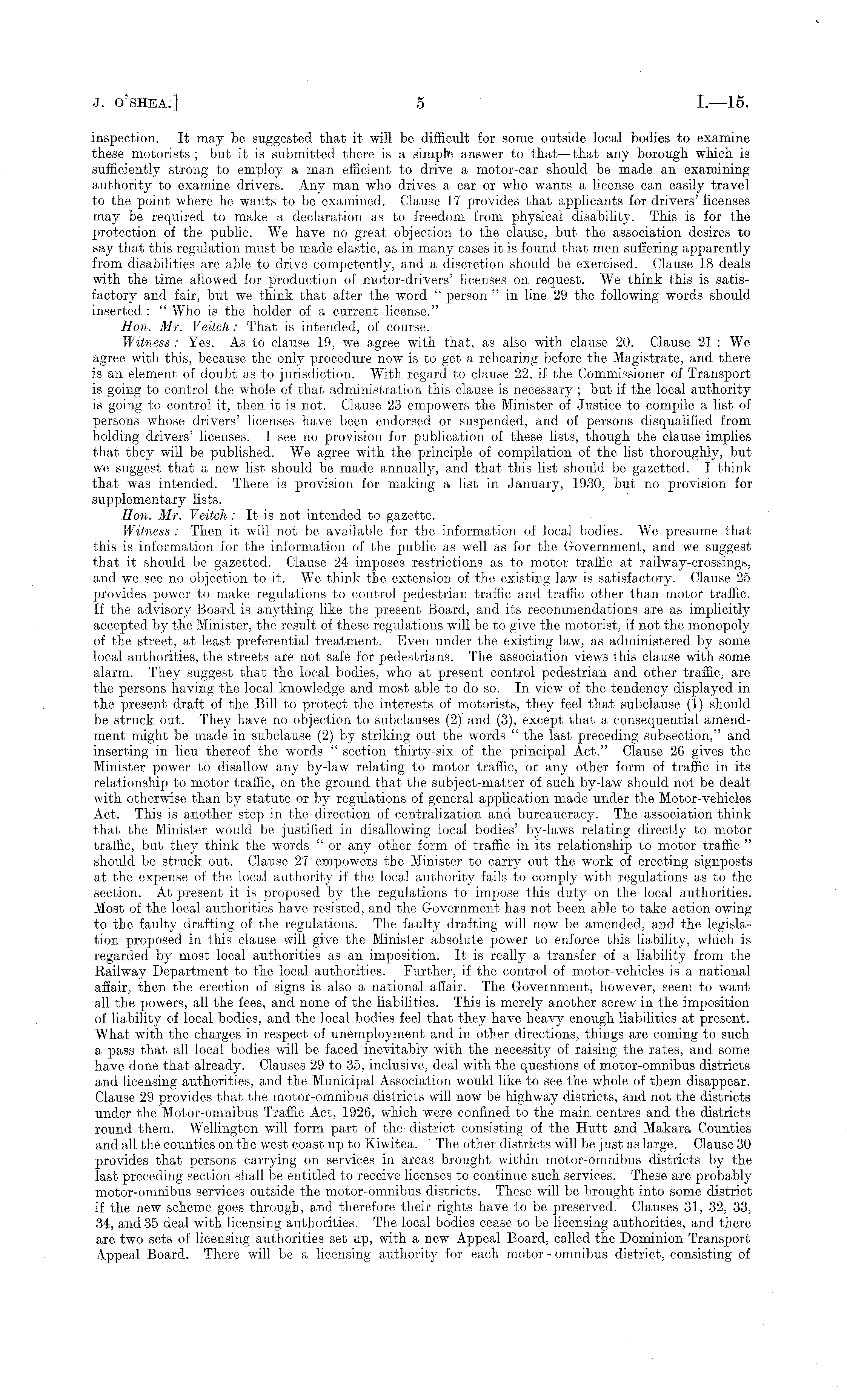 inspection. It may be suggested that it will be difficult for some outside local bodies to examine these motorists ; but it is submitted there is a simpte answer to that — that any borough which is sufficiently strong to employ a man efficient to drive a motor-car should be made an examining authority to examine drivers. Any man who drives a car or who wants a license can easily travel to the point where he wants to be examined. Clause 17 provides that applicants for drivers' licenses may be required to make a declaration as to freedom from physical disability. This is for the protection of the public. We have no great objection to the clause, but the association desires to say that this regulation must be made elastic, as in many cases it is found that men suffering apparently from disabilities are able to drive competently, and a discretion should be exercised. Clause 18 deals with the time allowed for production of motor-drivers' licenses on request. We think this is satisfactory and fair, but we think that after the word " person " in line 29 the following words should inserted : " Who is the holder of a current license." Hon. Mr. Veitch: That is intended, of course. Witness : Yes. As to clause 19, we agree with that, as also with clause 20. Clause 21 : We agree with this, because the only procedure now is to get a rehearing before the Magistrate, and there is an element of doubt as to jurisdiction. With regard to clause 22, if the Commissioner of Transport is going to control the whole of that administration this clause is necessary ; but if the local authority is going to control it, then it is not. Clause 23 empowers the Minister of Justice to compile a list of persons whose drivers' licenses have been endorsed or suspended, and of persons disqualified from holding drivers' licenses. I see no provision for publication of these lists, though the clause implies that they will be published. We agree with the principle of compilation of the list thoroughly, but we suggest that a new list should be made annually, a-nd that this list should be gazetted. I think that was intended. There is provision for making a list in January, 1930, but no provision for supplementary lists. Hon. Mr. Veitch : It is not intended to gazette. Witness: Then it will not be available for the information of local bodies. We presume that this is information for the information of the public as well as for the Government, and we suggest that it should be gazetted. Clause 24: imposes restrictions as to motor traffic at railway-crossings, and we see no objection to it. We think the extension of the existing law is satisfactory. Clause 25 provides power to make regulations to control pedestrian traffic and traffic other than motor traffic. If the advisory Board is anything like the present Board, and its recommendations are as implicitly accepted by the Minister, the result of these regulations will be to give the motorist, if not the monopoly of the street, at least preferential treatment. Even under the existing law, as administered by some local authorities, the streets are not safe for pedestrians. The association views this clause with some alarm. They suggest that the local bodies, who at present control pedestrian and other traffic, are the persons having the local knowledge and most able to do so. In view of the tendency displayed in the present draft of the Bill to protect the interests of motorists, they feel that subclause (1) should be struck out. They have no objection to subclauses (2) and (3), except that a consequential amendment might be made in subclause (2) by striking out the words " the last preceding subsection," and inserting in lieu thereof the words " section thirty-six of the principal Act." Clause 26 gives the Minister power to disallow any by-law relating to motor traffic, or any other form of traffic in its relationship to motor traffic, on the ground that the subject-matter of such by-law should not be dealt with otherwise than by statute or by regulations of general application made under the Motor-vehicles Act. This is another step in the direction of centralization and bureaucracy. The association think that the Minister would be justified in disallowing local bodies' by-laws relating directly to motor traffic, but they think the words " or any other form of traffic in its relationship to motor traffic " should be struck out. Clause 27 empowers the Minister to carry out the work of erecting signposts at the expense of the local authority if the local authority fails to comply with regulations as to the section. At present it is proposed by the regulations to impose this duty on the local authorities. Most of the local authorities have resisted, and the Government has not been able to take action owing to the faulty drafting of the regulations. The faulty drafting will now be amended, and the legislation proposed in this clause will give the Minister absolute power to enforce this liability, which is regarded by most local authorities as an imposition. It is really a transfer of a liability from the Railway Department to the local authorities. Further, if the control of motor-vehicles is a national affair, then the erection of signs is also a national affair. The Government, however, seem to want all the powers, all the fees, and none of the liabilities. This is merely another screw in the imposition of liability of local bodies, and the local bodies feel that they have heavy enough liabilities at present. What with the charges in respect of unemployment and in other directions, things are coming to such a pass that all local bodies will be faced inevitably with the necessity of raising the rates, and some have done that already. Clauses 29 to 35, inclusive, deal with the questions of motor-omnibus districts and licensing authorities, and the Municipal Association would like to see the whole of them disappear. Clause 29 provides that the motor-omnibus districts will now be highway 