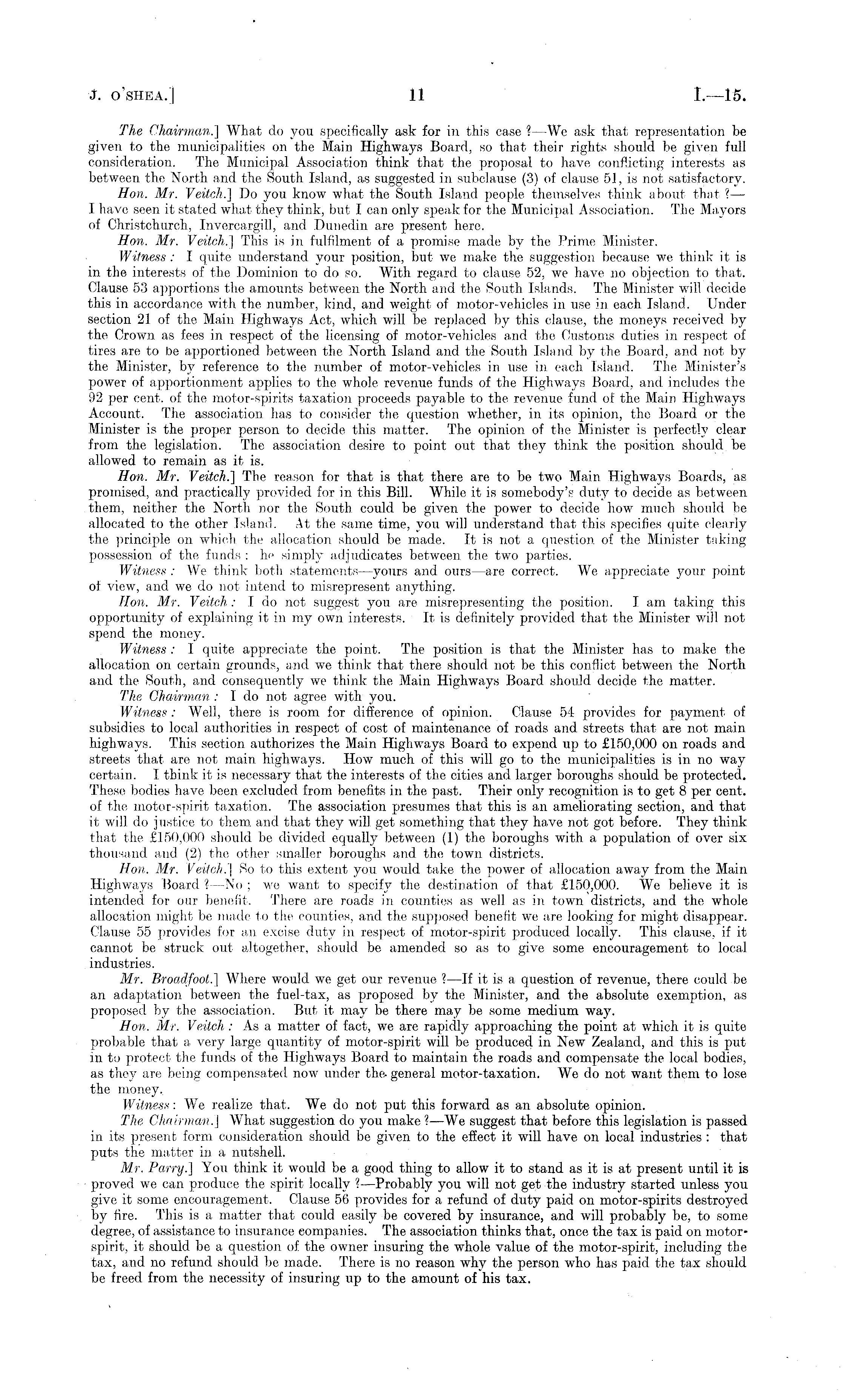 The Chairman.'] What clo you specifically ask for in this case %—We ask that representation be given to the municipalities on the Main Highways Board, so that their rights should be given full consideration. The Municipal Association think that the proposal to have conflicting interests as between the North and the South Island, as suggested in subclause (3) of clause 51, is not satisfactory. Hon. Mr. Veitch.] Do you know what the South Island people themselves think about that ? — I have seen it stated what they think, but I can only speak for the Municipal Association. The Mayors of Christchurch, Invercargill, and Dunedin are present here. Hon. Mr. Veitch.'] This is in fulfilment of a promise made by the Prime Minister. Witness : I quite understand your position, but we make the suggestion because we think it is in the interests of the Dominion to do so. With regard to clause 52, we have no objection to that. Clause 53 apportions the amounts between the North and the South Islands. The Minister will decide this in accordance with the number, kind, and weight of motor-vehicles in use in each Island. Under section 21 of the Main Highways Act, which will be replaced by this clause, the moneys received by the Crown as fees in respect of the licensing of motor-vehicles and the Customs duties in respect of tires are to be apportioned between the North Island and the South Island by the Board, and not by the Minister, by reference to the number of motor-vehicles in use in each Island. The Minister's power of apportionment applies to the whole revenue funds of the Highways Board, and includes the 92 per cent, of the motor-spirits taxation proceeds payable to the revenue fund of the Main Highways Account. The association has to consider the question whether, in its opinion, the Board or the Minister is the proper person to decide this matter. The opinion of the Minister is perfectly clear from the legislation. The association desire to point out that they think the position should be allowed to remain as it is. Hon. Mr. Veitch.] The reason for that is that there are to be two Main Highways Boards, as promised, and practically provided for in this Bill. While it is somebody's duty to decide as between them, neither the North nor the South could be given the power to decide how much should be allocated to the other Island. At the same time, you will understand that this specifies quite clearly the principle on which the allocation should be made. It is not a question of the Minister taking possession of the funds : he simply adjudicates between the two parties. Witness : We think both statements—yours and ours—are correct. We appreciate your point of view, and we do not intend to misrepresent anything. Hon. Mr. Veitch : Ido not suggest you are misrepresenting the position. lam taking this opportunity of explaining it in my own interests. It is definitely provided that the Minister will not spend the money. Witness : I quite appreciate the point. The position is that the Minister has to make the allocation on certain grounds, and we think that there should not be this conflict between the North and the South, and consequently we think the Main Highways Board should decide the matter. The Chairman : I do not agree with you. Witness • Well, there is room for difference of opinion. Clause 54 provides for payment of subsidies to local authorities in respect of cost of maintenance of roads and streets that are not main highways. This section authorizes the Main Highways Board to expend up to £150,000 on roads and streets that are not main highways. How much of this will go to the municipalities is in no way certain. I think it is necessary that the interests of the cities and larger boroughs should be protected. These bodies have been excluded from benefits in the past. Their onfy recognition is to get 8 per cent, of the motor-spirit taxation. The association presumes that this is an ameliorating section, and that it will do justice to them and that they will get something that they have not got before. They think that the £150,000 should be divided equally between (1) the boroughs with a population of over six thousand and (2) the other smaller boroughs and the town districts. Hon. Mr. Veitch.] So to this extent you would take the power of allocation away from the Main Highways Board \—No ; we want to specify the destination of that £150,000. We believe it is intended for our benefit. There are roads in counties as well as in town districts, and the whole allocation might be made to the counties, and the supposed benefit we are looking for might disappear. Clause 55 provides for an excise duty in respect of motor-spirit produced locally. This clause, if it cannot be struck out altogether, should be amended so as to give some encouragement to local industries. Mr. Broadfoot.] Where would we get our revenue % —lf it is a question of revenue, there could be an adaptation between the fuel-tax, as proposed by the Minister, and the absolute exemption, as proposed by the association. But it may be there may be some medium way. Hon. Mr. Veitch : As a matter of fact, we are rapidly approaching the point at which it is quite probable that a very large quantity of motor-spirit will be produced in New Zealand, and this is put in to protect the funds of the Highways Board to maintain the roads and compensate the local bodies, as they are being compensated now under the- general motor-taxation. We do not want them to lose the money. Witness: We realize that. We do not put this forward as an absolute opinion. The Chairman.] What suggestion do you make ? —We suggest that before this legislation is passed in its present form consideration should be given to the effect it will have on local industries : that puts the matter in a nutshell. Mr. Parry.] You think it would be a good thing to allow it to stand as it is at present until it is proved we can produce the spirit locally ?—Probably you will n