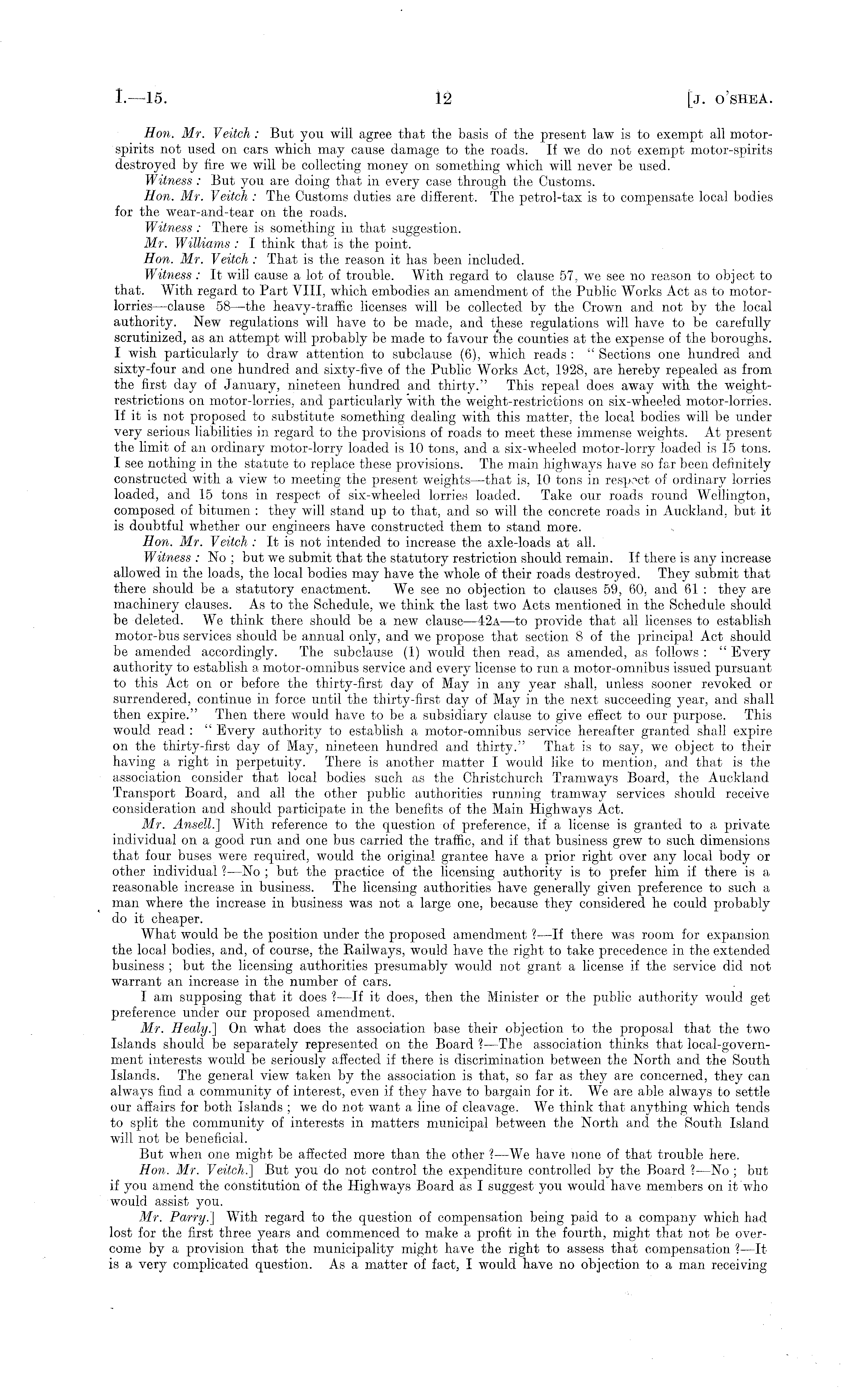 Hon. Mr. Veitch : But you will agree that the basis of the present law is to exempt all motorspirits not used on cars which may cause damage to the roads. If we do not exempt motor-spirits destroyed by fire we will be collecting money on something which will never be used. Witness : But you are doing that in every case through the Customs. Hon. Mr. Veitch : The Customs duties are different. The petrol-tax is to compensate local bodies for the wear-and-tear on the roads. Witness : There is something in that suggestion. Mr. Williams : I think that is the point. Hon. Mr. Veitch : That is the reason it has been included. Witness : It will cause a lot of trouble. With regard to clause 57, we see no reason to object to that. With regard to Part VIII, which embodies an amendment of the Public Works Act as to motorlorries—clause 58—the heavy-traffic licenses will be collected by the Crown and not by the local authority. New regulations will have to be made, and these regulations will have to be carefully scrutinized, as an attempt will probably be made to favour the counties at the expense of the boroughs. I wish particularly to draw attention to subclause (6), which reads : " Sections one hundred and sixty-four and one hundred and sixty-five of the Public Works Act, 1928, are hereby repealed as from the first day of January, nineteen hundred and thirty." This repeal does away with the weightrestrictions on motor-lorries, and particularly with the weight-restrictions on six-wheeled motor-lorries. If it is not proposed to substitute something dealing with this matter, the local bodies will be under very serious liabilities in regard to the provisions of roads to meet these immense weights. At present the limit of an ordinary motor-lorry loaded is 10 tons, and a six-wheeled motor-lorry loaded is 15 tons. I see nothing in the statute to replace these provisions. The main highways have so far been definitely constructed with a view to meeting the present weights —that is, 10 tons in respect of ordinary lorries loaded, and 15 tons in respect of six-wheeled lorries loaded. Take our roads round Wellington, composed of bitumen : they will stand up to that, and so will the concrete roads in Auckland, but it is doubtful whether our engineers have constructed them to stand more. Hon. Mr. Veitch : It is not intended to increase the axle-loads at all. Witness : No ; but we submit that the statutory restriction should remain. If there is any increase allowed in the loads, the local bodies may have the whole of their roads destroyed. They submit that there should be a statutory enactment. We see no objection to clauses 59, 60, and 61 : they are machinery clauses. As to the Schedule, we think the last two Acts mentioned in the Schedule should be deleted. We think there should be a new clause —42a—to provide that all licenses to establish motor-bus services should be annual only, and we propose that section 8 of the principal Act should be amended accordingly. The subclause (1) would then read, as amended, as follows : " Every authority to establish a motor-omnibus service and every license to run a motor-omnibus issued pursuant to this Act on or before the thirty-first day of May in any year shall, unless sooner revoked or surrendered, continue in force until the thirty-first day of May in the next succeeding year, and shall then expire." Then there would have to be a subsidiary clause to give effect to our purpose. This would read : " Every authority to establish a motor-omnibus service hereafter granted shall expire on the thirty-first day of May, nineteen hundred and thirty." That is to say, we object to their having a right in perpetuity. There is another matter I would like to mention, and that is the association consider that local bodies such as the Christchurch Tramways Board, the Auckland Transport Board, and all the other public authorities running tramway services should receive consideration and should participate in the benefits of the Main Highways Act. Mr. Ansell.] With reference to the question of preference, if a license is granted to a private individual on a good run and one bus carried the traffic, and if that business grew to such dimensions that four buses were required, would the original grantee have a prior right over any local body or other individual ? —No ; but the practice of the licensing authority is to prefer him if there is a reasonable increase in business. The licensing authorities have generally given preference to such a man where the increase in business was not a large one, because they considered he could probably do it cheaper. What would be the position under the proposed amendment ?—lf there was room for expansion the local bodies, and, of course, the Railways, would have the right to take precedence in the extended business ; but the licensing authorities presumably would not grant a license if the service did not warrant an increase in the number of cars. I am supposing that it does ? —lf it does, then the Minister or the public authority would get preference under our proposed amendment. Mr. Healy.~\ On what does the association base their objection to the proposal that the two Islands should be separately represented on the Board ? —The association thinks that local-govern-ment interests would be seriously affected if there is discrimination between the North and the South Islands. The general view taken by the association is that, so far as they are concerned, they can always find a community of interest, even if they have to bargain for it. We are able always to settle our affairs for both Islands ; we do not want a line of cleavage. We think that anything which tends to split the community of interests in matters municipal between the North and the South Island will not be beneficial. But when one might be affected more than the other ?—We have none of that trouble here. Hon. Mr. Veitch.] But you do not control the expenditure controlled by t