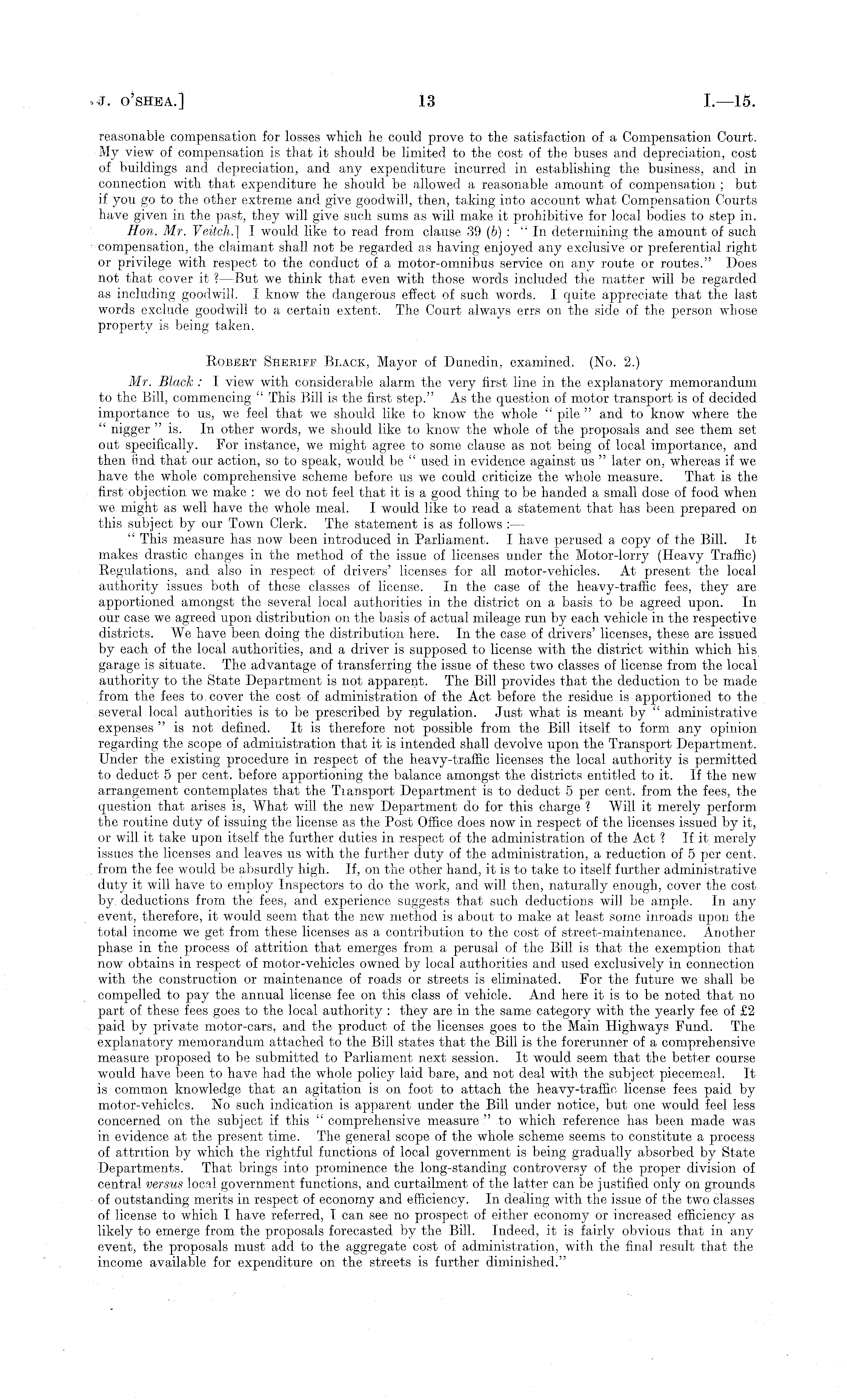 reasonable compensation for losses which lie could prove to the satisfaction of a Compensation Court. My view of compensation is that it should be limited to the cost of the buses and depreciation, cost of buildings and depreciation, and any expenditure incurred in establishing the business, and in connection with that expenditure he should be allowed a reasonable amount of compensation ; but if you go to the other extreme and give goodwill, then, taking into account what Compensation Courts have given in the past, they will give such sums as will make it prohibitive for local bodies to step in. Hon. Mr. Veitch.] I would like to read from clause 39 (b) : "In determining the amount of such compensation, the claimant shall not be regarded as having enjoyed any exclusive or preferential right or privilege with respect to the conduct of a motor-omnibus service on any route or routes." Does not that cover it ? —But we think that even with those words included the matter will be regarded as including goodwill. I know the dangerous effect of such words. I quite appreciate that the last words exclude goodwill to a certain extent. The Court always errs on the side of the person whose property is being taken. Robert Sheriff Black, Mayor of Dunedin, examined. (No. 2.) Mr. Black : I view with considerable alarm the very first line in the explanatory memorandum to the Bill, commencing " This Bill is the first step." As the question of motor transport is of decided importance to us, we feel that we should like to know the whole " pile " and to know where the " nigger " is. In other words, we should like to know the whole of the proposals and see them set oat specifically. For instance, we might agree to some clause as not being of local importance, and then find that our action, so to speak, would be " used in evidence against us " later on, whereas if we have the whole comprehensive scheme before us we could criticize the whole measure. That is the first objection we make : we do not feel that it is a good thing to be handed a small dose of food when we might as well have the whole meal. I would like to read a statement that has been prepared on this subject by our Town Clerk. The statement is as follows : — " This measure has now been introduced in Parliament. I have perused a copy of the Bill. It makes drastic changes in the method of the issue of licenses under the Motor-lorry (Heavy Traffic) Regulations, and also in respect of drivers' licenses for all motor-vehicles. At present the local authority issues both of these classes of license. In the case of the heavy-traffic fees, they are apportioned amongst the several local authorities in the district on a basis to be agreed upon. In our case we agreed upon distribution on the basis of actual mileage run by each vehicle in the respective districts. We have been doing the distribution here. In the case of drivers' licenses, these are issued by each of the local authorities, and a driver is supposed to license with the district within which his garage is situate. The advantage of transferring the issue of these two classes of license from the local authority to the State Department is not apparent. The Bill provides that the deduction to be made from the fees to cover the cost of administration of the Act before the residue is apportioned to the several local authorities is to be prescribed by regulation. Just what is meant by " administrative expenses "is not defined. It is therefore not possible from the Bill itself to form any opinion regarding the scope of administration that it is intended shall devolve upon the Transport Department. Under the existing procedure in respect of the heavy-traffic licenses the local authority is permitted to deduct 5 per cent, before apportioning the balance amongst the districts entitled to it. If the new arrangement contemplates that the Transport Department is to deduct 5 per cent, from the fees, the question that arises is, What will the new Department do for this charge ? Will it merely perform the routine duty of issuing the license as the Post Office does now in respect of the licenses issued by it, or will it take upon itself the further duties in respect of the administration of the Act ? If it merely issues the licenses and leaves us with the further duty of the administration, a reduction of 5 per cent, from the fee would be absurdly high. If, on the other hand, it is to take to itself further administrative duty it will have to employ Inspectors to do the work, and will then, naturally enough, cover the cost by. deductions from the fees, and experience suggests that such deductions will be ample. In any event, therefore, it would seem that the new method is about to make at least some inroads upon the total income we get from these licenses as a contribution to the cost of street-maintenance. Another phase in the process of attrition that emerges from a perusal of the Bill is that the exemption that now obtains in respect of motor-vehicles owned by local authorities and used exclusively in connection with the construction or maintenance of roads or streets is eliminated. For the future we shall be compelled to pay the annual license fee on this class of vehicle. And here it is to be noted that no part of these fees goes to the local authority : they are in the same category with the yearly fee of £2 paid by private motor-cars, and the product of the licenses goes to the Main Highways Fund. The explanatory memorandum attached to the Bill states that the Bill is the forerunner of a comprehensive measure proposed to be submitted to Parliament next session. It would seem that the better course would have been to have had the whole policy laid bare, and not deal with the subject piecemeal. It is common knowledge that an agitation is on foot to attach the heavy-traffic license fees paid by motor-vehicles. No such indication is apparent under the Bill under notice, but one would feel less concerned on the