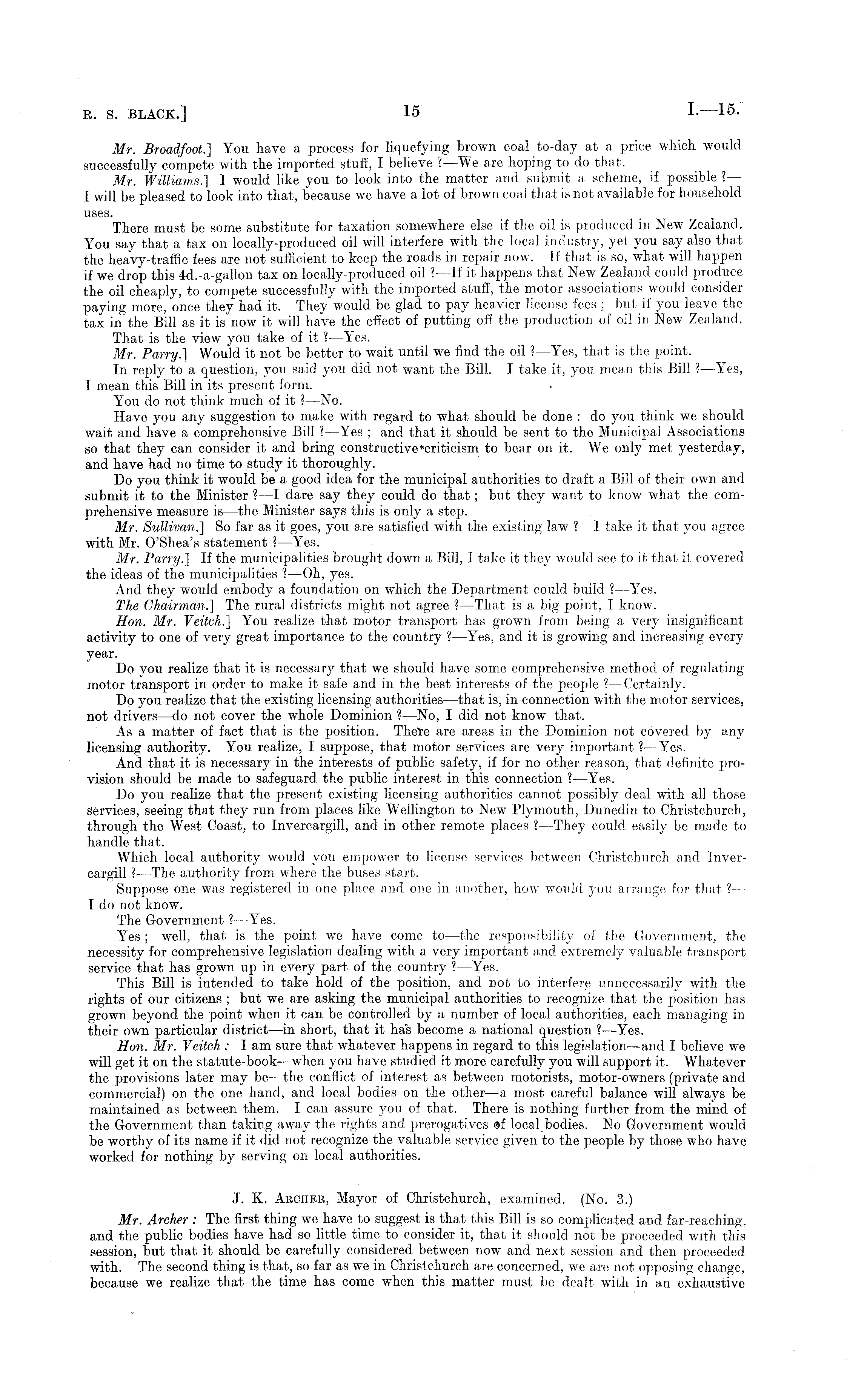 Mr. Broadfoot.] You have a process for liquefying brown coal to-day at a price which, would successfully compete with the imported stuff, I believe ?—We are hoping to do that. Mr. Williams.] I would like you to look into the matter and submit a scheme, if possible ? — I will be pleased to look into that, because we have a lot of brown coal that is not available for household uses. There must be some substitute for taxation somewhere else if the oil is produced in New Zealand. You say that a tax on locally-produced oil will interfere with the local industry, yet you say also that the heavy-traffic fees are not sufficient to keep the roads in repair now. If that is so, what will happen if we drop this 4d.-a-gallon tax on locally-produced oil ?—lf it happens that New Zealand could produce the oil cheaply, to compete successfully with the imported stuff, the motor associations would consider paying more, once they had it. They would be glad to pay heavier license fees ; but if you leave the tax in the Bill as it is"now it will have the effect of putting off the production of oil in New Zealand. That is the view you take of it ? —ies. Mr. Parry.] Would it not be better to wait until we find the oil ? —Yes, that is the point. In reply to a question, you said you did not want the Bill. I take it, you mean this Bill ? —Yes, I mean this Bill in its present form. You do not think much of it ? —No. Have you any suggestion to make with regard to what should be done : do you think we should wait and have a comprehensive Bill ? —Yes ; and that it should be sent to the Municipal Associations so that they can consider it and bring constructive •criticism to bear on it. We only met yesterday, and have had no time to study it thoroughly. Do you think it would be a good idea for the municipal authorities to draft a Bill of their own and submit it to the Minister ?—I dare say they could do that; but they want to know what the comprehensive measure is—the Minister says this is only a step. Mr. Sullivan.] So far as it goes, you are satisfied with the existing law ? I take it that you agree with Mr. O'Shea's statement ? —Yes. Mr. Parry.] If the municipalities brought down a Bill, I take it they would see to it that it covered the ideas of the municipalities ?—Oh, yes. And they would embody a foundation on which the Department could build ?—Yes. The Chairman.] The rural districts might not agree ?—That is a big point, I know. Hon. Mr. Veitch.] You realize that motor transport has grown from being a very insignificant activity to one of very great importance to the country ? —Yes, and it is growing and increasing every y ear - Do you realize that it is necessary that we should have some comprehensive method of regulating motor transport in order to make it safe and in the best interests of the people ? —Certainly. Dp you realize that the existing licensing authorities —that is, in connection with the motor services, not drivers —do not cover the whole Dominion ? —No, I did not know that. As a matter of fact that is the position. Thete are areas in the Dominion not covered by any licensing authority. You realize, I suppose, that motor services are very important ? —Yes. And that it is necessary in the interests of public safety, if for no other reason, that definite provision should be made to safeguard the public interest in this connection ? —Yes. Do you realize that the present existing licensing authorities cannot possibly deal with all those Services, seeing that they run from places like Wellington to New Plymouth, Dunedin to Christchurch, through the West Coast, to Invercargill, and in other remote places ? —They could easily be made to handle that. Which local authority would you empower to license services between Christchurch and Invercargill ? —The authority from where the buses start. Suppose one was registered in one place and one in another, how would you arrange for that ? — I do not know. The Government ? —Yes. Yes ; well, that is the point we have come to —the responsibility of the Government, the necessity for comprehensive legislation dealing with a very important and extremely valuable transport service that has grown up in every part of the country ? —Yes. This Bill is intended to take hold of the position, and not to interfere unnecessarily with the rights of our citizens ; but we are asking the municipal authorities to recognize that the position has grown beyond the point when it can be controlled bjr a number of local authorities, each managing in their own particular district—in short, that it has become a national question ? —Yes. Hon. Mr. Veitch : lam sure that whatever happens in regard to this legislation—and I believe we will get it on the statute-book —when you have studied it more carefully you will support it. Whatever the provisions later may be—the conflict of interest as between motorists, motor-owners (private and commercial) on the one hand, and local bodies on the other—a most careful balance will always be maintained as between them. I can assure you of that. There is nothing further from the mind of the Government than taking away the rights and prerogatives ®f local bodies. No Government would be worthy of its name if it did not recognize the valuable service given to the people by those who have worked for nothing by serving on local authorities. J. K. Archee, Mayor of Christchurch, examined. (No. 3.) Mr. Archer : The first thing we have to suggest is that this Bill is so complicated and far-reaching, and the public bodies have had so little time to consider it, that it should not be proceeded with this session, but that it should be carefully considered between now and next session and then proceeded with. The second thing is that, so far as we in Christchurch are concerned, we are not opposing change, because we realize that the time has come when this matter must be dealt with in an exhaustive