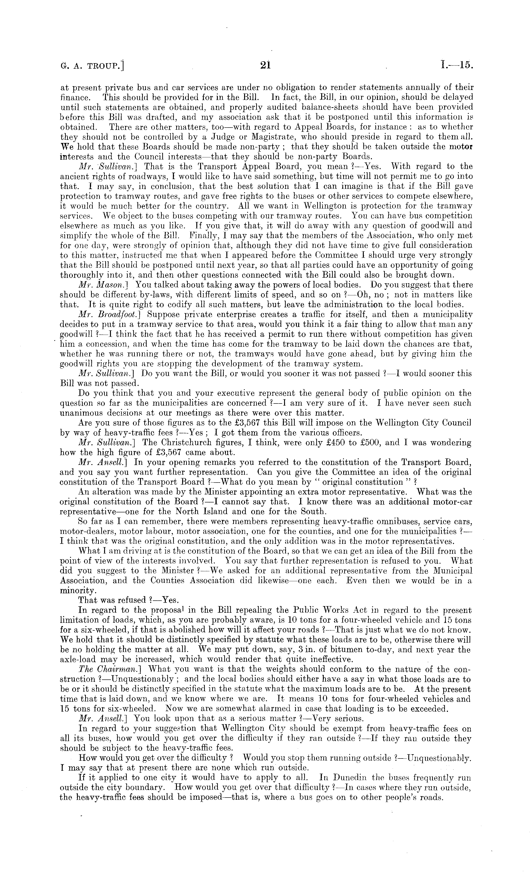 at present private bus and car services are under no obligation to render statements annually of their finance. This should be provided for in the Bill. In fact, the Bill, in our opinion, should be delayed until such statements are obtained, and properly audited balance-sheets should have been provided before this Bill was drafted, and my association ask that it be postponed until this information is obtained. There are other matters, too —with regard to Appeal Boards, for instance : as to whether they should not be controlled by a Judge or Magistrate, who should preside in regard to them all. We hold that these Boards should be made non-party ; that they should be taken outside the motor interests and the Council interests —that they should be non-party Boards. Mr. Sullivan.] That is the Transport Appeal Board, you mean ? —Yes. With regard to the ancient rights of roadways, I would like to have said something, but time will not permit me to go into that. I may say, in conclusion, that the best solution that 1 can imagine is that if the Bill gave protection to tramway routes, and gave free rights to the buses or other services to compete elsewhere, it would be much better for the country. All we want in Wellington is protection for the tramway services. We object to the buses competing with our tramway routes. You can have bus competition elsewhere as much as you like. If you give that, it will do away with any question of goodwill and simplify the whole of the Bill. Finally, I may say that the members of the Association, who only met for one day, were strongly of opinion that, although they did not have time to give full consideration to this matter, instructed me that when I appeared before the Committee I should urge very strongly that the Bill should be postponed until next year, so that all parties could have an opportunity of going thoroughly into it, and then other questions connected with the Bill could also be brought down. Mr. Mason.] You talked about taking away the powers of local bodies. Do you suggest that there should be different by-laws, with different limits of speed, and so on ? —Oh, no ; not in matters like that. It is quite right to codify all such matters, but leave the administration to the local bodies. Mr. Droadfoot.] Suppose private enterprise creates a traffic for itself, and then a municipality decides to put in a tramway service to that area, would you think it a fair thing to allow that man any goodwill ?—I think the fact that he has received a permit to run there without competition has given him a concession, and when the time has come for the tramway to be laid down the chances are that, whether he was running there or not, the tramways would have gone ahead, but by giving him the goodwill rights you are stopping the development of the tramway system. Mr. Sullivan.] Do you want the Bill, or would you sooner it was not passed ?—I would sooner this Bill was not passed. Do you think that you and your executive represent the general body of public opinion on the question so far as the municipalities are concerned ?—I am very sure of it. I have never seen such unanimous decisions at our meetings as there were over this matter. Are you sure of those figures as to the £3,567 this Bill will impose on the Wellington City Council by way of heavy-traffic fees ? —Yes ; I got them from the various officers. Mr. Sullivan.] The Christchurch figures, I think, were only £450 to £500, and I was wondering how the high figure of £3,567 came about. Mr. Ansell.] In your opening remarks you referred to the constitution of the Transport Board, and you say you want further representation. Can you give the Committee an idea of the original constitution of the Transport Board ? —What do you mean by " original constitution " ? An alteration was made by the Minister appointing an extra motor representative. What was the original constitution of the Board ?—I cannot say that. I know there was an additional motor-car representative —one for the North Island and one for the South. So far as I can remember, there were membters representing heavy-traffic omnibuses, service cars, motor-dealers, motor labour, motor association, one for the counties, and one for the municipalities ? — I think that was the original constitution, and the only addition was in the motor representatives. What I am driving at is the constitution of the Board, so that we can get an idea of the Bill from the point of view of the interests involved. You say that further representation is refused to you. What did you suggest to the Minister ? —We asked for an additional representative from the Municipal Association, and the Counties Association did likewise —one each. Even then we would be in a minority. That was refused ? —Yes. In regard to the proposal j n the Bill repealing the Public Works Act in regard to the present limitation of loads, which, as you are probably aware, is 10 tons for a four-wheeled vehicle and 15 tons for a six-wheeled, if that is abolished how will it affect your roads ? —That is just what we do not know. We hold that it should be distinctly specified by statute what these loads are to be, otherwise there will be no holding the matter at all. We may put down, say, 3 in. of bitumen to-day, and next year the axle-load may be increased, which would render that quite ineffective. The Chairman.] What you want is that the weights should conform to the nature of the construction ? —Unquestionably ; and the local bodies should either have a say in what those loads are to be or it should be distinctly specified in the statute what the maximum loads are to be. At the present time that is laid down, and we know where we are. It means 10 tons for four-wheeled vehicles and 15 tons for six-wheeled. Now we are somewhat alarmed in case that loading is to be exceeded. Mr. Ansell.] You look upon that as a serious matter ?—Very serious. In regard to your suggestion that We