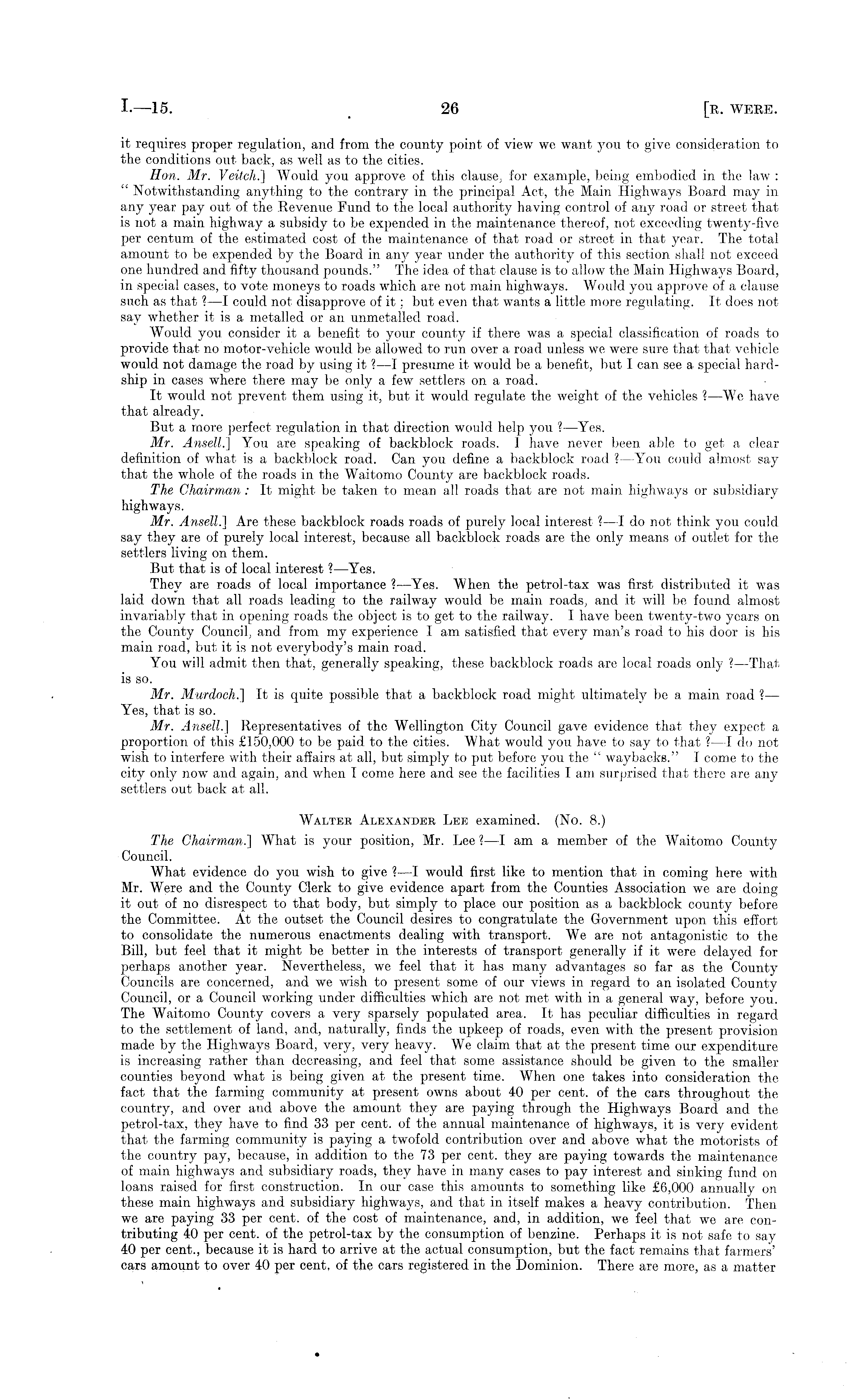 it requires proper regulation, and from the county point of view we want you to give consideration to the conditions out back, as well as to the cities. Hon. Mr. Veitch.] Would you approve of this clause, for example, being embodied in the law : " Notwithstanding anything to the contrary in the principal Act, the Main Highways Board may in any year pay out of the Revenue Fund to the local authority having control of any road or street that is not a main highway a subsidy to be expended in the maintenance thereof, not exceeding twenty-five per centum of the estimated cost of the maintenance of that road or street in that year. The total amount to be expended by the Board in any year under the authority of this section shall not exceed one hundred and fifty thousand pounds." The idea of that clause is to allow the Main Highways Board, in special cases, to vote moneys to roads which are not main highways. Would you approve of a clause such as that ? —I could not disapprove of it; but even that wants a little more regulating. It does not say whether it is a metalled or an unmetalled road. Would you consider it a benefit to your county if there was a special classification of roads to provide that no motor-vehicle would be allowed to run over a road unless we were sure that that vehicle would not damage the road by using it ?—I presume it would be a benefit, but I can see a special hardship in cases where there may be only a few settlers on a road. It would not prevent them using it, but it would regulate the weight of the vehicles I—We1 —We have that already. But a more perfect regulation in that direction would help you ? —Yes. Mr. Ansell.] You are speaking of backblock roads. I have never been able to get a clear definition of what is a backblock road. Can you define a backblock road ? —You could almost say that the whole of the roads in the Waitomo County are backblock roads. The Chairman : It might be taken to mean all roads that are not main highways or subsidiary highways. Mr. Ansell.] Are these backblock roads roads of purely local interest ? —I do not think you could say they are of purely local interest, because all backblock roads are the only means of outlet for the settlers living on them. But that is of local interest ?—Yes. They are roads of local importance ? —Yes. When the petrol-tax was first distributed it was laid down that all roads leading to the railway would be main roads, and it will be found almost invariably that in opening roads the object is to get to the railway. I have been twenty-two years on the County Council, and from my experience I am satisfied that every man's road to his door is his main road, but it is not everybody's main road. You will admit then that, generally speaking, these backblock roads are local roads only ?—That is so. Mr. Murdoch.] It is quite possible that a backblock road might ultimately be a main road ? — Yes, that is so. Mr. Ansell.] Representatives of the Wellington City Council gave evidence that they expect a proportion of this £150,000 to be paid to the cities. What would you have to say to that ? —I do not wish to interfere with their affairs at all, but simply to put before you the " waybacks." I come to the city only now and again, and when I come here and see the facilities I am surprised that there are any settlers out back at all. Walter Alexander Lee examined. (No. 8.) The Chairman.'] What is your position, Mr. Lee? —I am a member of the Waitomo County Council. What evidence do you wish to give ? —I would first like to mention that in coming here with Mr. Were and the County Clerk to give evidence apart from the Counties Association we are doing it out of no disrespect to that body, but simply to place our position as a backblock county before the Committee. At the outset the Council desires to congratulate the Government upon this effort to consolidate the numerous enactments dealing with transport. We are not antagonistic to the Bill, but feel that it might be better in the interests of transport generally if it were delayed for perhaps another year. Nevertheless, we feel that it has many advantages so far as the County Councils are concerned, and we wish to present some of our views in regard to an isolated County Council, or a Council working under difficulties which are not met with in a general way, before you. The Waitomo County covers a very sparsely populated area. It has peculiar difficulties in regard to the settlement of land, and, naturally, finds the upkeep of roads, even with the present provision made by the Highways Board, very, very heavy. We claim that at the present time our expenditure is increasing rather than decreasing, and feel that some assistance should be given to the smaller counties beyond what is being given at the present time. When one takes into consideration the fact that the farming community at present owns about 40 per cent, of the cars throughout the country, and over and above the amount they are paying through the Highways Board and the petrol-tax, they have to find 33 per cent, of the annual maintenance of highways, it is very evident that the farming community is paying a twofold contribution over and above what the motorists of the country pay, because, in addition to the 73 per cent, they are paying towards the maintenance of main highways and subsidiary roads, they have in many cases to pay interest and sinking fund on loans raised for first construction. In our case this amounts to something like £6,000 annually on these main highways and subsidiary highways, and that in itself makes a heavy contribution. Then we are paying 33 per cent, of the cost of maintenance, and, in addition, we feel that we are contributing 40 per cent, of the petrol-tax by the consumption of benzine. Perhaps it is not safe to say 40 per cent., because it is hard to arrive at the actual consumption, but the fact remains that farmers' cars amount to over 40 per cent, of the car