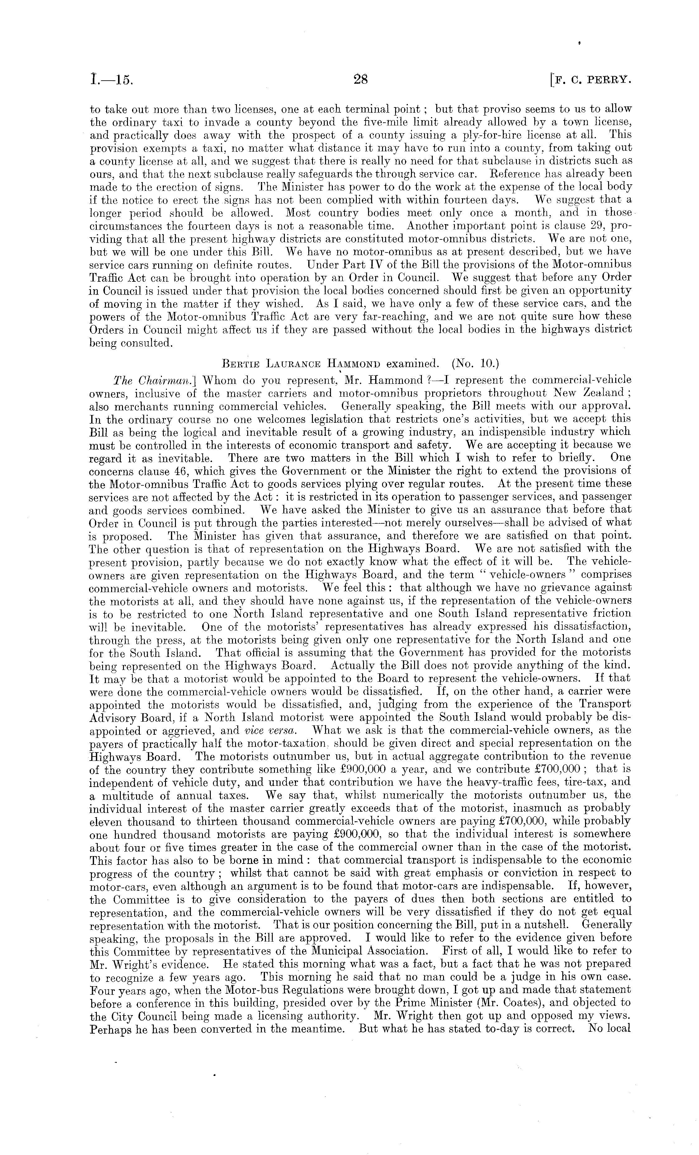 to take out more than two licenses, one at each terminal point ; but that proviso seems to us to allow the ordinary taxi to invade a county beyond the five-mile limit already allowed by a town license, and practically does away with the prospect of a county issuing a ply.-for-hire license at all. This provision exempts a taxi, no matter what distance it may have to run into a county, from taking out a county license at all, and we suggest that there is really no need for that subclause in districts such as ours, and that the next subclause really safeguards the through service car. Reference has already been made to the erection of signs. The Minister has power to do the work at the expense of the local body if the notice to erect the . signs has not been complied with within fourteen days. We suggest that a longer period should be allowed. Most country bodies meet only once a month, and in those circumstances the fourteen days is not a reasonable time. Another important point is clause 29, providing that all the present highway districts are constituted motor-omnibus districts. We are not one, but we will be one under this Bill. We have no motor-omnibus as at present described, but we have service cars running on definite routes. Under Part IV of the Bill the provisions of the Motor-omnibus Traffic Act can be brought into operation by an Order in Council. We suggest that before any Order in Council is issued under that provision the local bodies concerned should first be given an opportunity of moving in the matter if they wished. As I said, we have only a few of these service cars, and the powers of the Motor-omnibus Traffic Act are very far-reaching, and we are not quite sure how these Orders in Council might affect us if they are passed without the local bodies in the highways district being consulted. Bertie Laubance Hammond examined. (No. 10.) The Chairman.] Whom do you represent, Mr. Hammond ? —I represent the commercial-vehicle owners, inclusive of the master carriers and motor-omnibus proprietors throughout New Zealand ; also merchants running commercial vehicles. Generally speaking, the Bill meets with our approval. In the ordinary course no one welcomes legislation that restricts one's activities, but we accept this Bill as being the logical and inevitable result of a growing industry, an indispensible industry which must be controlled in the interests of economic transport and safety. We are accepting it because we regard it as inevitable. There are two matters in the Bill which I wish to refer to briefly. One concerns clause 46, which gives the Government or the Minister the right to extend the provisions of the Motor-omnibus Traffic Act to goods services plying over regular routes. At the present time these services are not affected by the Act: it is restricted in its operation to passenger services, and passenger and goods services combined. We have asked the Minister to give us an assurance that before that Order in Council is put through the parties interested —not merely ourselves —shall be advised of what is proposed. The Minister has given that assurance, and therefore we are satisfied on that point. The other question is that of representation on the Highways Board. We are not satisfied with the present provision, partly because we do not exactly know what the effect of it will be. The vehicleowners are given representation on the Highways Board, and the term " vehicle-owners " comprises commercial-vehicle owners and motorists. We feel this : that although we have no grievance against the motorists at all, and they should have none against us, if the representation of the vehicle-owners is to be restricted to one North Island representative and one South Island representative friction will be inevitable. One of the motorists' representatives lias already expressed his dissatisfaction, through the press, at the motorists being given only one representative for the North Island and one for the South Island. That official is assuming that the Government has provided for the motorists being represented on the Highways Board. Actually the Bill does not provide anything of the kind. It may be that a motorist would be appointed to the Board to represent the vehicle-owners. If that were done the commercial-vehicle owners would be dissatisfied. If, on the other hand, a carrier were appointed the motorists would be dissatisfied, and, judging from the experience of the Transport Advisory Board, if a North Island motorist were appointed the South Island would probably be disappointed or aggrieved, and vice versa. What we ask is that the commercial-vehicle owners, as the payers of practically half the motor-taxation, should be given direct and special representation on the Highways Board. The motorists outnumber us, but in actual aggregate contribution to the revenue of the country they contribute something like £900,000 a year, and we contribute £700,000 ; that is independent of vehicle duty, and under that contribution we have the heavy-traffic fees, tire-tax, and a multitude of annual taxes. We say that, whilst numerically the motorists outnumber us, the individual interest of the master carrier greatly exceeds that of the motorist, inasmuch as probably eleven thousand to thirteen thousand commercial-vehicle owners are paying £700,000, while probably one hundred thousand motorists are paying £900,000, so that the individual interest is somewhere about four or five times greater in the case of the commercial owner than in the case of the motorist. This factor has also to be borne in mind : that commercial transport is indispensable to the economic progress of the country ; whilst that cannot be said with great emphasis or conviction in respect to motor-cars, even although an argument is to be found that motor-cars are indispensable. If, however, the Committee is to give consideration to the payers of dues then both sections are entitled to representation, and the comm