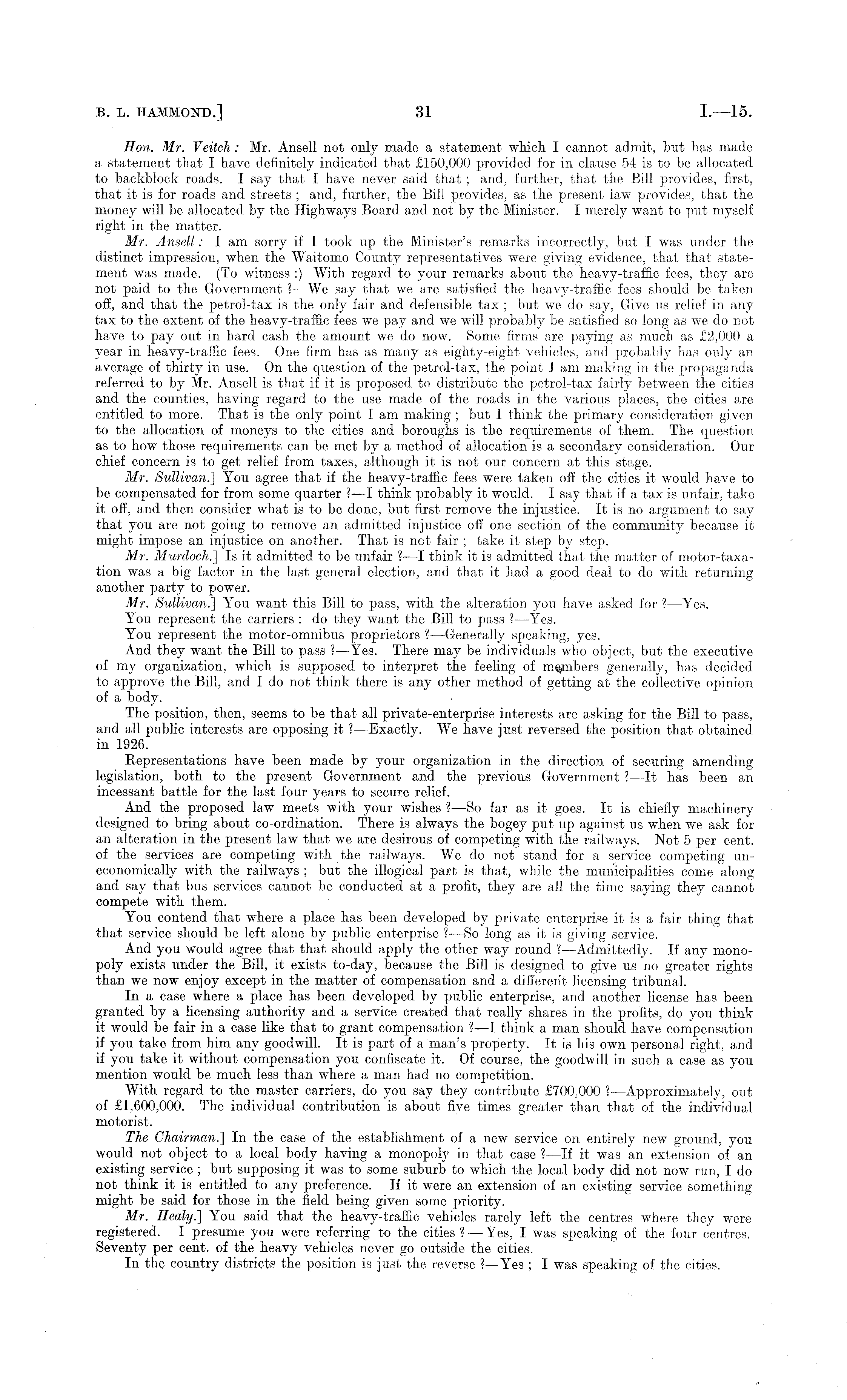 Hon. Mr. Veitch : Mr. Ansell not only made a statement which I cannot admit, but has made a statement that I have definitely indicated that £150,000 provided for in clause 54 is to be allocated to backblock roads. I say that I have never said that; and, further, that the Bill provides, first, that it is for roads and streets ; and, further, the Bill provides, as the present law provides, that the money will be allocated by the Highways Board and not by the Minister. I merely want to put myself right in the matter. Mr. Ansell: lam sorry if I took up the Minister's remarks incorrectly, but I was under the distinct impression, when the Waitomo County representatives were giving evidence, that that statement was made. (To witness :) With regard to your remarks about the heavy-traffic fees, they are not paid to the Government ? —We say that we are satisfied the heavy-traffic fees should be taken off, and that the petrol-tax is the only fair and defensible tax ; but we do say, Give us relief in any tax to the extent of the heavy-traffic fees we pay and we will probably be satisfied so long as we do not have to pay out in hard cash, the amount we do now. Some firms are paying as much as £2,000 a year in heavy-traffic fees. One firm has as many as eighty-eight vehicles, and probably has only an average of thirty in use. On the question of the petrol-tax, the point lam making in the propaganda referred to by Mr. Ansell is that if it is proposed to distribute the petrol-tax fairly between the cities and the counties, having regard to the use made of the roads in the various places, the cities are entitled to more. That is the only point lam making ; but I think the primary consideration given to the allocation of moneys to the cities and boroughs is the requirements of them. The question as to how those requirements can be met by a method of allocation is a secondary consideration. Our chief concern is to get relief from taxes, although it is not our concern at this stage. Mr. Sullivan.] You agree that if the heavy-traffic fees were taken off the cities it would have to be compensated for from some quarter ? —I think probably it would. I say that if a tax is unfair, take it off, and then consider what is to be done, but first remove the injustice. It is no argument to say that you are not going to remove an admitted injustice off one section of the community because it might impose an injustice on another. That is not fair ; take it step by step. Mr. Murdoch.] Is it admitted to be unfair ? —I think it is admitted that the matter of motor-taxa-tion was a big factor in the last general election, and that it had a good deal to do with returning another party to power. Mr. Sullivan.'] You want this Bill to pass, with the alteration you have asked for ? —Yes. You represent the carriers : do they want the Bill to pass ?—Yes. You represent the motor-omnibus proprietors ? —Generally speaking, yes. And they want the Bill to pass ?—Yes. There may be individuals who object, but the executive of my organization, which is supposed to interpret the feeling of members generally, has decided to approve the Bill, and I do not think there is any other method of getting at the collective opinion of a body. The position, then, seems to be that all private-enterprise interests are asking for the Bill to pass, and all public interests are opposing it ? —Exactly. We have just reversed the position that obtained in 1926. Representations have been made by your organization in the direction of securing amending legislation, both to the present Government and the previous Government ?—lt has been an incessant battle for the last four years to secure relief. And the proposed law meets with your wishes ? —So far as it goes. It is chiefly machinery designed to bring about co-ordination. There is always the bogey put up against us when we ask for an alteration in the present law that we are desirous of competing with the railways. Not 5 per cent, of the services are competing with the railways. We do not stand for a service competing uneconomically with the railways ; but the illogical part is that, while the municipalities come along and say that bus services cannot be conducted at a profit, they are all the time saying they cannot compete with them. You contend that where a place has been developed by private enterprise it is a fair thing that that service should be left alone by public enterprise ? —So long as it is giving service. And you would agree that that should apply the other way round ?—Admittedly. If any monopoly exists under the Bill, it exists to-day, because the Bill is designed to give us no greater rights than we now enjoy except in the matter of compensation and a different licensing tribunal. In a case where a place has been developed by public enterprise, and another license has been granted by a licensing authority and a service created that really shares in the profits, do you think it would be fair in a case like that to grant compensation ?—I think a man should have compensation if you take from him any goodwill. It is part of a man's property. It is his own personal right, and if you take it without compensation you confiscate it. Of course, the goodwill in such a case as you mention would be much less than where a man had no competition. With regard to the master carriers, do you say they contribute £700,000 ? —Approximately, out of £1,600,000. The individual contribution is about five times greater than that of the individual motorist. The Chairman.'] In the case of the establishment of a new service on entirely new ground, you would not object to a local body having a monopoly in that case ?—lf it was an extension of an existing service ; but supposing it was to some suburb to which the local body did not now run, I do not think it is entitled to any preference. If it were an extension of an existing service something might be said for those in the field being given