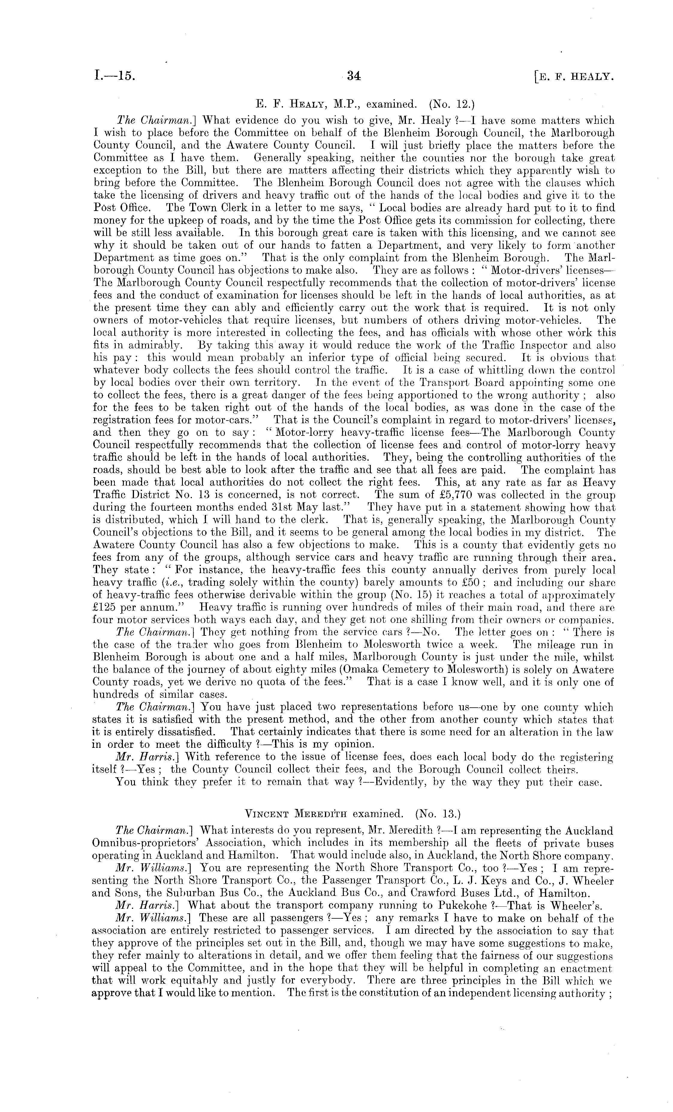E. F. Healy, M.P., examined. (No. 12.) The Chairman.] What evidence do you wish to give, Mr. Healy ?—-1 have some matters which I wish to place before the Committee 011 behalf of the Blenheim Borough Council, the Marlborough County Council, and the Awatere County Council. I will iust briefly place the matters before the Committee as I have them. Generally speaking, neither the counties nor the borough take great exception to the Bill, but there are matters affecting their districts which they apparently wish to bring before the Committee. The Blenheim Borough Council does not agree with the clauses which take the licensing of drivers and heavy traffic out of the hands of the local bodies and give it to the Post Office. The Town Clerk in a letter to me says, " Local bodies are already hard put to it to find money for the upkeep of roads, and by the time the Post Office gets its commission for collecting, there will be still less available. In this borough great care is taken with this licensing, and we cannot see why it should be taken out of our hands to fatten a Department, and very likely to form another Department as time goes on." That is the only complaint from the Blenheim Borough. The Marlborough County Council has objections to make also. They are as follows : " Motor-drivers' licenses— The Marlborough County Council respectfully recommends that the collection of motor-drivers' license fees and the conduct of examination for licenses should be left in the hands of local authorities, as at the present time they can ably and efficiently carry out the work that is required. It is not only owners of motor-vehicles that require licenses, but numbers of others driving motor-vehicles. The local authority is more interested in collecting the fees, and has officials with whose other work this fits in admirably. By taking this away it- would reduce the work of the Traffic Inspector and also his pay : this would mean probably an inferior type of official being secured. It is obvious that whatever body collects the fees should control the traffic. It is a case of whittling down the control by local bodies over their own territory. In the event of the Transport Board appointing some one to collect the fees, there is a great danger of the fees being apportioned to the wrong authority ; also for the fees to be taken right out of the hands of the local bodies, as was done in the case of the registration fees for motor-cars." That is the Council's complaint in regard to motor-drivers' licenses, and then they go on to say : " Motor-lorry heavy-traffic license fees—The Marlborough County Council respectfully recommends that the collection of license fees and control of motor-lorry heavy traffic should be left in the hands of local authorities. They, being the controlling authorities of the roads, should be best able to look after the traffic and see that all fees are paid. The complaint has been made that local authorities do not collect the right fees. This, at any rate as far as Heavy Traffic District No. 13 is concerned, is not correct. The sum of £5,770 was collected in the group during the fourteen months ended 31st May last." They have put in a statement showing how that is distributed, which I will hand to the clerk. That is, generally speaking, the Marlborough County Council's objections to the Bill, and it seems to be general among the local bodies in my district. The Awatere County Council has also a few objections to make. This is a county that evidently gets no fees from any of the groups, although service cars and heavy traffic are running through their area. They state : " For instance, the heavy-traffic fees this county annually derives from purely local heavy traffic (i.e., trading solely within the county) barely amounts to £50 ; and including our share of heavy-traffic fees otherwise derivable within the group (No. 15) it reaches a total of approximately £125 per annum." Heavy traffic is running over hundreds of miles of their main road, and there are four motor services both ways each day, and they get not one shilling from their owners or companies. The Chairman.] They get nothing from the service cars ?—No. The letter goes on : " There is the case of the trader who goes from Blenheim to Molesworth twice a week. The mileage run in Blenheim Borough is about one and a half miles, Marlborough County is just under the mile, whilst the balance of the journey of about eighty miles (Omaka Cemetery to Molesworth) is solely on Awatere County roads, yet we derive no quota of the fees." That is a case I know well, and it is only one of hundreds of similar cases. The Chairman.'] You have just placed two representations before us —one by one county which states it is satisfied with the present method, and the other from another county which states that it is entirely dissatisfied. That certainly indicates that there is some need for an alteration in the law in order to meet the difficulty ? —This is my opinion. Mr. Harris.] With reference to the issue of license fees, does each local body do the registering itself ? —Yes ; the County Council collect their fees, and the Borough Council collect theirs. You think they prefer it to remain that way ? —Evidently, by the way they put their case. Vincent Meredith examined. (No. 13.) The Chairman.] What interests do you represent, Mr. Meredith ? —I am representing the Auckland Omnibus-proprietors' Association, which includes in its membership all the fleets of private buses operating in Auckland and Hamilton. That would include also, in Auckland, the North Shore company. Mr. Williams.] You are representing the North Shore Transport Co., too ?—Yes ; I am representing the North Shore Transport Co., the Passenger Transport Co., L. J. Keys and Co., J. Wlieeler and Sons, the Suburban Bus Co., the Auckland Bus Co., and Crawford Buses Ltd., of Hamilton. Mr. Harris.] What about the transport company running to Pukekohe I—That is Whee