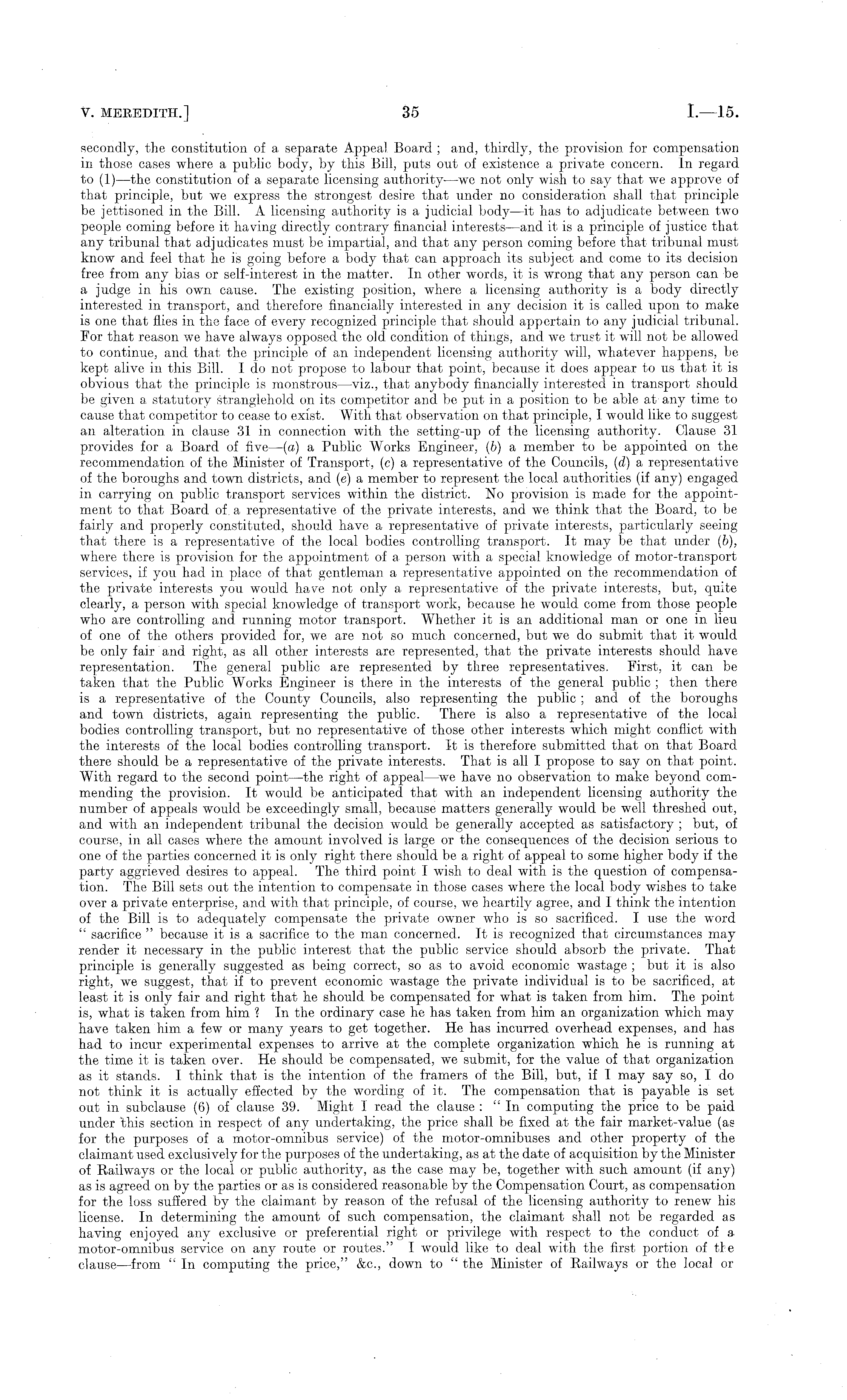 secondly, the constitution of a separate Appeal Board ; and, thirdly, the provision for compensation in those cases where a public body, by this Bill, puts out of existence a private concern. In regard to (1) —the constitution of a separate licensing authority—we not only wish to say that we approve of that principle, but we express the strongest desire that under no consideration shall that principle be jettisoned in the Bill. A licensing authority is a judicial body —it has to, adjudicate between two people coming before it having directly contrary financial interests—and it is a principle of justice that any tribunal that adjudicates must be impartial, and that any person coming before that tribunal must know and feel that he is going before a body that can approach its subject and come to its decision free from any bias or self-interest in the matter. In other words, it is wrong that any person can be a judge in his own cause. The existing position, where a licensing authority is a body directly interested in transport, and therefore financially interested in any decision it is called upon to make is one that flies in the face of every recognized principle that should appertain to any judicial tribunal. For that reason we have always opposed the old condition of things, and we trust it will not be allowed to continue, and that the principle of an independent licensing authority will, whatever happens, be kept alive in this Bill. Ido not propose to labour that point, because it does appear to us that it is obvious that the principle is monstrous —viz., that anybody financially interested in transport should be given a statutory stranglehold on its competitor and be put in a position to be able at any time to cause that competitor to cease to exist. With that observation on that principle, I would like to suggest an alteration in clause 31 in connection with the setting-up of the licensing authority. Clause 31 provides for a Board of five—(a) a Public Works Engineer, (b) a member to be appointed on the recommendation of the Minister of Transport, (c) a representative of the Councils, (d) a representative of the boroughs and town districts, and (e) a member to represent the local authorities (if any) engaged in carrying on public transport services within the district. No provision is made for the appointment to that Board of. a representative of the private interests, and we think that the Board, to be fairly and properly constituted, should have a representative of private interests, particularly seeing that there is a representative of the local bodies controlling transport. It may be that under (b), where there is provision for the appointment of a person with a special knowledge of motor-transport services, if you had in place of that gentleman a representative appointed on the recommendation of the private interests you would have not only a representative of the private interests, but, quite clearly, a person with special knowledge of transport work, because he would come from those people who are controlling and running motor transport. Whether it is an additional man or one in lieu of one of the others provided for, we are not so much concerned, but we do submit that it would be only fair and right, as all other interests are represented, that the private interests should have representation. The general public are represented by three representatives. First, it can be taken that the Public Works Engineer is there in the interests of the general public ; then there is a representative of the County Councils, also representing the public ; and of the boroughs and town districts, again representing the public. There is also a representative of the local bodies controlling transport, but no representative of those other interests which might conflict with the interests of the local bodies controlling transport. It is therefore submitted that on that Board there should be a representative of the private interests. That is all I propose to say on that point. With regard to the second point—the right of appeal —we have no observation to make beyond commending the provision. It would be anticipated that with an independent licensing authority the number of appeals would be exceedingly small, because matters generally would be well threshed out, and with an independent tribunal the decision would be generally accepted as satisfactory ; but, of course, in all cases where the amount involved is large or the consequences of the decision serious to one of the parties concerned it is only right there should be a right of appeal to some higher body if the party aggrieved desires to appeal. The third point I wish to deal with is the question of compensation. The Bill sets out the intention to compensate in those cases where the local body wishes to take over a private enterprise, and with that principle, of course, we heartily agree, and I think the intention of the Bill is to adequately compensate the private owner who is so sacrificed. I use the word " sacrifice " because it is a sacrifice to the man concerned. It is recognized that circumstances may render it necessary in the public interest that the public service should absorb the private. That principle is generally suggested as being correct, so as to avoid economic wastage ; but it is also right, we suggest, that if to prevent economic wastage the private individual is to be sacrificed, at least it is only fair and right that he should be compensated for what is taken from him. The point is, what is taken from him ? In the ordinary case he has taken from him an organization which may have taken him a few or many years to get together. He has incurred overhead expenses, and has had to incur experimental expenses to arrive at the complete organization which he is running at the time it is taken over. He should be compensated, we submit, for the value of that organization as it stands. I think that is the intention of the