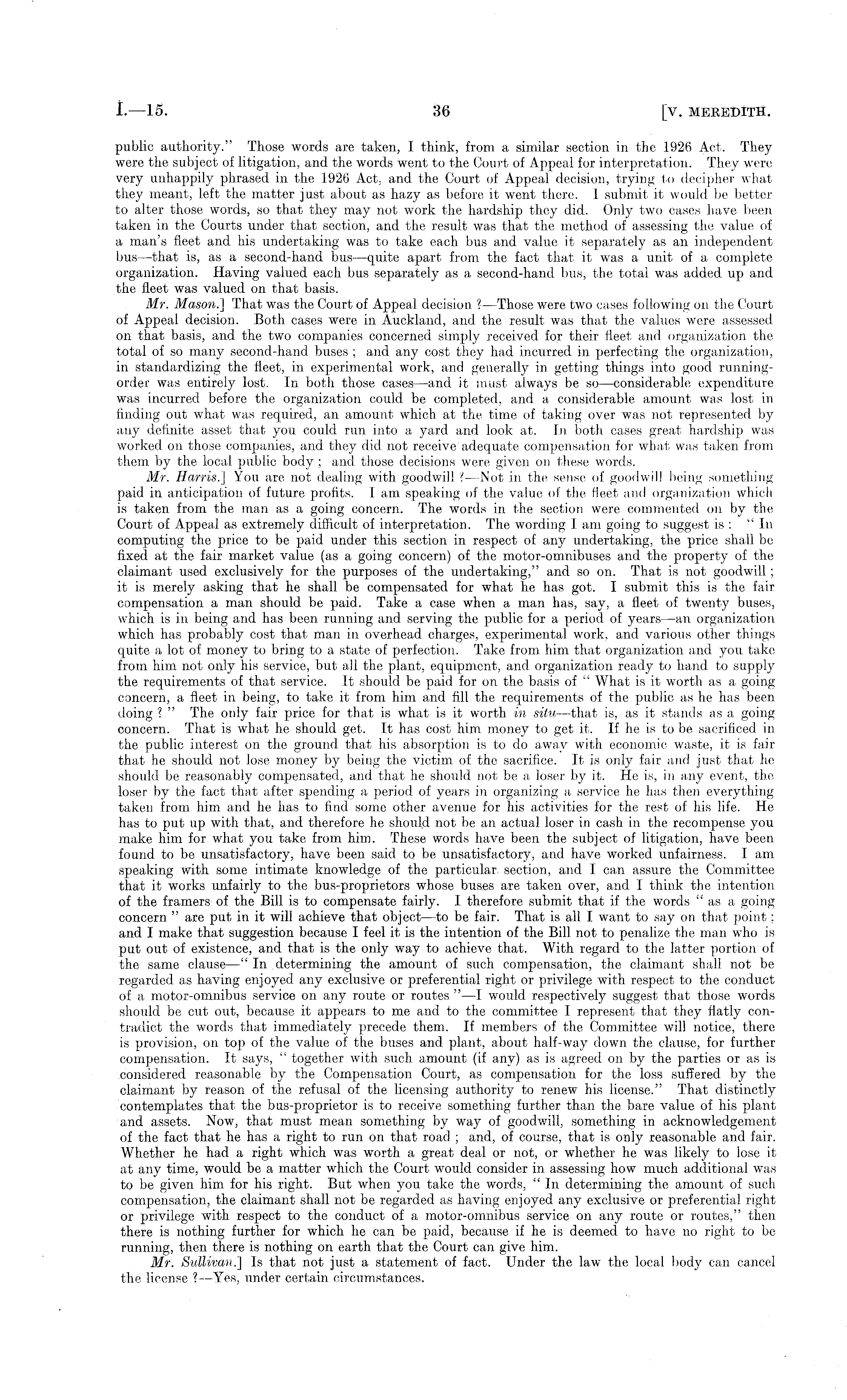 public authority." Those words are taken, I think, from a similar section in the 1926 Act. They were the subject of litigation, and the words went to the Court of Appeal for interpretation. They were very unhappily phrased in the 1926 Act, and the Court of Appeal decision, trying to decipher what they meant, left the matter just about as hazy as before it went there. I submit it would be better to alter those words, so that they may not work the hardship they did. Only two cases have been taken in the Courts under that section, and the result was that the method of assessing the value of a man's fleet and his undertaking was to take each bus and value it separately as an independent bus—that is, as a second-hand bus —quite apart from the fact that it was a unit of a complete organization. Having valued each bus separately as a second-hand bus, the total was added up and the fleet was valued on that basis. Mr. Mason.] That was the Court of Appeal decision ?■ —Those were two cases following on the Court of Appeal decision. Both cases were in Auckland, and the result was that the values were assessed on that basis, and the two companies concerned simply received for their fleet and organization the total of so many second-hand buses ; and any cost they had incurred in perfecting the organization, in standardizing the fleet, in experimental work, and generally in getting things into good runningorder was entirely lost. In both those cases —and it must always be so —considerable expenditure was incurred before the organization could be completed, and a considerable amount was lost in finding out what was required, an amount which at the time of taking over was not represented by any definite asset that you could run into a yard and look at. In both cases great hardship was worked on those companies, and they did not receive adequate compensation for what was taken from them by the local public body ; and those decisions were given on these words. Mr. Harris.] You are not dealing with goodwill ? —Not in the sense of goodwill being something paid in anticipation of future profits. lam speaking of the value of the fleet and organization which is taken from the man as a going concern. The words in the section were , commented on by the Court of Appeal as extremely difficult of interpretation. The wording lam going to suggest is : "In computing the price to be paid under this section in respect of any undertaking, the price shall be fixed at the fair market value (as a going concern) of the motor-omnibuses and the property of the claimant used exclusively for the purposes of the undertaking," and so on. That is not goodwill; it is merely asking that he shall be compensated for what he has got. I submit this is the fair compensation a man should be paid. Take a case when a man has, say, a fleet of twenty buses, which is in being and has been running and serving the public for a period of years—an organization which has probably cost that man in overhead charges, experimental work, and various other things quite a lot of money to bring to a state of perfection. Take from him that organization and you take from him not only his service, but all the plant, equipment, and organization ready to hand to supply the requirements of that service. It should be paid for on the basis of " What is it worth as a going concern, a fleet in being, to take it from him and fill the requirements of the public as he has been doing ? " The only fair price for that is what is it worth in situ—that is, as it stands as a going concern. That is what he should get. It has cost him money to get it. If he is to be sacrificed in the public interest on the ground that his absorption is to do away with economic waste, it is fair that he should not lose money by being the victim of the sacrifice. It is only fair and just that he should be reasonably compensated, and that he should not be a loser by it. He is, in any event, the loser by the fact that after spending a period of years in organizing a service he has then everything taken from him and he has to find some other avenue for his activities for the rest of his life. He has to put up with that, and therefore he should not be an actual loser in cash in the recompense you make him for what you take from him. These words have been the subject of litigation, have been found to be unsatisfactory, have been said to be unsatisfactory, and have worked unfairness, I am speaking with some intimate knowledge of the particular section, and I can assure the Committee that it works unfairly to the bus-proprietors whose buses are taken over, and I think the intention of the framers of the Bill is to compensate fairly. I therefore submit that if the words "as a going concern " are put in it will achieve that object —to be fair. That is all I want to say on that point; and I make that suggestion because I feel it is the intention of the Bill not to penalize the man who is put out of existence, and that is the only way to achieve that. With regard to the latter portion of the same clause —" In determining the amount of such compensation, the claimant shall not be regarded as having enjoyed any exclusive or preferential right or privilege with respect to the conduct of a motor-omnibus service on any route or routes " —I would respectively suggest that those words should be cut out, because it appears to me and to the committee I represent that they flatly contradict the words that immediately precede them. If members of the Committee will notice, there is provision, on top of the value of the buses and plant, about half-way down the clause, for further compensation. It says, " together with such amount (if any) as is agreed on by the parties or as is considered reasonable by the Compensation Court, as compensation for the loss suffered by the claimant by reason of the refusal of the licensing authority to renew his license." That distinctly contemplates that the bus-pro