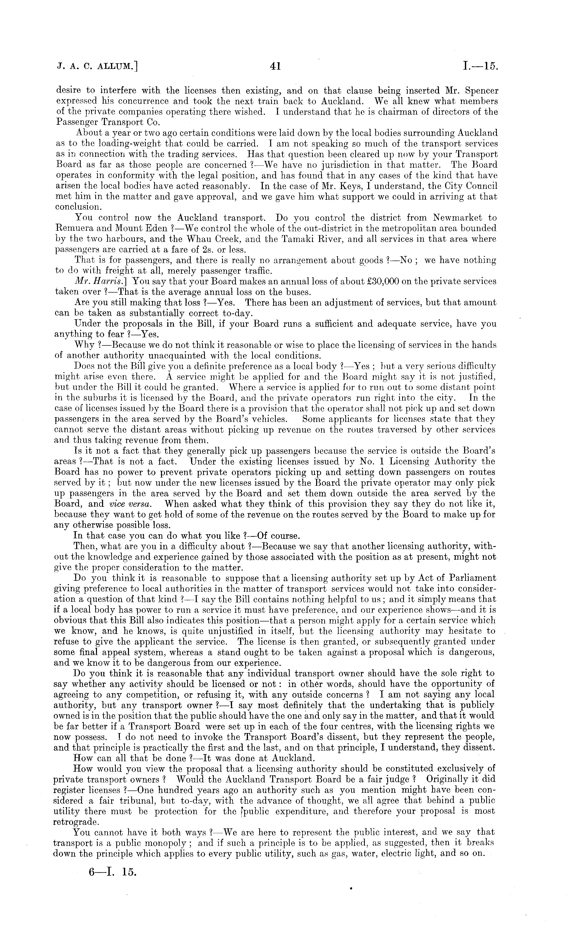 desire to interfere with the licenses then existing, and on that clause being inserted Mr. Spencer expressed his concurrence and took the next train back to Auckland. We all knew what members of the private companies operating there wished. I understand that he is chairman of directors of the Passenger Transport Co. About a year or two ago certain conditions were laid down by the local bodies surrounding Auckland as to the loading-weight that could be carried. lam not speaking so much of the transport services as in connection with the trading services. Has that question been cleared up now by your Transport Board as far as those people are concerned ? —We have no jurisdiction in that matter. The Board operates in conformity with the legal position, and has found that in any cases of the kind that have arisen the local bodies have acted reasonably. In the case of Mr. Keys, I understand, the City Council met him in the matter and gave approval, and we gave him what support we could in arriving at that conclusion. You control now the Auckland transport. Do you control the district from Newmarket to Remuera and Mount Eden. ? —We control the whole of the out-district in the metropolitan area bounded by the two harbours, and the Whau Creek, and the Tamaki River, and all services in that area where passengers are carried at a fare of 2s. or less. That is for passengers, and there is really no arrangement about goods ? —No ; we have nothing to do with freight at all, merely passenger traffic. Mr. Harris.'] You say that your Board makes an annual loss of about £30,000 on the private services taken over ? —That is the average annual loss on the buses. Are you still making that loss ?—Yes. There has been an adjustment of services, but that amount can be taken as substantially correct to-day. Under the proposals in the Bill, if your Board runs a sufficient and adequate service, have you anything to fear ? —Yes. Why ?—Because we do not think it reasonable or wise to place the licensing of services in the hands of another authority unacquainted with the local conditions. Does not the Bill give you a definite preference as a local body ? —Yes ; but a very serious difficulty might arise even there. A service might be applied for and the Board might say it is not justified, but under the Bill it could be granted. Where a service is applied for to run out to some distant point in the suburbs it is licensed by the Board, and the private operators run right into the city. In the case of licenses issued by the Board there is a provision that the operator shall not pick up and set down passengers in the area served by the Board's vehicles. Some applicants for licenses state that they cannot serve the distant areas without picking up revenue on the routes traversed by other services and thus taking revenue from them. Is it not a fact that they generally pick up passengers because the service is outside the Board's areas ?—That is not a fact. Under the existing licenses issued by No. 1 Licensing Authority the Board has no power to prevent private operators picking up and setting down passengers on routes served by it; but now under the new licenses issued by the Board the private operator may only pick up passengers in the area served by the Board and set them down outside the area served by the Board, and vice versa. When asked what they think of this provision they say they do not like it, because they want to get hold of some of the revenue on the routes served by the Board to make up for any otherwise possible loss. In that case you can do what you like ?—Of course. Then, what are you in a difficulty about ? —Because we say that another licensing authority, without the knowledge and experience gained by those associated with the position as at present, might not give the proper consideration to the matter. Do you think it is reasonable to suppose that a licensing authority set up by Act of Parliament giving preference to local authorities in the matter of transport services would not take into consideration a question of that kind ? —I say the Bill contains nothing helpful to us ; and it simply means that if a local body has power to run a service it must have preference, and our experience shows—and it is obvious that this Bill also indicates this position—that a person might apply for a certain service which we know, and he knows, is quite unjustified in itself, but the licensing authority may hesitate to refuse to give the applicant the service. The license is then granted, or subsequently granted under some final appeal system, whereas a stand ought to be taken against a proposal which is dangerous, and we know it to be dangerous from our experience. Do you think it is reasonable that any individual transport owner should have the sole right to say whether any activity should be licensed or not: in other words, should have the opportunity of agreeing to any competition, or refusing it, with any outside concerns ? lam not saying any local authority, but any transport owner ? —I say most definitely that the undertaking that is publicly owned is in the position that the public should have the one and only say in the matter, and that it would be far better if a Transport Board were set up in each of the four centres, with the licensing rights we now possess. Ido not need to invoke the Transport Board's dissent, but they represent the people, and that principle is practically the first and the last, and on that principle, I understand, they dissent. How can all that be done ? —lt was done at Auckland. How would you view the proposal that a licensing authority should be constituted exclusively of private transport owners ? Would the Auckland Transport Board be a fair judge ? Originally it did register licenses ?—One hundred years ago an authority such as you mention might have been considered a fair tribunal, but to-day, with the advance of thought, we all agree that behind