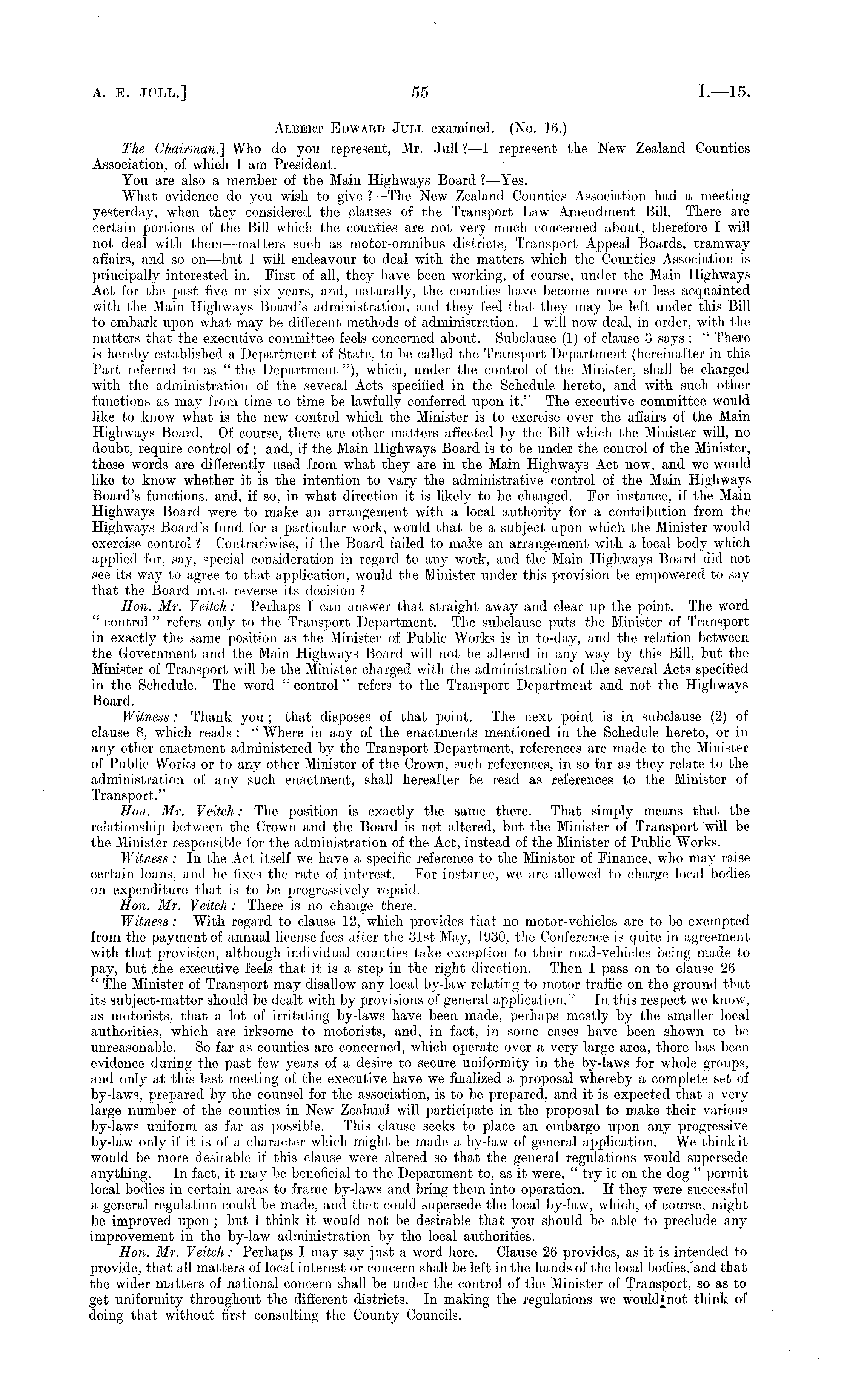 Albert Edward Jull examined. (No. 16.) The Chairman.] Who do you represent, Mr. Jull ? —I represent the New Zealand Counties Association, of which I am President. You are also a member of the Main Highways Board ? —Yes. What evidence do you wish to give ? —The New Zealand Counties Association had a meeting yesterday, when they considered the clauses of the Transport Law Amendment Bill. There are certain portions of the Bill which the counties are not very much concerned about, therefore I will not deal with them —matters such as motor-omnibus districts, Transport Appeal Boards, tramway affairs, and so on —but I will endeavour to deal with the matters which the Counties Association is principally interested in. First of all, they have been working, of course, under the Main Highways Act for the past five or six years, and, naturally, the counties have become more or less acquainted with the Main Highways Board's administration, and they feel that they may be left under this Bill to embark upon what may be different methods of administration. I will now deal, in order, with the matters that the executive committee feels concerned about. Subclause (1) of clause 3 says : " There is hereby established a Department of State, to be called the Transport Department (hereinafter in this Part referred to as " the Department "), which, under the control of the Minister, shall be charged with the administration of the several Acts specified in the Schedule hereto, and with such other functions as may from, time to time be lawfully conferred upon it." The executive committee would like to know what is the new control which the Minister is to exercise over the affairs of the Main Highways Board. Of course, there are other matters affected by the Bill which the Minister will, no doubt, require control of ; and, if the Main Highways Board is to be under the control of the Minister, these words are differently used from what they are in the Main Highways Act now, and we would like to know whether it is the intention to vary the administrative control of the Main Highways Board's functions, and, if so, in what direction it is likely to be changed. For instance, if the Main Highways Board were to make an arrangement with a local authority for a contribution from the Highways Board's fund for a particular work, would that be a subject upon which the Minister would exercise control ? Contrariwise, if the Board failed to make an arrangement with a local body which applied for, say, special consideration in regard to any work, and the Main Highways Board did not see its way to agree to that application, would the Minister under this provision be empowered to say that the Board must reverse its decision ? Hon. Mr. Veitch : Perhaps I can answer that straight away and clear up the point. The word " control " refers only to the Transport Department. The subclause puts the Minister of Transport in exactly the same position as the Minister of Public Works is in to-day, and the relation between the Government and the Main Highways Board will not be altered in any way by this Bill, but the Minister of Transport will be the Minister charged with the administration of the several Acts specified in the Schedule. The word " control " refers to the Transport Department and not the Highways Board. Witness: Thank you; that disposes of that point. The next point is in subclause (2) of clause 8, which reads : " Where in any of the enactments mentioned, in the Schedule hereto, or in any other enactment administered by the Transport Department, references are made to the Minister of Public Works or to any other Minister of the Crown, such references, in so far as they relate to the administration of any such enactment, shall hereafter be read as references to the Minister of Transport." Hon. Mr. Veitch: The position is exactly the same there. That simply means that the relationship between the Crown and the Board is not altered, but the Minister of Transport will be the Minister responsible for the administration of the Act, instead of the Minister of Public Works. Witness : In the Act itself we have a specific reference to the Minister of Finance, who may raise certain loans, and he fixes the rate of interest. For instance, we are allowed to charge local bodies on expenditure that is to be progressively repaid. Hon. Mr. Veitch : There is no change there. Witness: With regard to clause 12, which provides that no motor-vehicles are to be exempted from the payment of annual license fees after the 31st May, 1930, the Conference is quite in agreement with that provision, although individual counties take exception to their road-vehicles being made to pay, but the executive feels that it is a step in the right direction. Then I pass on to clause 26 — " The Minister of Transport may disallow any local by-law relating to motor traffic on the ground that its subject-matter should be dealt with by provisions of general application." In this respect we know, as motorists, that a lot of irritating by-laws have been made, perhaps mostly by the smaller local authorities, which are irksome to motorists, and, in fact, in some cases have been shown to be unreasonable. So far as counties are concerned, which operate over a very large area, there has been evidence during the past few years of a desire to secure uniformity in the by-laws for whole groups, and only at this last meeting of the executive have we finalized a proposal whereby a complete set of by-laws, prepared by the counsel for the association, is to be prepared, and it is expected that a very large number of the counties in New Zealand will participate in the proposal to make their various by-laws uniform as far as possible. This clause seeks to place an embargo upon any progressive by-law only if it is of a character which might be made a by-law of general application. We think it would be more desirable if this clause were altered so that the general regulations would s