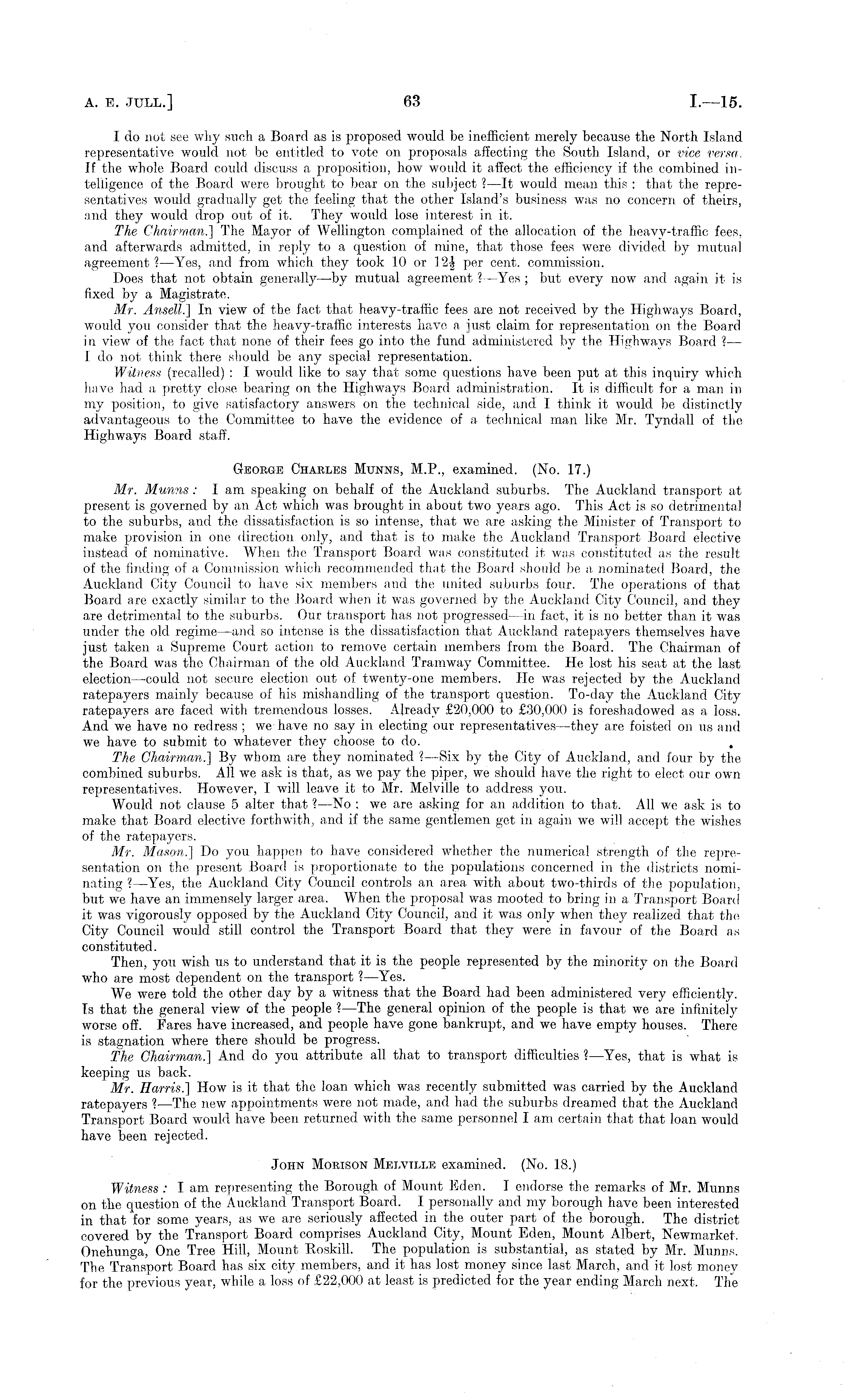 I do not see why such a Board as is proposed would be inefficient merely because the North Island representative would not be entitled to vote on proposals affecting the South Island, or vice versa. If the whole Board could discuss a proposition, how would it affect the efficiency if the combined intelligence of the Board were brought to bear on the subject ? —lt would mean this : that the representatives would gradually get the feeling that the other Island's business was no concern of theirs, and they would drop out of it. They would lose interest in it. The Chairman.] The Mayor of Wellington complained of the allocation of the heavy-traffic fees, and afterwards admitted, in reply to a question of mine, that those fees were divided by mutual agreement ? —Yes, and from which they took 10 or 12| per cent, commission. Does that not obtain generally—by mutual agreement ? —Yes ; but every now and again it is fixed by a Magistrate. Mr. Ansell.] In view of the fact that heavy-traffic fees are not received by the Highways Board, would you consider that the heavy-traffic interests have a just claim for representation on the Board in view of the fact that none of their fees go into the fund administered by the Highways Board ? — I do not think there should be any special representation. Witness (recalled) : I would like to say that some questions have been put at this inquiry which have had a pretty close bearing on the Highways Board administration. It is difficult for a man in my position, to give satisfactory answers on the technical side, and I think it would be distinctly advantageous to the Committee to have the evidence of a technical man like Mr. Tyndall of the Highways Board staff. George Chables Munns, M.P., examined. (No. 17.) Mr. Munns : lam speaking on behalf of the Auckland suburbs. The Auckland transport at present is governed by an Act which was brought in about two years ago. This Act is so detrimental to the suburbs, and the dissatisfaction is so intense, that we are asking the Minister of Transport to make provision in one direction only, and that is to make the Auckland Transport Board elective instead of nominative. When the Transport Board was constituted it was constituted as the result of the finding of a Commission which recommended that the Board should be a nominated Board, the Auckland City Council to have six members and the united suburbs four. The operations of that Board are exactly similar to the Board when it was governed by the Auckland City Council, and they are detrimental to the suburbs. Our transport has not progressed—in fact, it is no better than it was under the old regime—and so intense is the dissatisfaction that Auckland ratepayers themselves have just taken a Supreme Court action to remove certain members from the Board. The Chairman of the Board was the Chairman of the old Auckland Tramway Committee. He lost his seat at the last election —could not secure election out of twenty-one members. He was rejected by the Auckland ratepayers mainly because of his mishandling of the transport question. To-day the Auckland City ratepayers are faced with tremendous losses. Already £20,000 to £30,000 is foreshadowed as a loss. And we have no redress ; we have no say in electing our representatives—they are foisted on us and we have to submit to whatever they choose to do. The Chairman.'] By whom, are they nominated ? —Six by the City of Auckland, and four by the combined suburbs. All we ask is that, as we pay the piper, we should have the right to elect our own representatives. However, I will leave it to Mr. Melville to address you. Would not clause 5 alter that ? —No : we are asking for an addition to that. All we ask is to make that Board elective forthwith, and if the same gentlemen get in again we will accept the wishes of the ratepayers. Mr. Mason.] Do you happen to have considered whether the numerical strength of the representation on the present Board is proportionate to the populations concerned in the districts nominating ?—Yes, the Auckland City Council controls an area with about two-thirds of the population, but we have an immensely larger area. When the proposal was mooted to bring in a Transport Board it was vigorously opposed by the Auckland City Council, and it was only when they realized that the City Council would still control the Transport Board that they were in favour of the Board as constituted. Then, you wish us to understand that it is the people represented by the minority on the Board who are most dependent on the transport ? —Yes. We were told the other day by a witness that the Board had been administered very efficiently. Is that the general view of the people ? —The general opinion of the people is that we are infinitely worse off. Fares have increased, and people have gone bankrupt, and we have empty houses. There is stagnation where there should be progress. The Chairman.] And do you attribute all that to transport difficulties ? —Yes, that is what is keeping us back. Mr. Harris.] How is it that the loan which was recently submitted was carried by the Auckland ratepayers ? —The new appointments were not made, and had the suburbs dreamed that the Auckland Transport Board would have been returned with the same personnel I am certain that that loan would have been rejected. John Mobison Melville examined. (No. 18.) Witness : lam representing the Borough of Mount Eden. I endorse the remarks of Mr. Munns on the question of the Auckland Transport Board. I personally and my borough have been interested in that for some years, as we are seriously affected in the outer part of the borough. The district covered by the Transport Board comprises Auckland City, Mount Eden, Mount Albert, Newmarket. Onehunga, One Tree Hill, Mount Roskill. The population is substantial, as stated by Mr. Munns. The Transport Board has six city members, and it has lost money since last March, and it lost money for the previous y